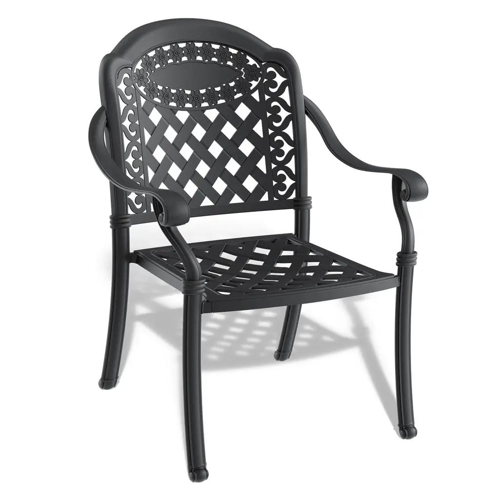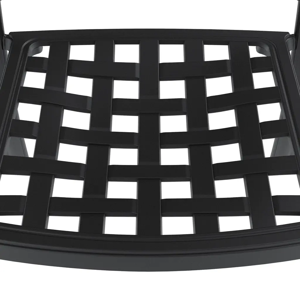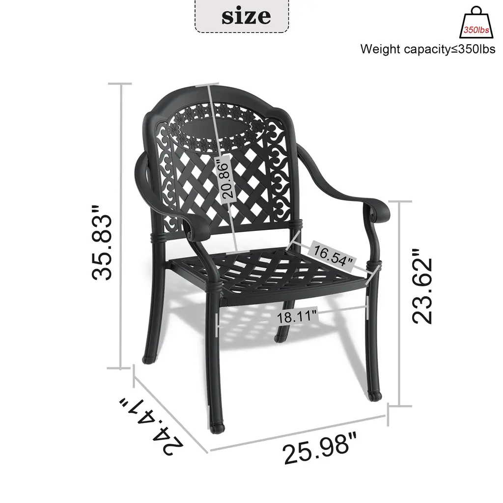 FeaturesDetails:Product Type: Cast Aluminum Patio Dining Chair Color: Black Outer Frame Material: Aluminum Weight Capacity:350lbs Cushions Included:Yes Number of Cushions Included:2 Cushion Dimensions 1.97'' H X 17.32'' D X 18.11'' W Product Dimensions& Weight 35.83'' H X 25.6'' W X 24.41'' D , 17.66lbs Package Dimensions& Weight 11.02'' H X 21.06'' W X 24.21'' D , 39.60lbs Assembly Required: Yes Additional Tools Required All tools included