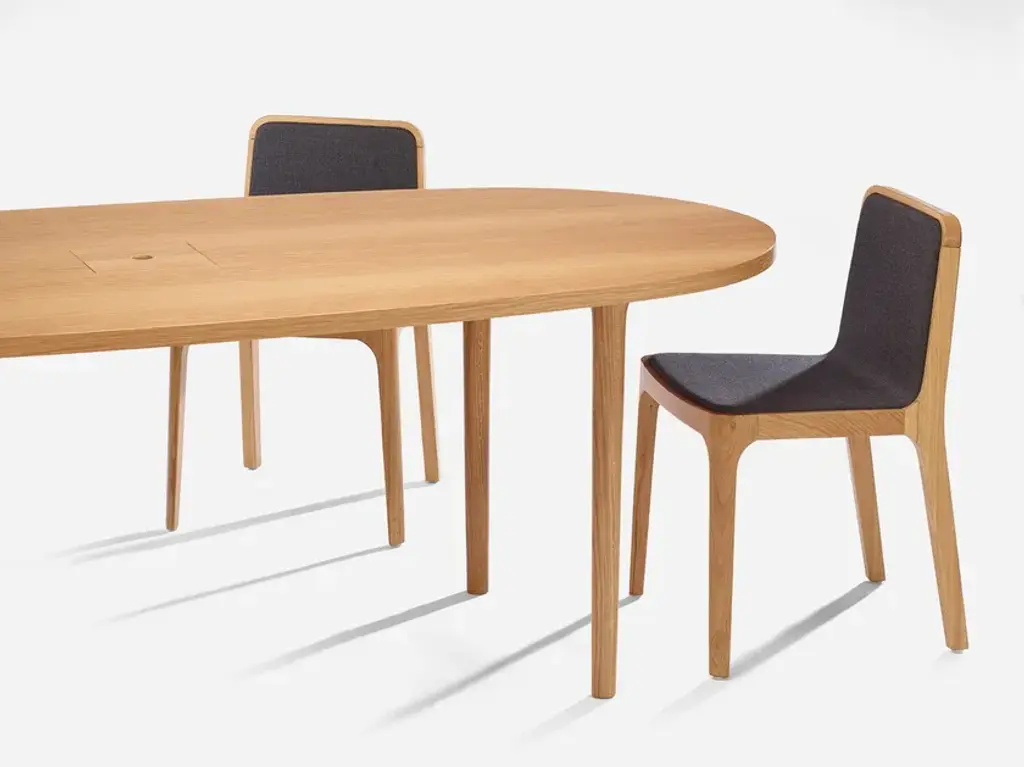 Cast is a dining chair combines a oak wood frame with a fabric-upholstered seat for added comfort. Featuring a clean silhouette and smooth tactile contrast, it suits dining rooms or workspaces with a design-led focus. Made in Portugal with expert joinery and durable upholsteryCast is a very adaptable piece that arises from the ambition of creating a simple chair based on two premises: it could fit any nice table and was to be manufactured in solid wood. It is a sturdy piece whose structure is ingeniously determined by the seat itself, giving it a classic and versatile look. Whether you have it in your house at the dining table, in a restaurant or at a hotel room, this chair will stand the test of time for its classic beauty and timeless aesthetic. The chair is available in various kinds of wood – beech, ash, oak and walnut – and can be upholstered in fabric or leather.