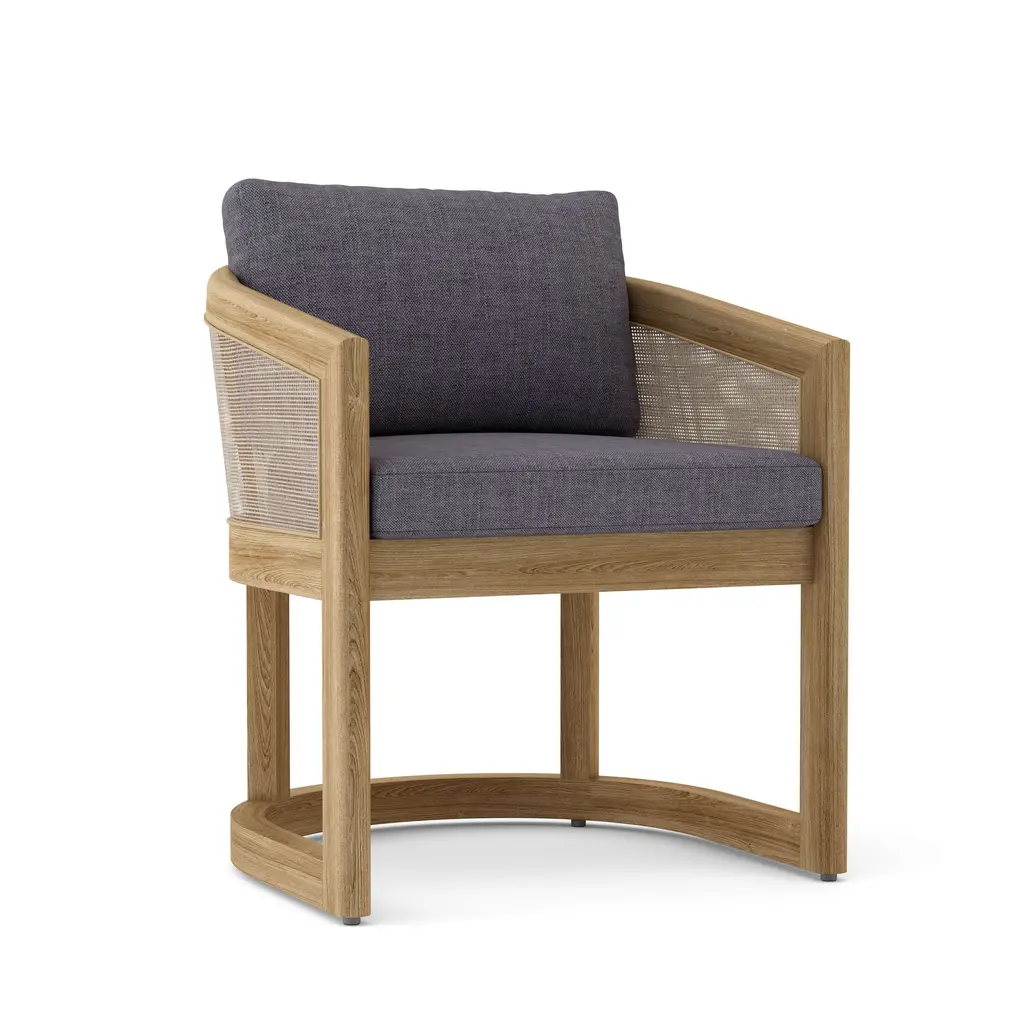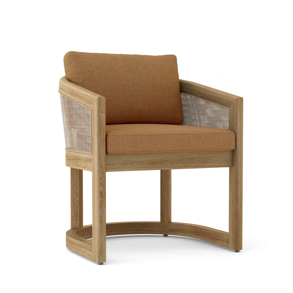 Expertly crafted and shaped to exquisite design the Catania Dining Armchair made of premium solid unfinished teak and synthetic rattan is the perfect dining armchair for outdoor use. Featuring 2 ½" thick cushions from Sunbrella Fabrics, take a seat in comfort and lean back, as you dine and enjoy the outdoors. Pairs perfectly with the Catania Dining Table or Catania Extension Dining Table.
