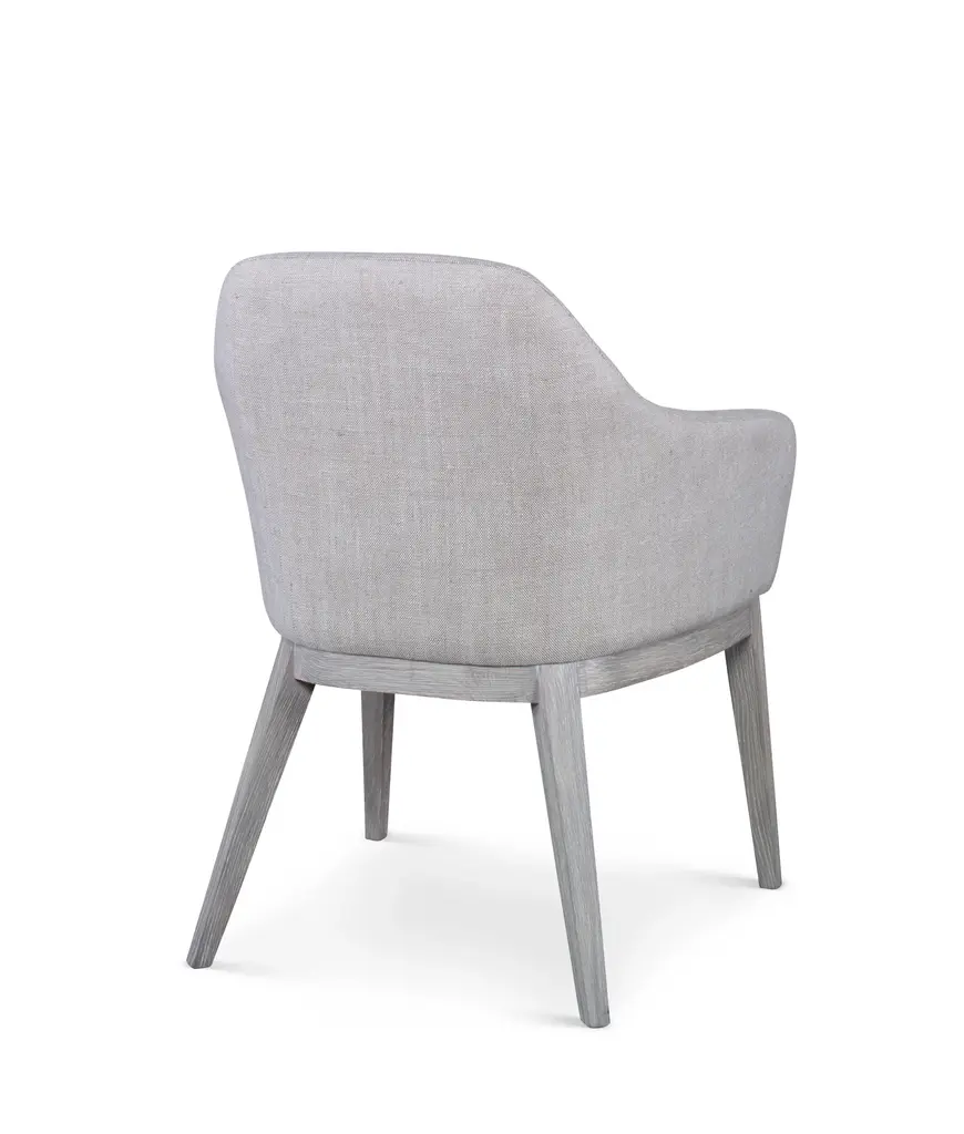 This piece is available only as shown, and will ship in 2-3 weeks. An elegant dining arm chair crafted of Grey Oak finished oak solids with textured linen upholstery. Welcome to Monarch Fine Furniture for Century. This amazing collection of English reproductions features a variety of old world techniques including fine marquetry, églomisé, and gesso. These eclectic designs are the perfect accent to any room.