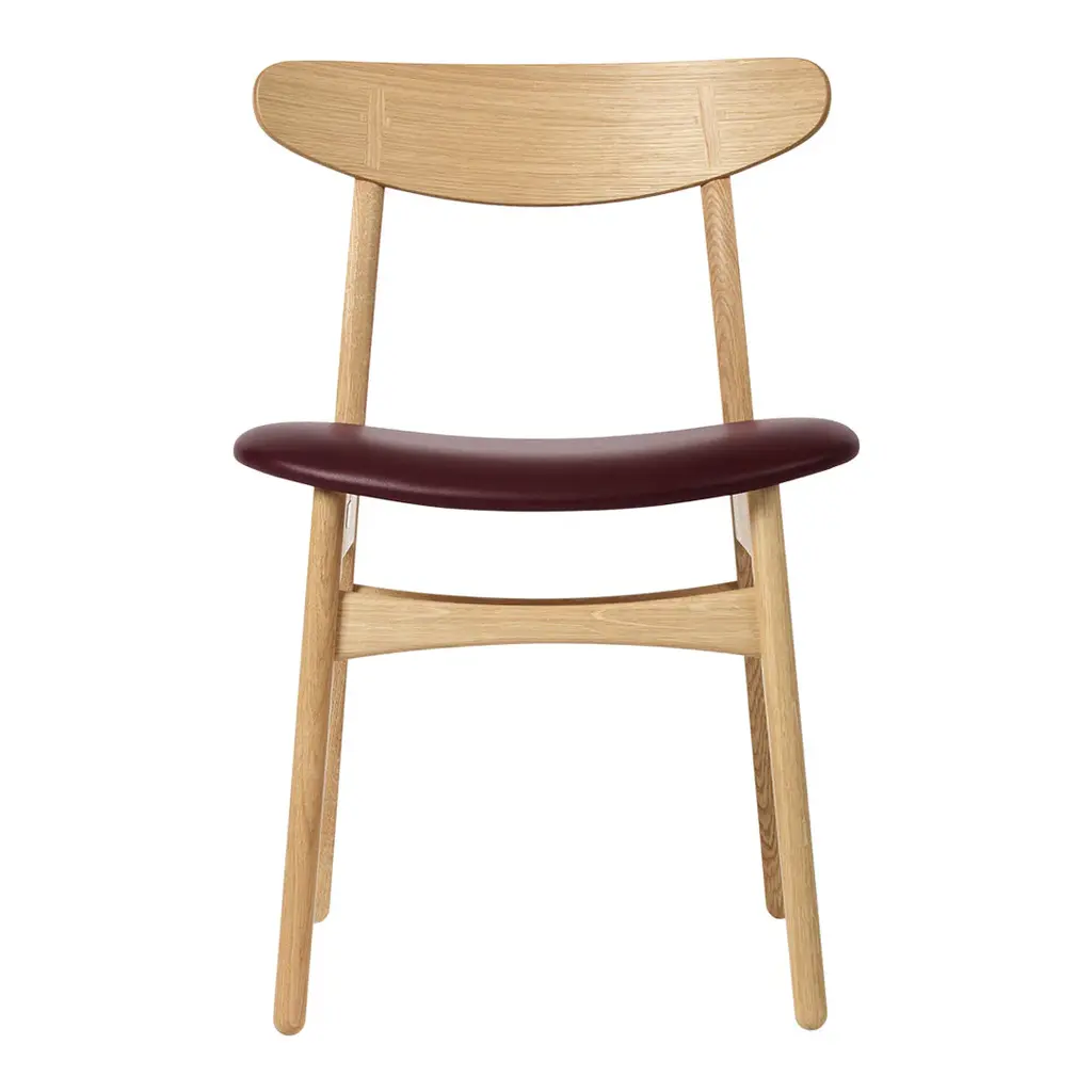 Hans J. Wegner presented the CH30 chair in 1954 and the harmonious design embodies his ongoing journey to design the perfect chair. The CH30 dining chair showcases Wegner's signature style: His organic design and exceptional craftsmanship can be seen in sophisticated details such as the cruciform cover caps on the curved, oval backrest that pitches back in line with the rear legs to achieve ultimate comfort. Combined with the wide, form-pressed padded seat it makes for a chair with a high level of comfort and functionality. As the highly comfortable chair can be tucked under a table, it only takes up limited space which makes it ideal for any modern context. Having been out of production for a number of years, the chair is recreated in close collaboration with Hans J. Wegner's Design Studio. The elegant CH30 chair is produced according to his original working drawing, an extra two centimeters have been added in height to accommodate modern standards.