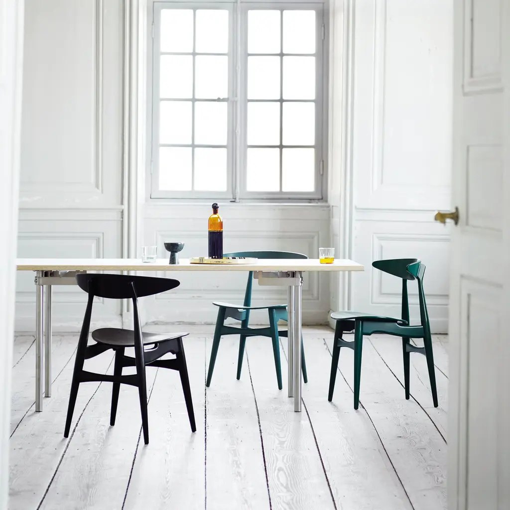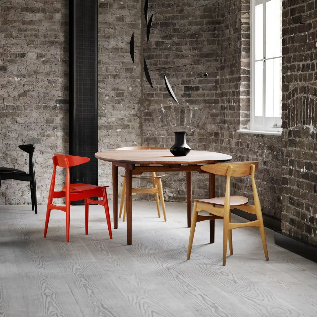 First appearing in 1957, Hans J. Wagner's iconic dining chair endures with its combination of great comfort and everyday stability. CH33T is a classic design that remains fresh despite its familiar Midcentury references. Carl Hansen & Søn applies its superb craftsmanship to versions of the seating in oak, walnut or beech as well as mixed oak and walnut styles. Numerous finish options are on offer as well, with natural, soaped, oiled and lacquered treatments available.