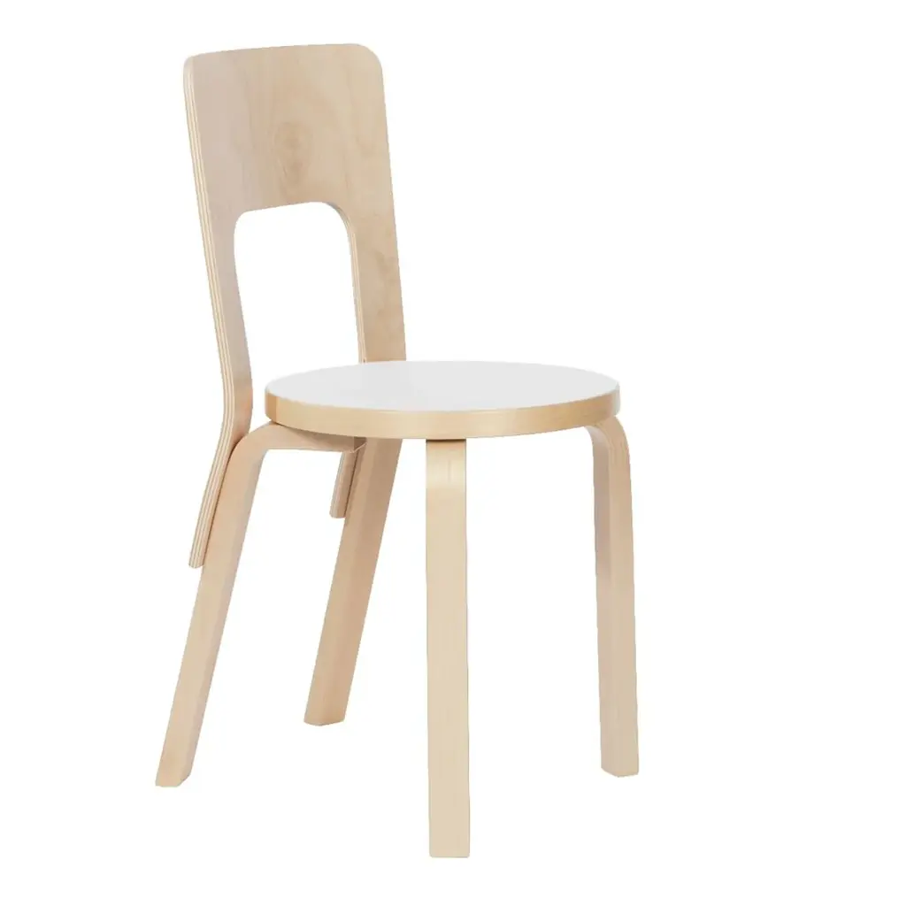 Chair 66 is a universal wooden chair in the tradition of classic kitchen and cafe chairs its visible, additive construction logic is full of character and pleasing to the eye. The wide backrest offers comfort and flexibility, while the Finnish birch used to make the chair is both durable and lightweight. With its handle-like seat back, Chair 66 is easy to move wherever it is needed. Available in a variety of colours and finishes.