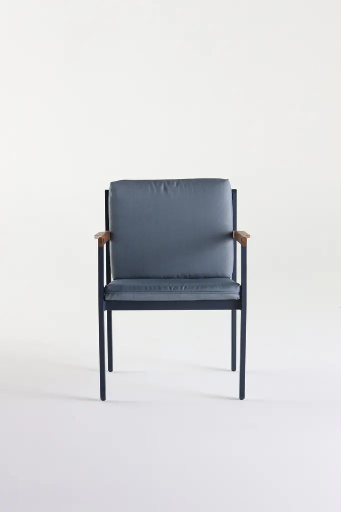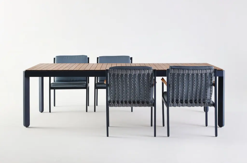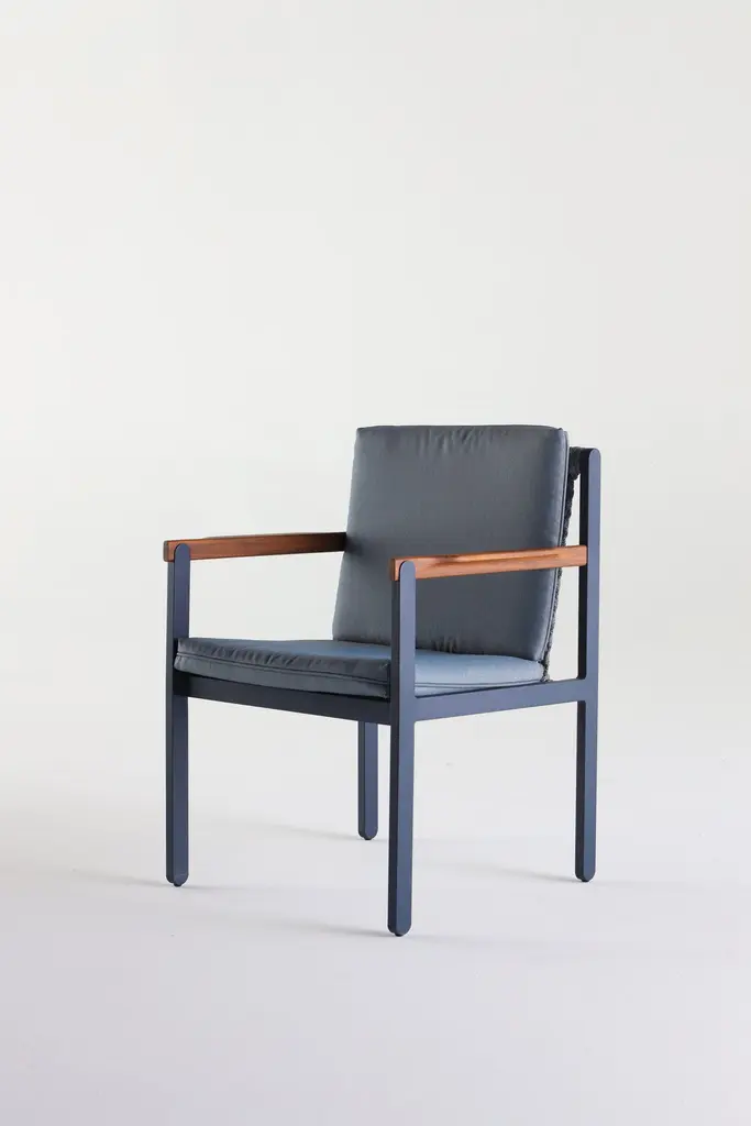 FENCE COLLECTION CONCEPT The “Fence” collection concept is inspired by the countryside elements that are part of the daily life, to create this premium outdoor collection the main question asked was how to translate this basic elements in to interesting design solutions. In the project development journey we have chosen the silhouette from a regular fence object and started modelling the metal structure to hold a solid wood, outdoor ready arm. This union of “high low” is made possible using military grade aluminum that is milled from a solid block to obtain a seamless union, a breathing room for the wood is left, so it can adapt to most variety kinds of climates.The metal and solid wood structure are used together with a unique nautical hope that combines two types of sections to create a unique detail that is tangled together, and mounted in the structure to hold the upholstery. On the proportion side the objective was to use abundant upholstery elements studied in detail to have well-defined ergonomics that are a joy to use and invite users to experience pleasure and hours of use without compromises, balancing design and function to obtain a unique collection that uses premium material for the outdoors or an alternative to indoors.As most of our collection this line accepts COM, and we offer a wide variety of textiles, metal finishes, colors of rope and two woods, the sofas and tables may be customized in size, and we offer all modules to layout so it fits your next high-end project.In the case of COM we need to receive the materials in our facility.This collection is composed of, armchairs, sofas that may be customized in sizes, and its modules, coffee / center tables, dining chairs and dining tables.CHAIRS DESIGN CONCEPTWe have developed dining chairs that carry the came esthetical concept as the armchairs, where we have studied the proportions to provide full comport on the usage and design presence. The arms are wider and flow in an organic motion to provide better placement for the users with a dedicated touch in the graphical solution, the wood merges to the frame profile using a solid military grate aluminum block that is carved to fix this two distinct materials together. The back support is done using the flexibility from the rope so where is motion and elasticity to provide a superior experience that is enhanced by the use of foam and textiles.