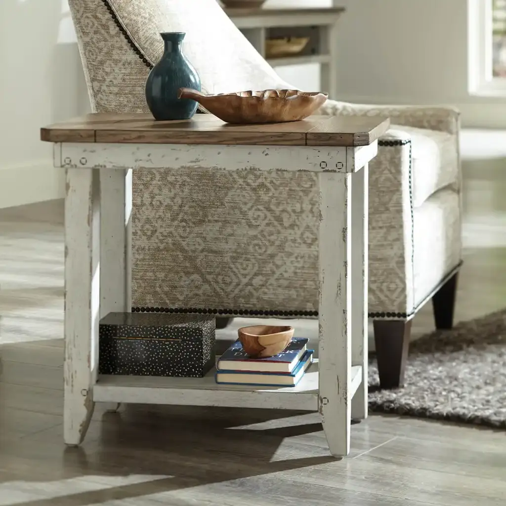 The Chairside Table from the Chambers collection embraces rustic farmhouse charm with thoughtful craftsmanship. Crafted from white oak veneers, it features a chalk white finish contrasted by a medium brown top, creating a warm, inviting aesthetic. The lower shelf provides convenient storage, while exposed joinery, including square peg-in-round-hole detailing, reinforces its primitive character and structural integrity. With generous proportions and a distressed finish, this piece offers a perfect balance of vintage appeal and everyday functionality.