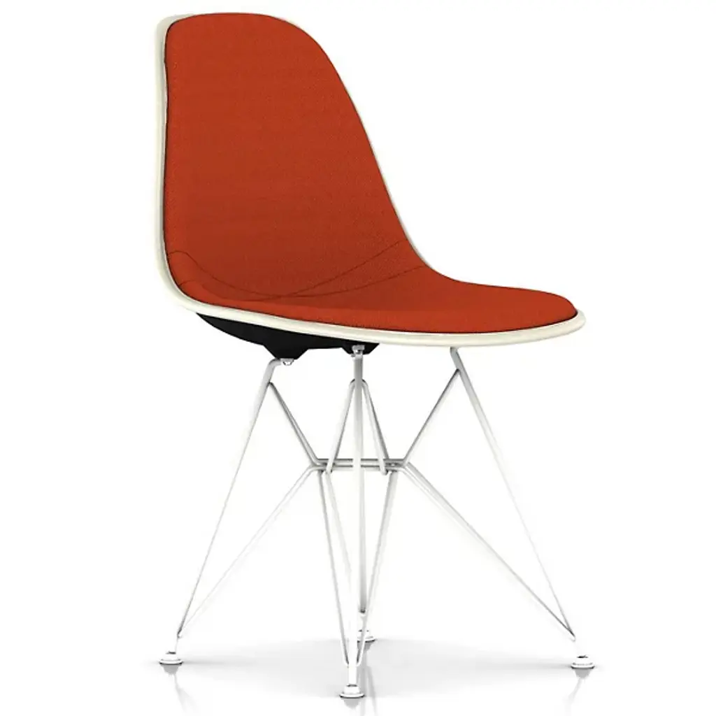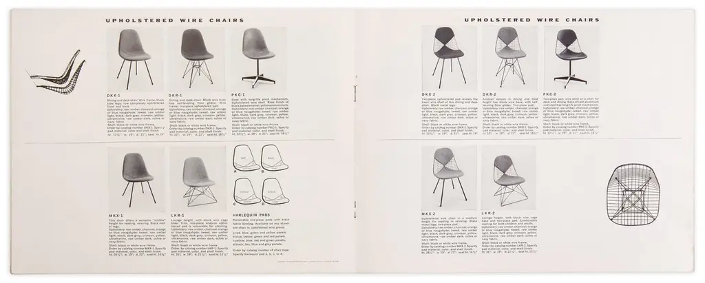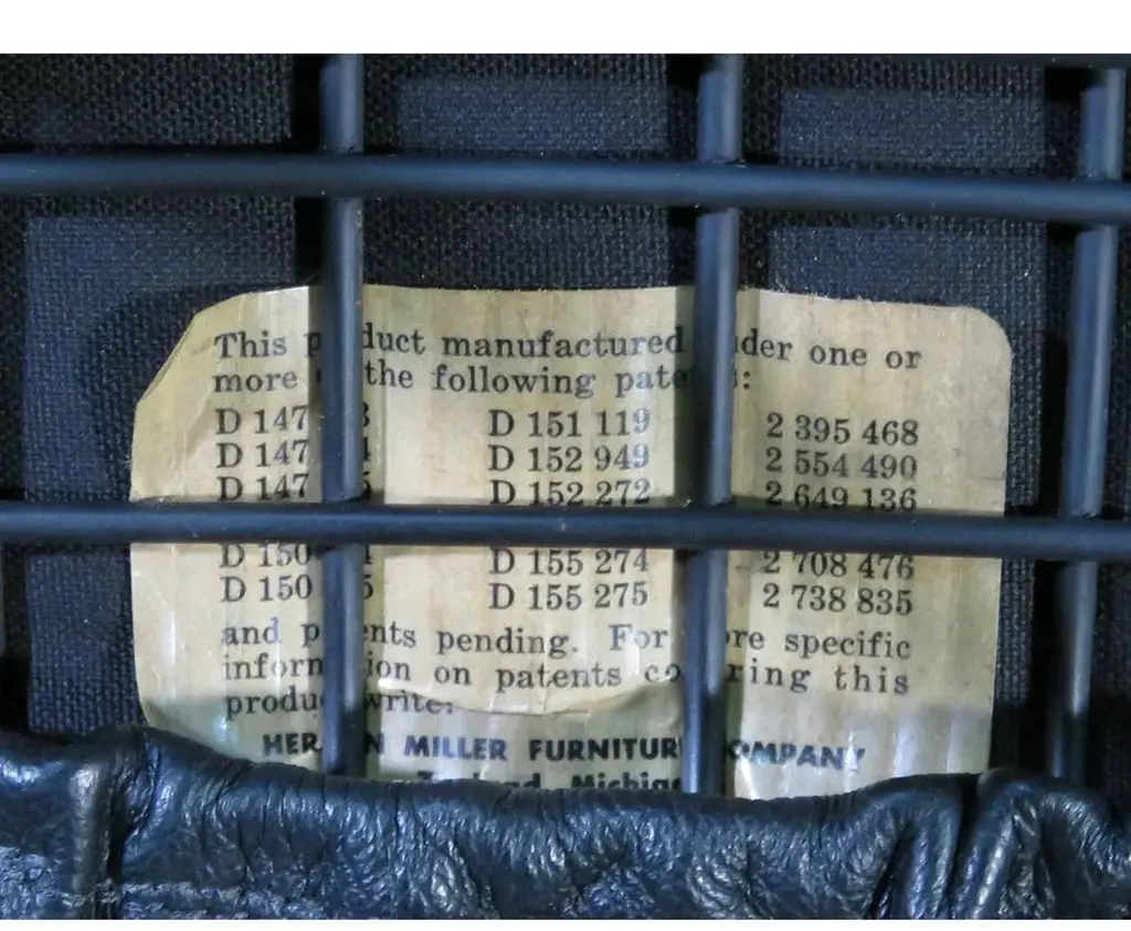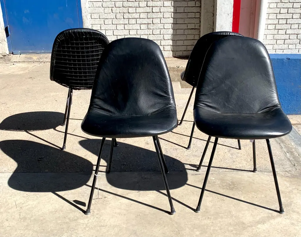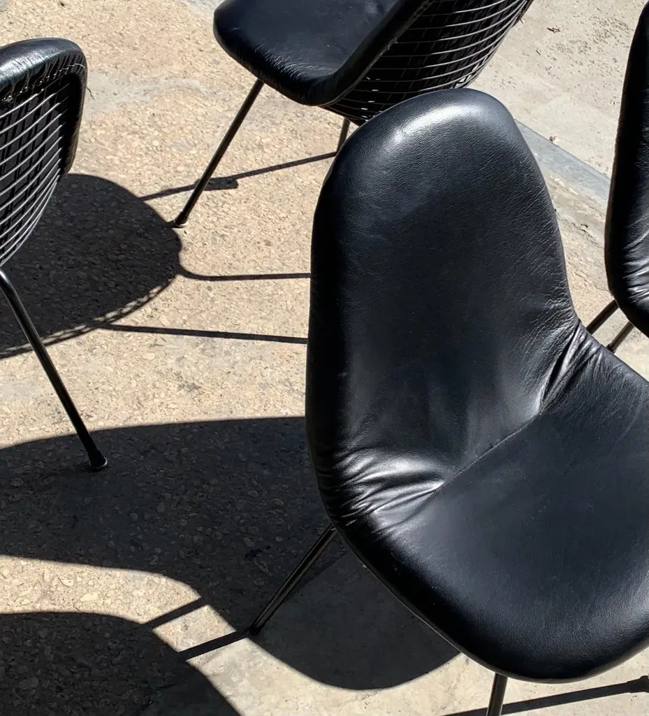 Charles and Ray Eames for Herman Miller DKX-1 chair, black leather, H-base, circa 1954, Boot glides .Pricing is per chair. Please change quantity to 4 to purchase entire set.The abbreviated Eames DKX chair, part of the Wire Mesh Series, stood for Dining (D) height, K-Wire (K) chair on X-base (X). As with all the mesh series, the numbers represented the upholstery cut, with 1 meaning the full chair cover and 2 the two-part ‘bikini’ version.The X in the name of the DKX, LKX and MKX stands for the X-base, an original patterned base with a clear criss-cross where the base joins the top. This base was developed for the plastic series and was later utilized for the wire mesh chairs. The X-base was replaced in 1954 for the lighter and more versatile ‘H Base’ but for the sake of continuity the X in the name stayed, even to this day with the later re-launch.The countless welds on the Eames DKX side chair were done with what is known as resistance welding. This works by passing electric current through the metal until it gets so hot it bonds any connecting adjacent metal wires. This is why repaired welds done manually can often be easily seen and less likely to appear as clean as the original.The early DKX chairs were only available in black with black leather covers. Other finishes and colors were available much later into the 1960s before the entire wire (K) range is discontinued in 1967. Original labels were included on the upholstery cover. The early original DKX had boot slides as seen on these chairs which date them to between 1955-1958. In 1958, Herman Miller switched over to the screw in, self leveling nylon slides that are still in use today.