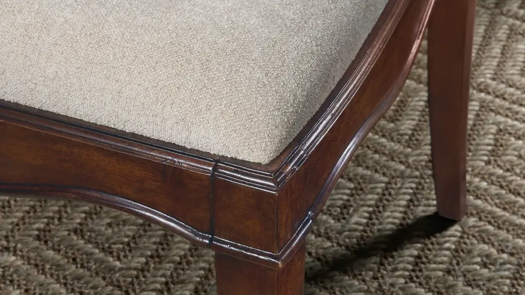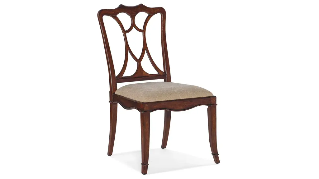 Timeless, warm and inviting, the Charleston Side Chair (set of 2) with an upholstered seat is the essence of gracious living. The chair has a wood splatback and fretwork design with a rolled claw arm and scalloped apron. The Maraschino Cherry finish uses natural grain Cherry veneers and showcases the dramatic cathedral pattern with the selective inclusion of naturally-occurring knots to deliver a rich warm cherry finish and smooth sophisticated aesthetic. The seat is upholstered in a sand-colored fabric.