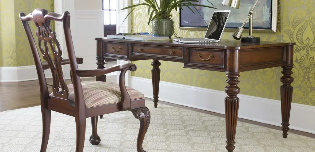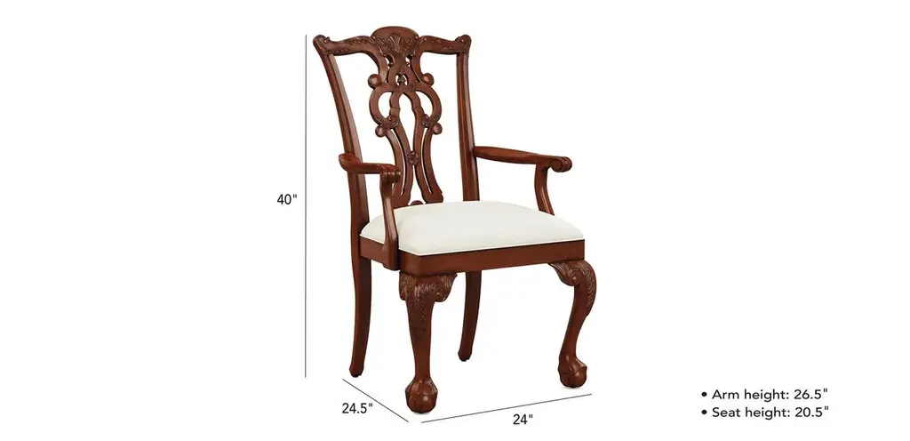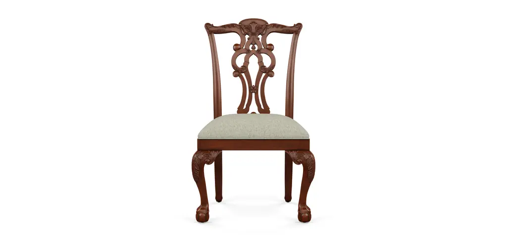 The Chippendale gets a facelift. Intricate rococo carvings climb the back rails and dress the substantial front cabriole legs of the Chauncey chair. Georgian shell and acanthus leaf scrolling fretwork liberate this version from its traditional roots.