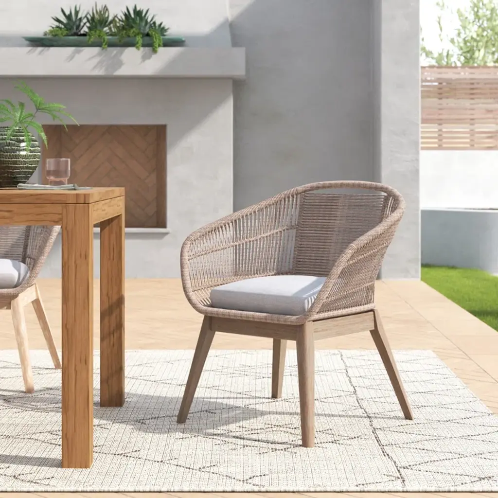 Elevate your patio gatherings with these dining chairs. Crafted from weather-resilient eucalyptus, the frame showcases flared and slightly tapered legs in a warm brown hue. The rope-wrapped seat and back lend an airy, textured appeal to your outdoor space. The foam-filled seat cushion, in your preferred color, promises a plush landing spot. Mix and match these chairs with your existing table, or let them inspire an entirely new outdoor dining set-up.
