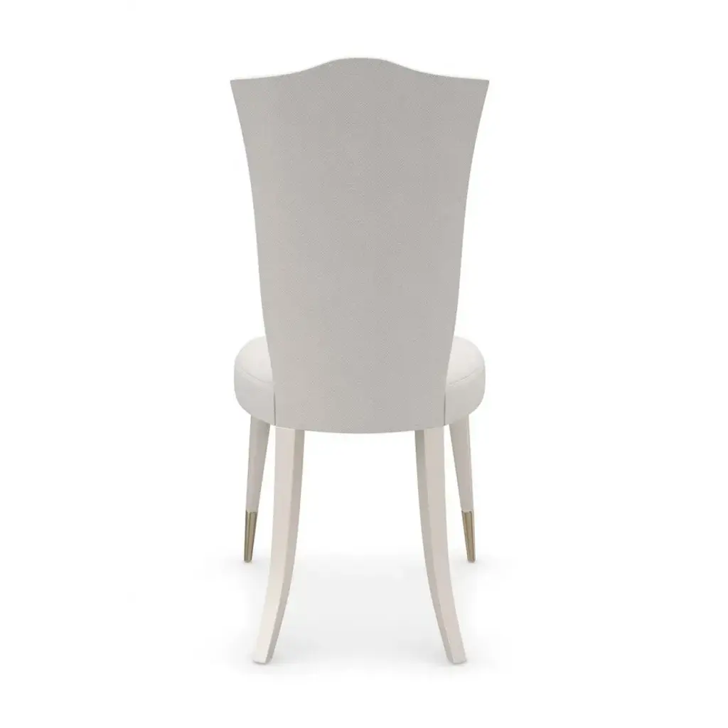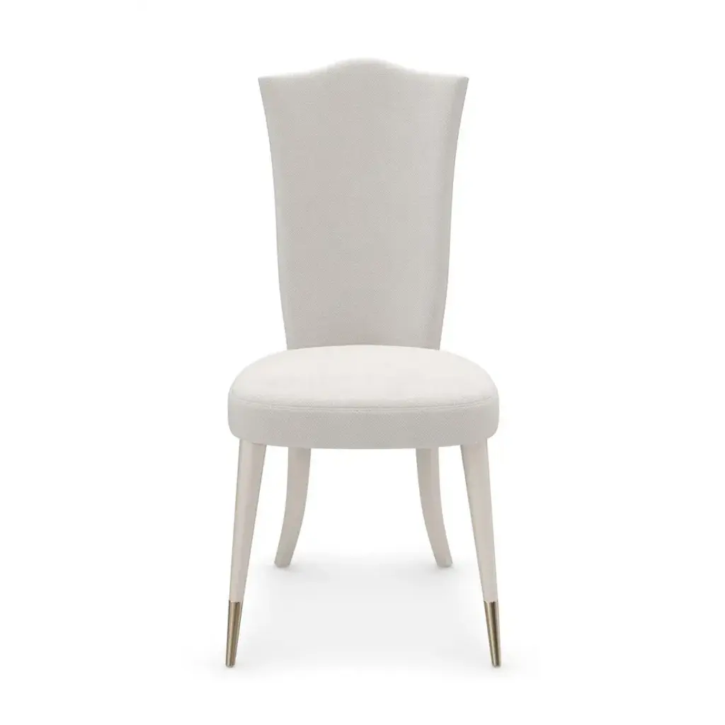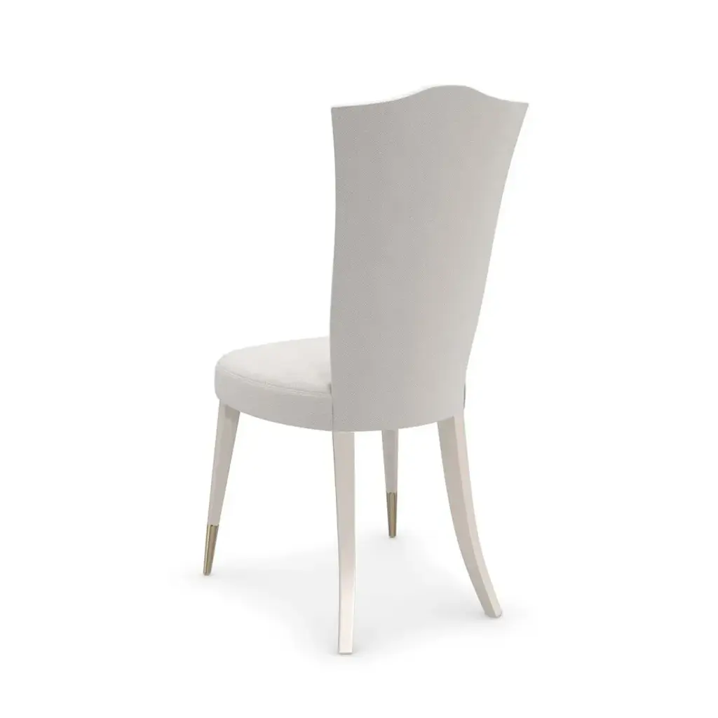 A classic camel back defines this sweetheart of a dining chair, designed with welcoming curves and lumbar support to comfortably seat guests. Fully upholstered with Matte Pearl legs, tapered on the front and capped in a Whisper of Gold metal ferrules. Cherub arm chair also available.