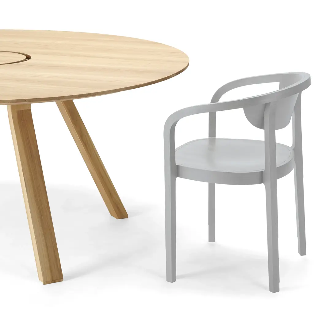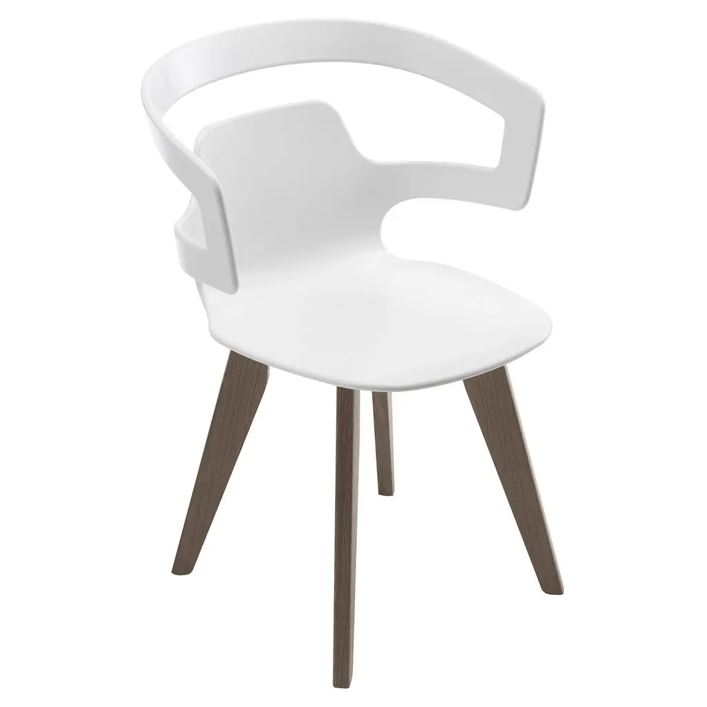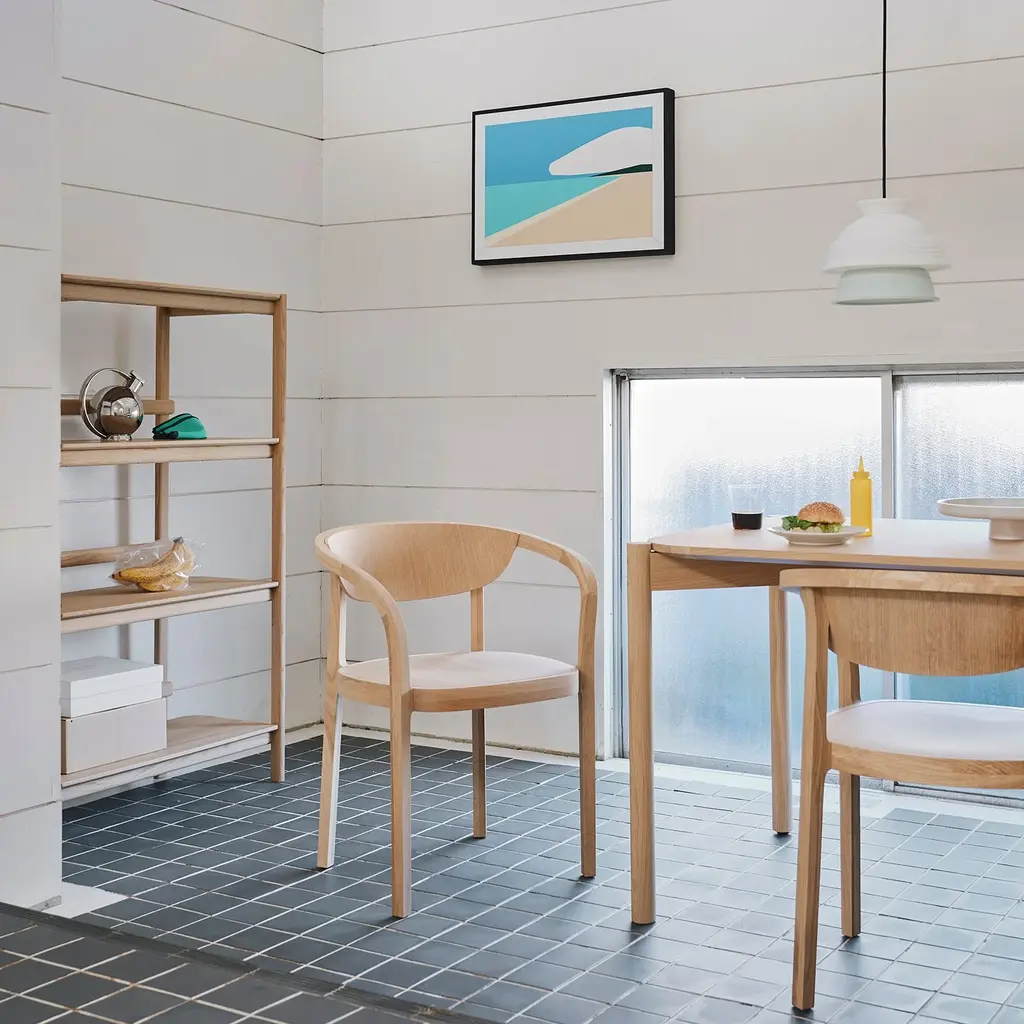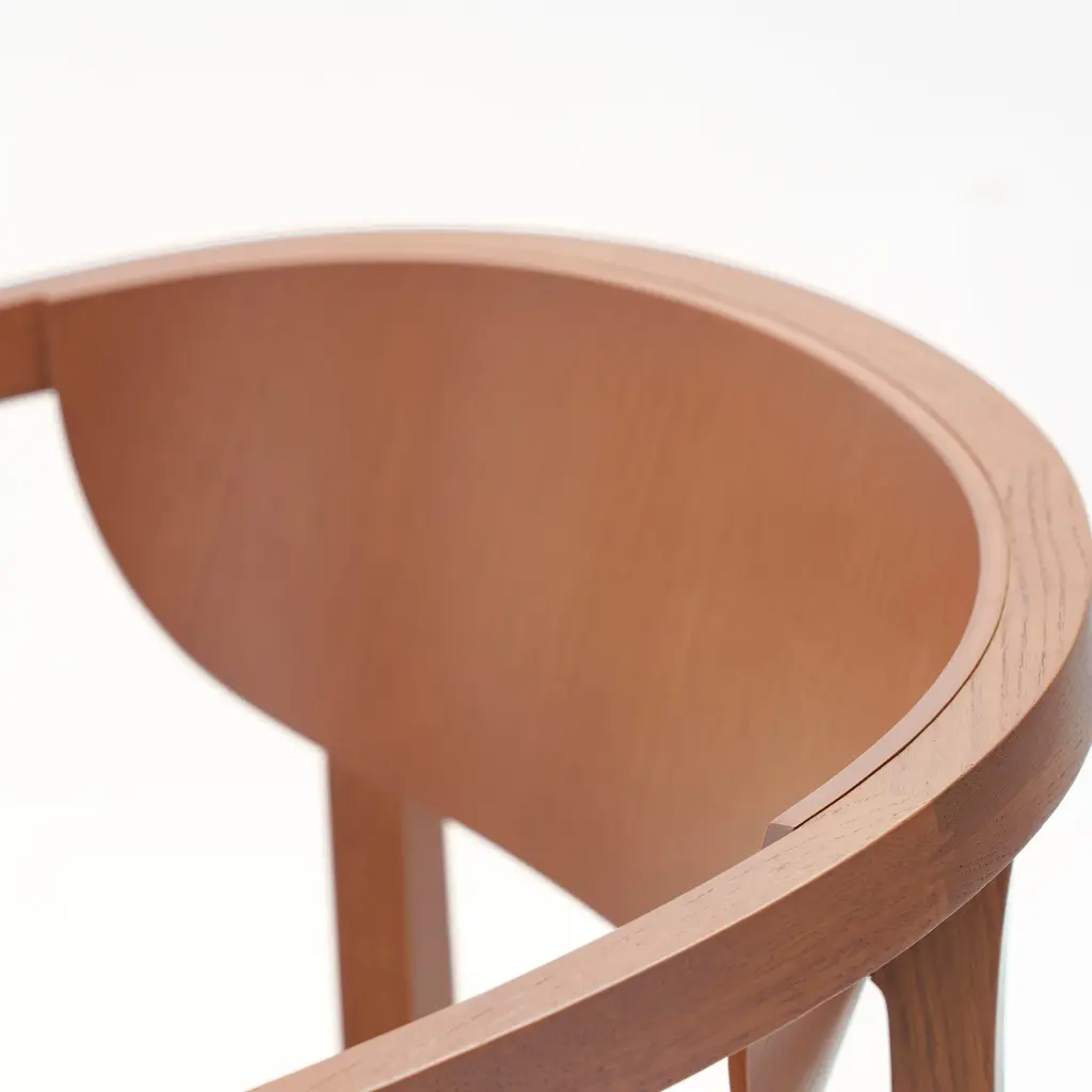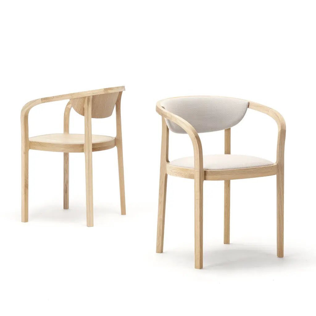Chesa Chair is defined by the continuous curvature of the line that forms the front legs and backrest, creating a comfortable, protective space that also allows for sitting diagonally and facing conversation partners on each side. Designer Jórg Boners compact meeting and dining chair balances classic elegance with spare detailing, its fine-boned frame made of solid, sustainably sourced Japanese oak wood and backrest of bent plywood and available in both a natural finish and subtle accent colorations.