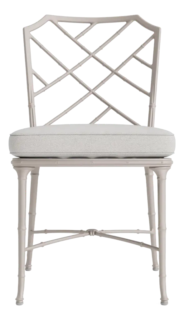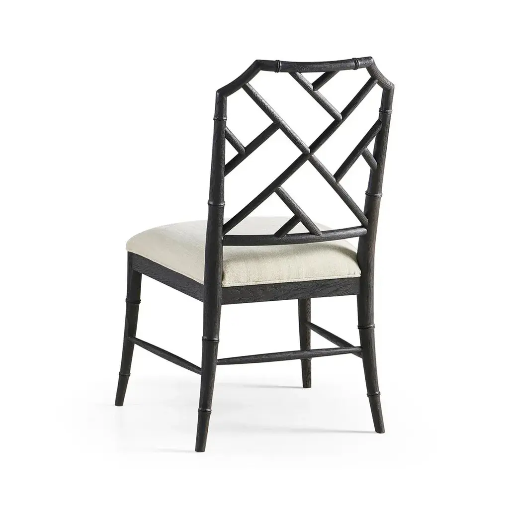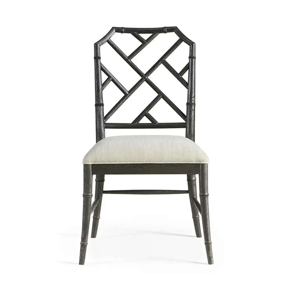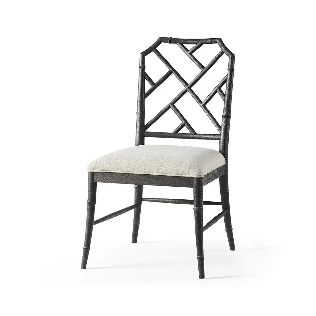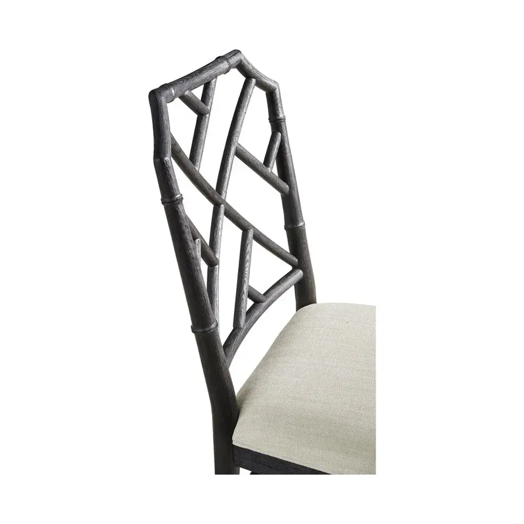 Chippendale Bamboo Dining Chair, this timeless geometric design lattice back bamboo formed dining side chair in an ebonized finish with light distressing. Upholstered in earthy oatmeal performance fabric, the chairs will add comfort and intrigue to refined dining spaces. Dimensions: 21.5" W x 23.68" D x 37" H Seat - 19" H