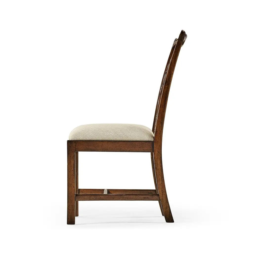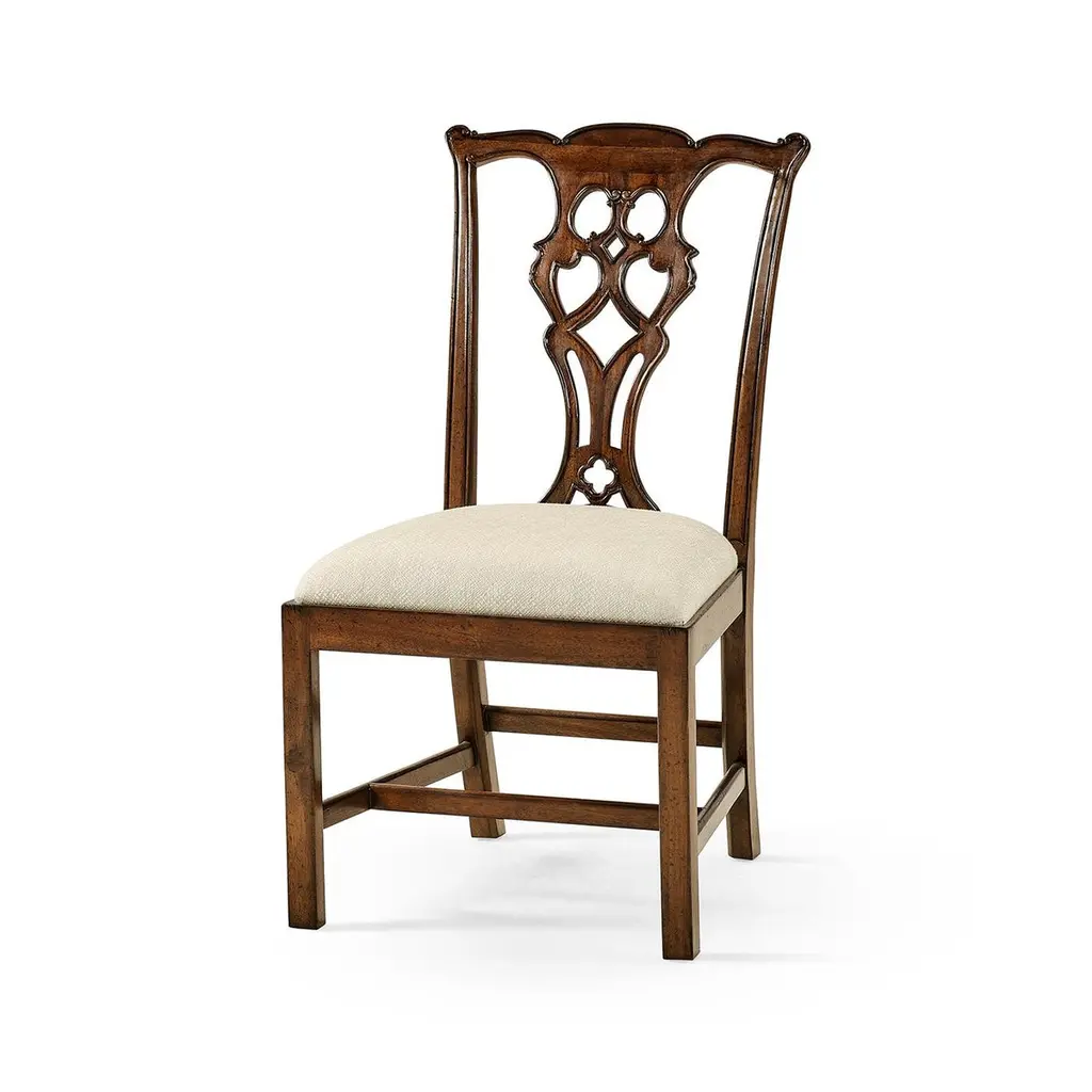 Classic Chippendale style distressed mahogany dining chair, the serpentine top rail above a flat pierced and shaped splat with a gothic quatrefoil to the base, a neutral upholstered drop-in seat and plain square-legged stretcher base.Dimensions: 22" W x 25.5" D x 40.25" HSeat height: 20"