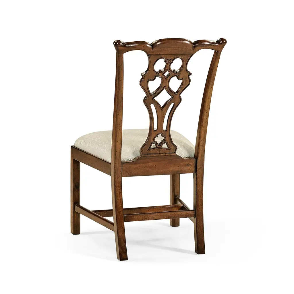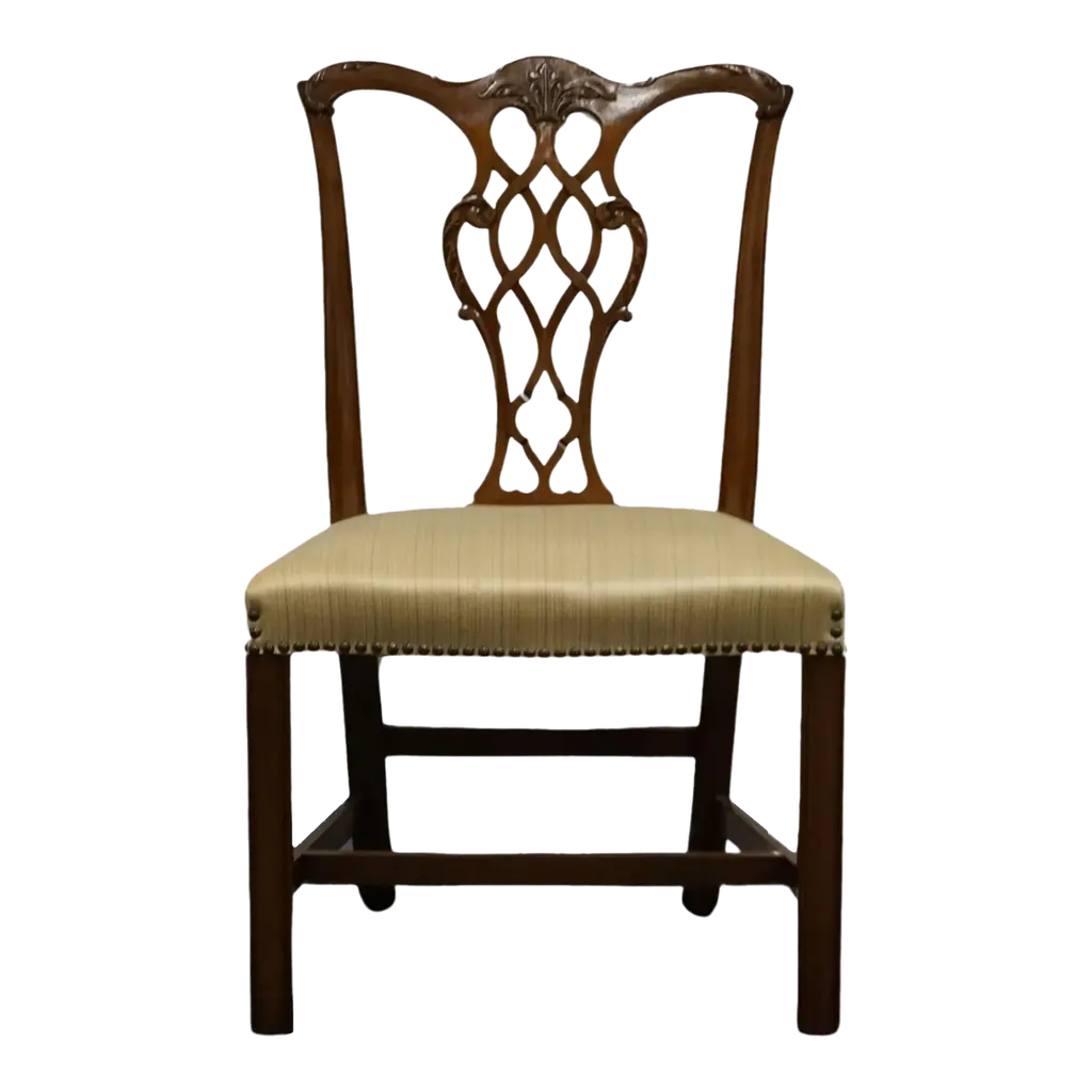 Classic Chippendale style distressed mahogany dining chair, the serpentine top rail above a flat pierced and shaped splat with a gothic quatrefoil to the base, a neutral upholstered drop-in seat and plain square-legged stretcher base. Dimensions: 22" W x 25.5" D x 40.25" H Seat height: 20"