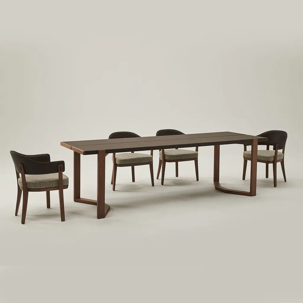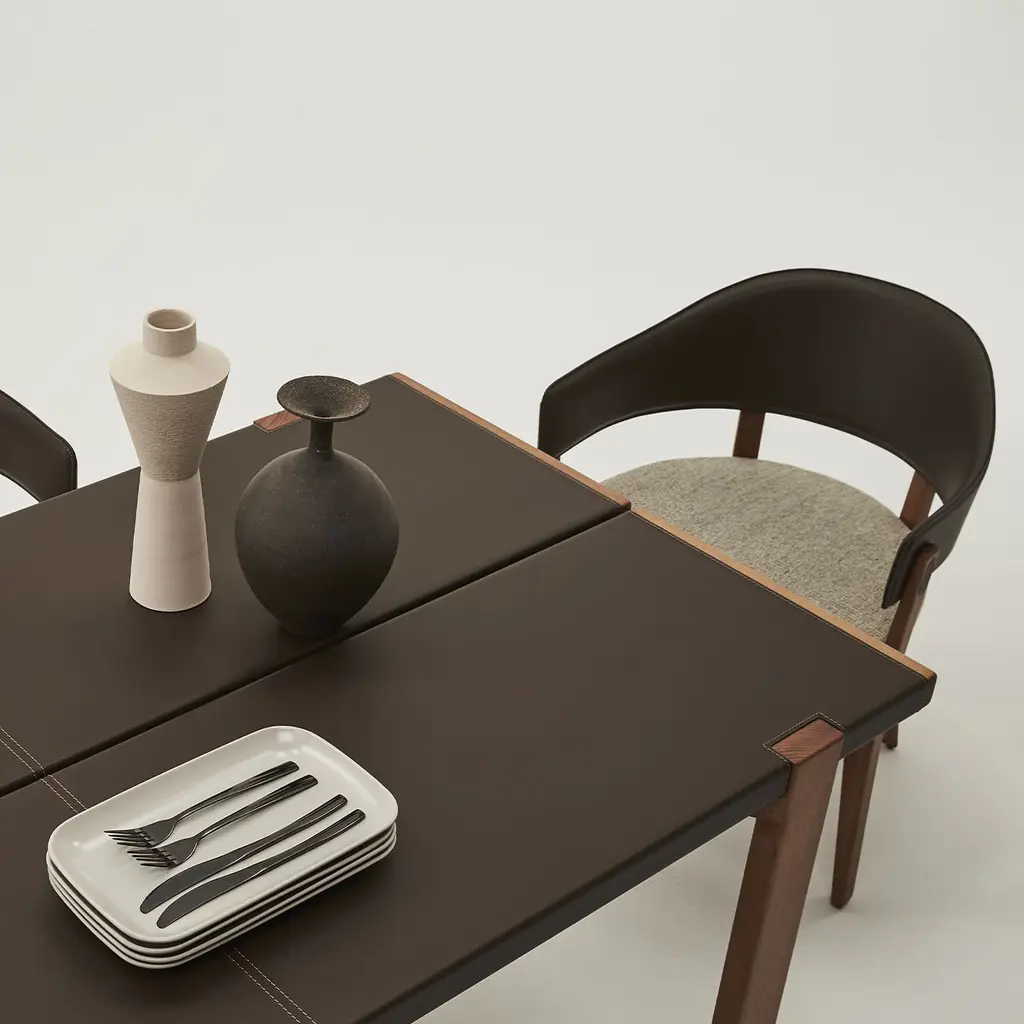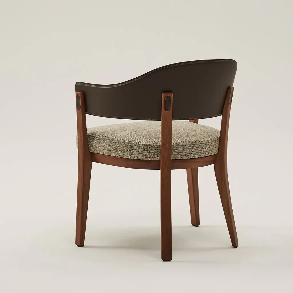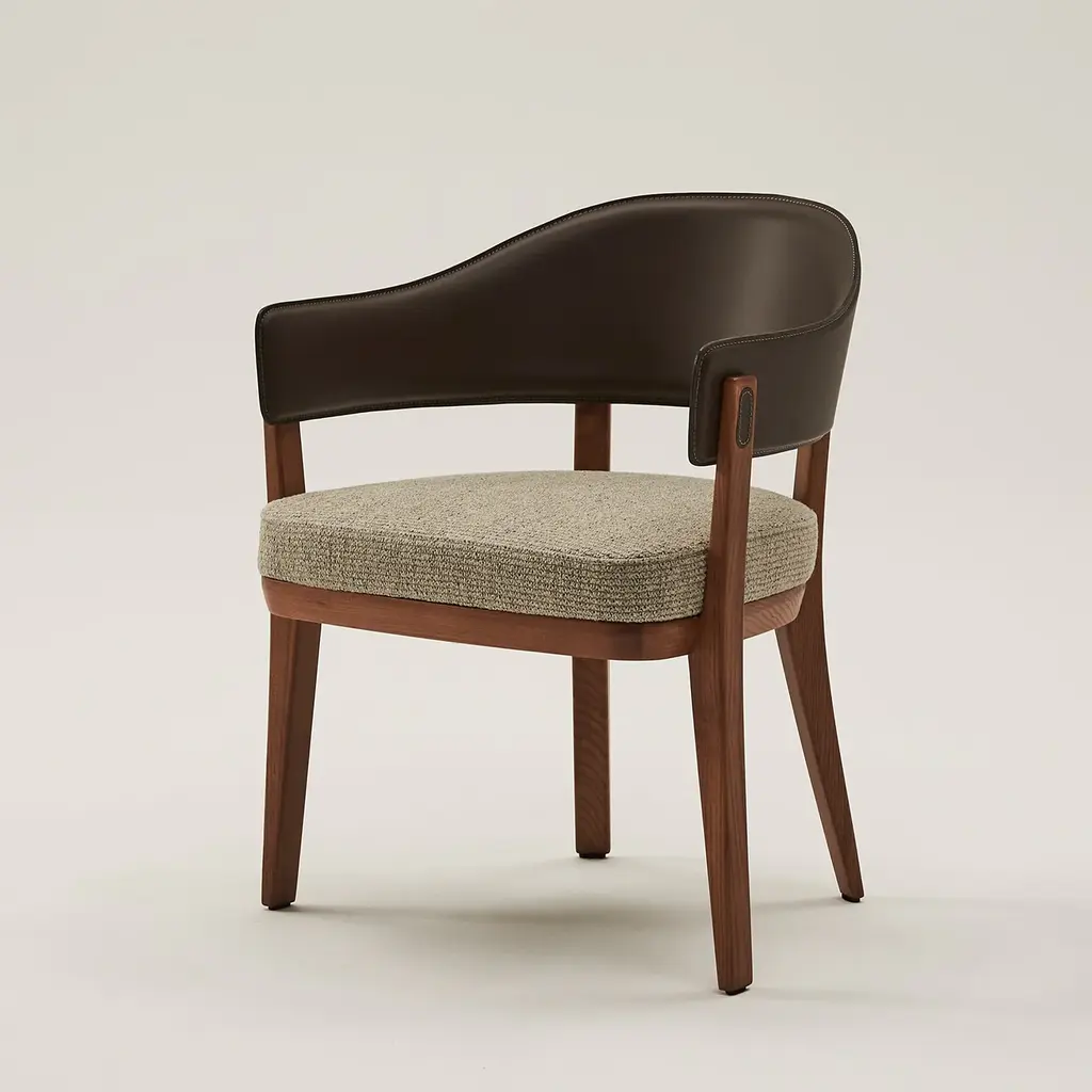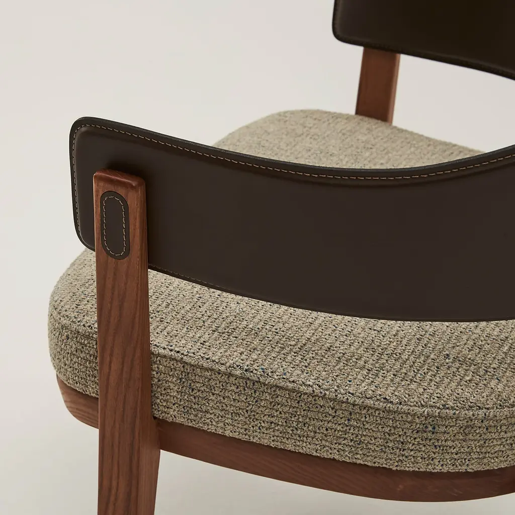 Enveloping and reassuring, this chair elevates dining time with its precious sartorial details. The sleek ash frame welcomes a curved plywood backrest - boasting a deep-brown leather cover finished with minute seams - and slopes towards the sides for tracing the armrests. Inviting in its arched design, the piece ensures long-lasting comfort thanks to the seat's generous polyurethane padding and its ecru-toned fabric upholstery.