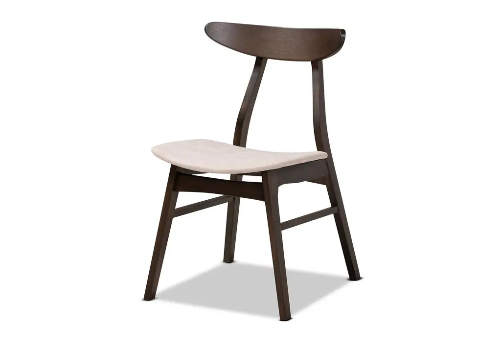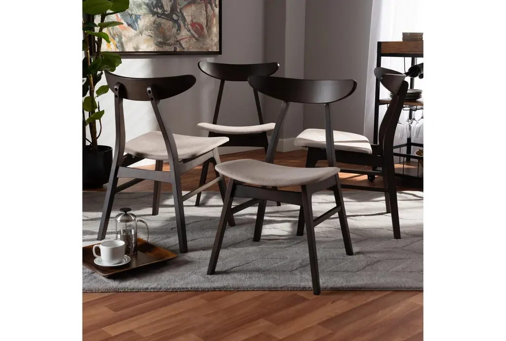 Enhance your dining space with the Christina Beige Fabric Uph Dark Oak Brown Finished Wood Dining Chair Set of 4. These modern chairs feature a stunning combination of beige fabric and dark brown finished rubberwood, creating a sophisticated yet inviting atmosphere. Perfect for both dining rooms and kitchens, their armless and curved design offers comfort and style.