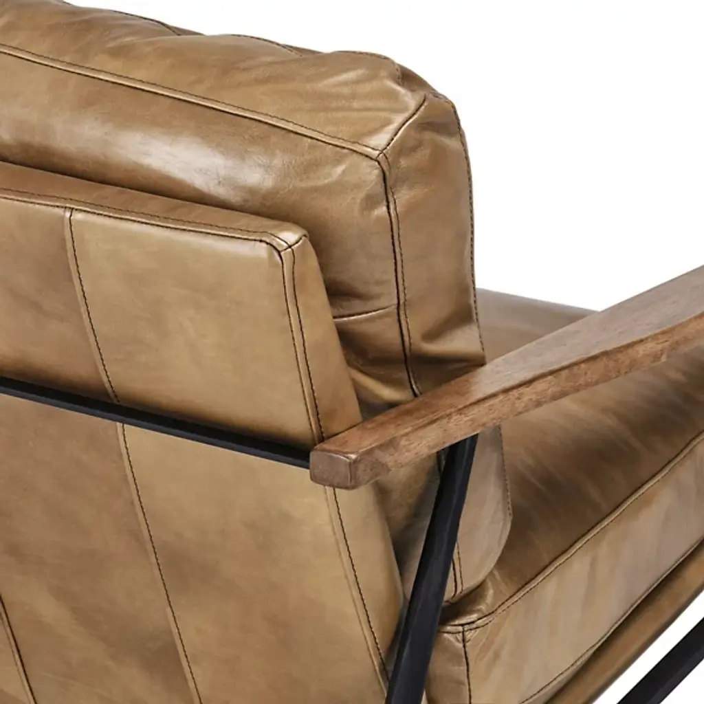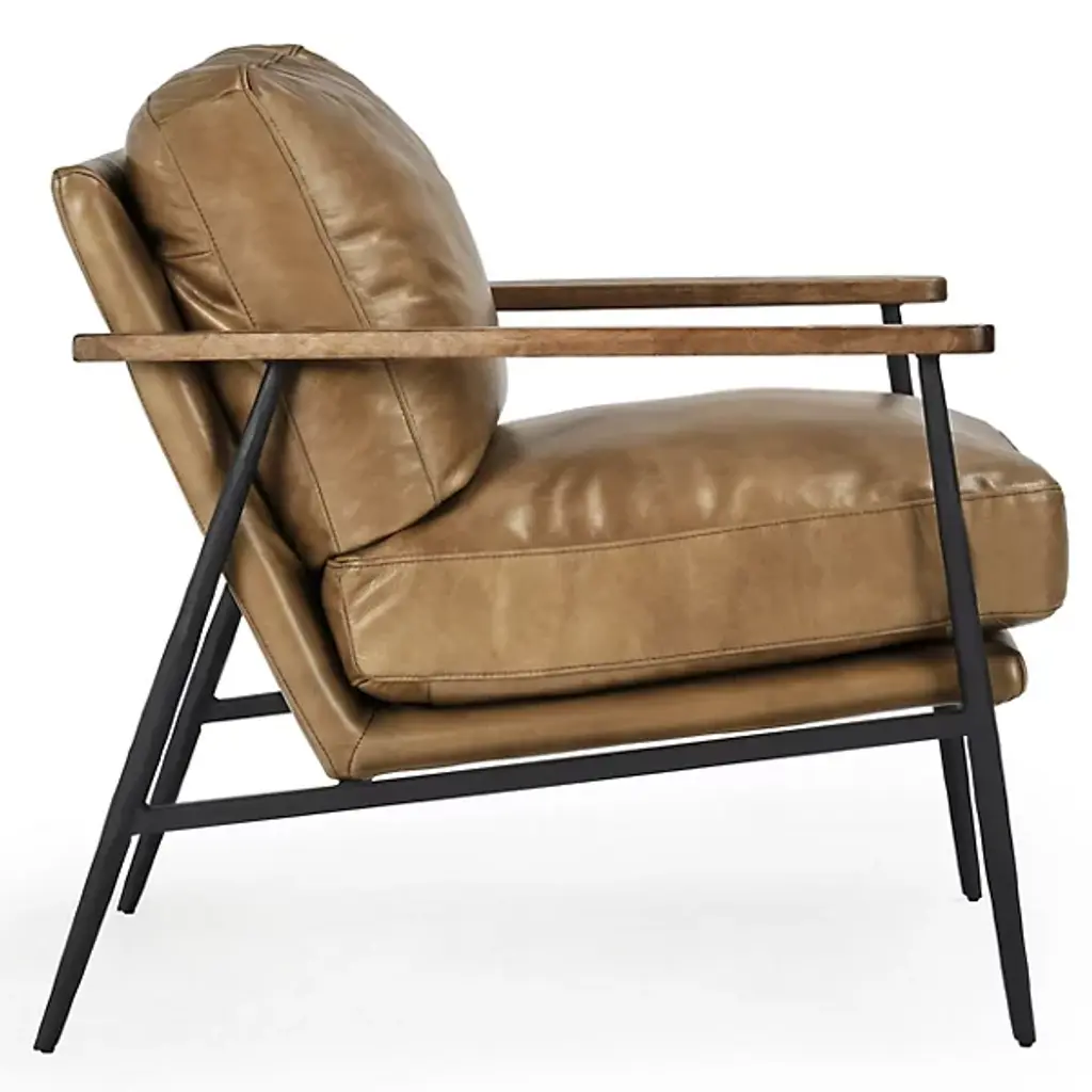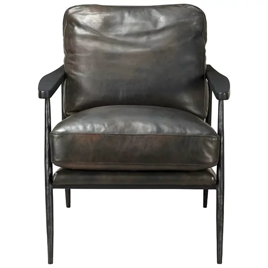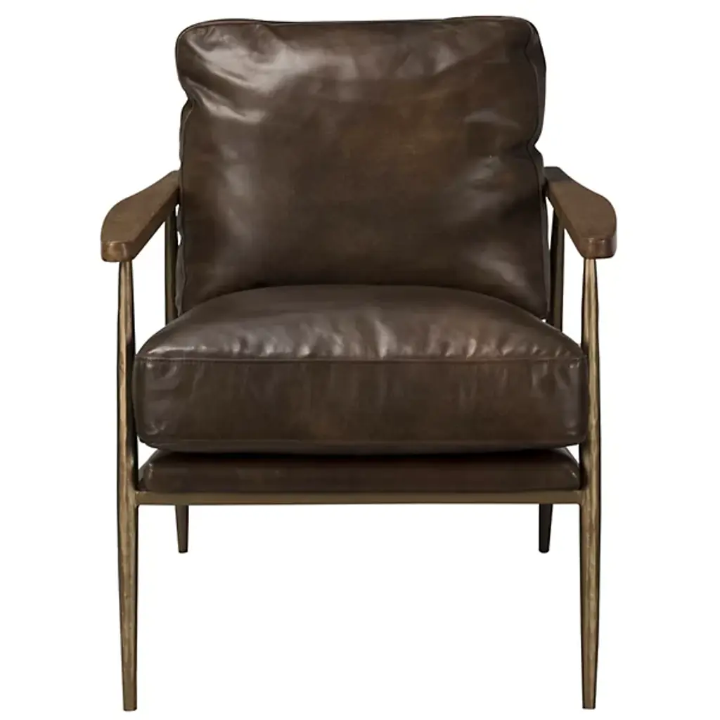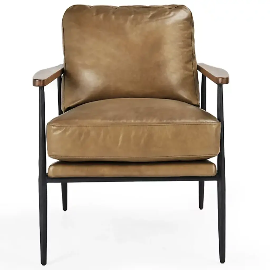 The Christopher Club Chair from Classic Home blends contemporary design with rustic charm. Upholstered in rich top-grain leather offers a luxurious feel and timeless appeal. Rubberwood armrests provide a natural touch, while slender, tapered iron legs lend a sleek, modern profile. The chair rests on a sturdy iron frame, combining comfort and durability, becoming a standout piece in any living space. Its versatile design brilliantly complements rustic and modern interiors alike.