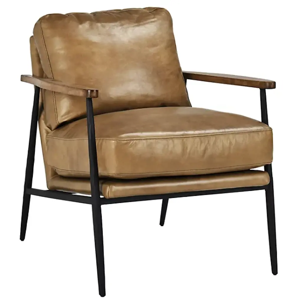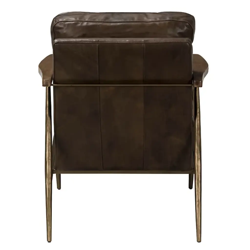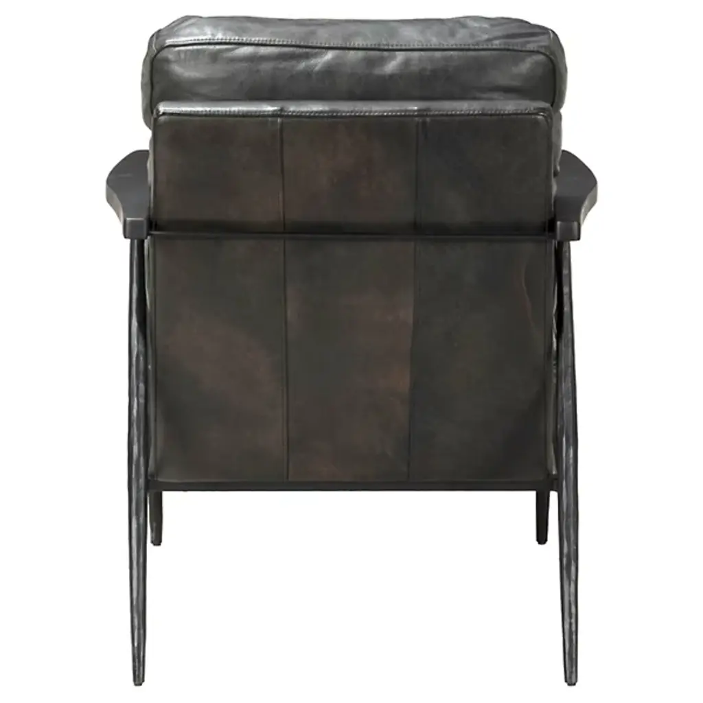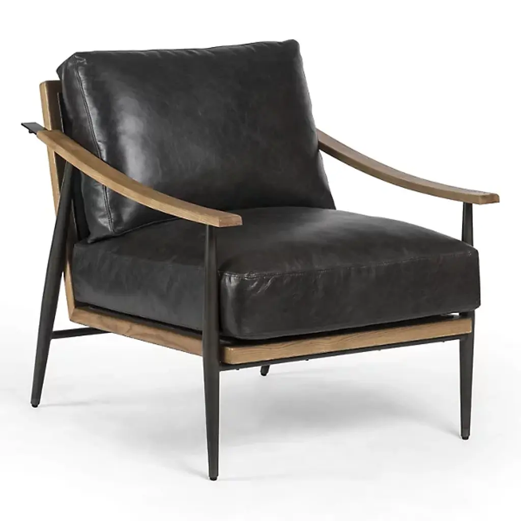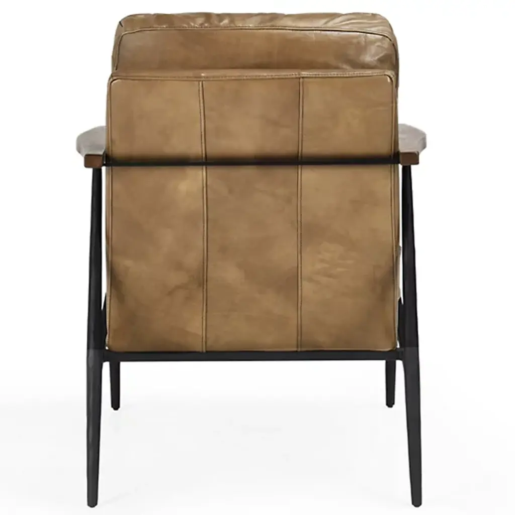 The Christopher Club Chair from Classic Home blends contemporary design with rustic charm. Upholstered in rich top-grain leather offers a luxurious feel and timeless appeal. Rubberwood armrests provide a natural touch, while slender, tapered iron legs lend a sleek, modern profile. The chair rests on a sturdy iron frame, combining comfort and durability, becoming a standout piece in any living space. Its versatile design brilliantly complements rustic and modern interiors alike.
