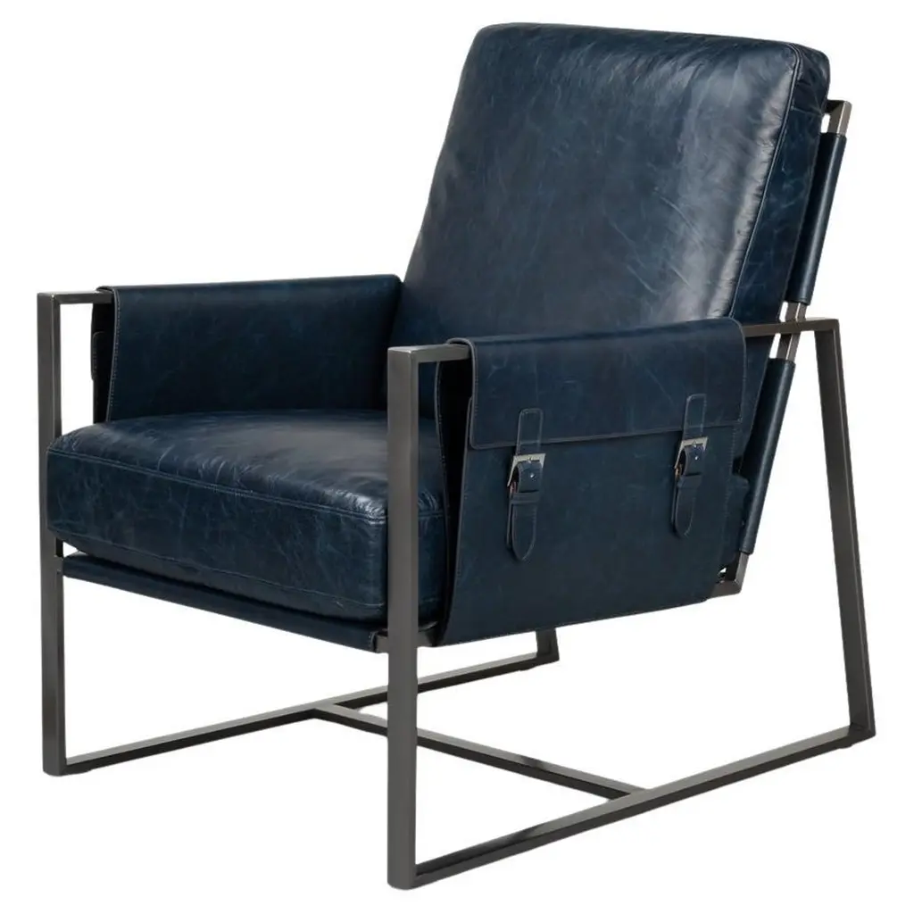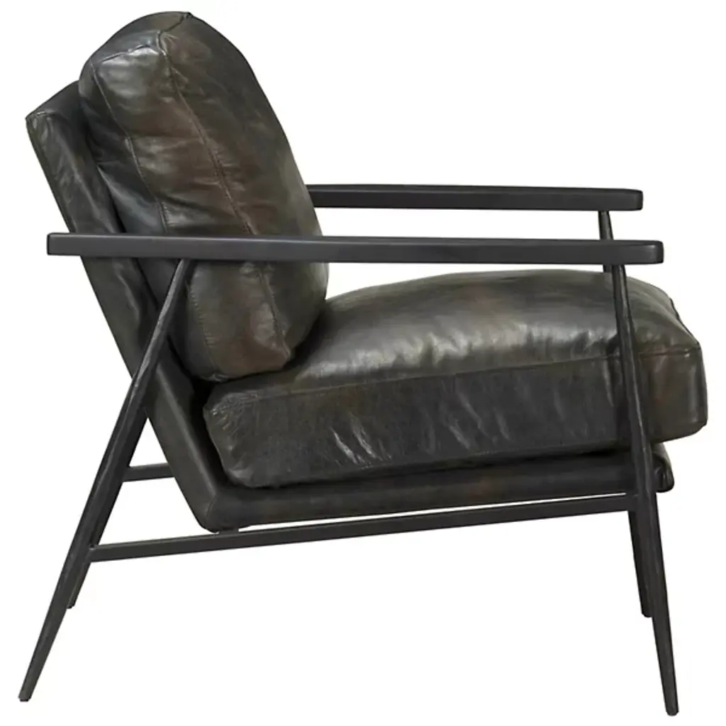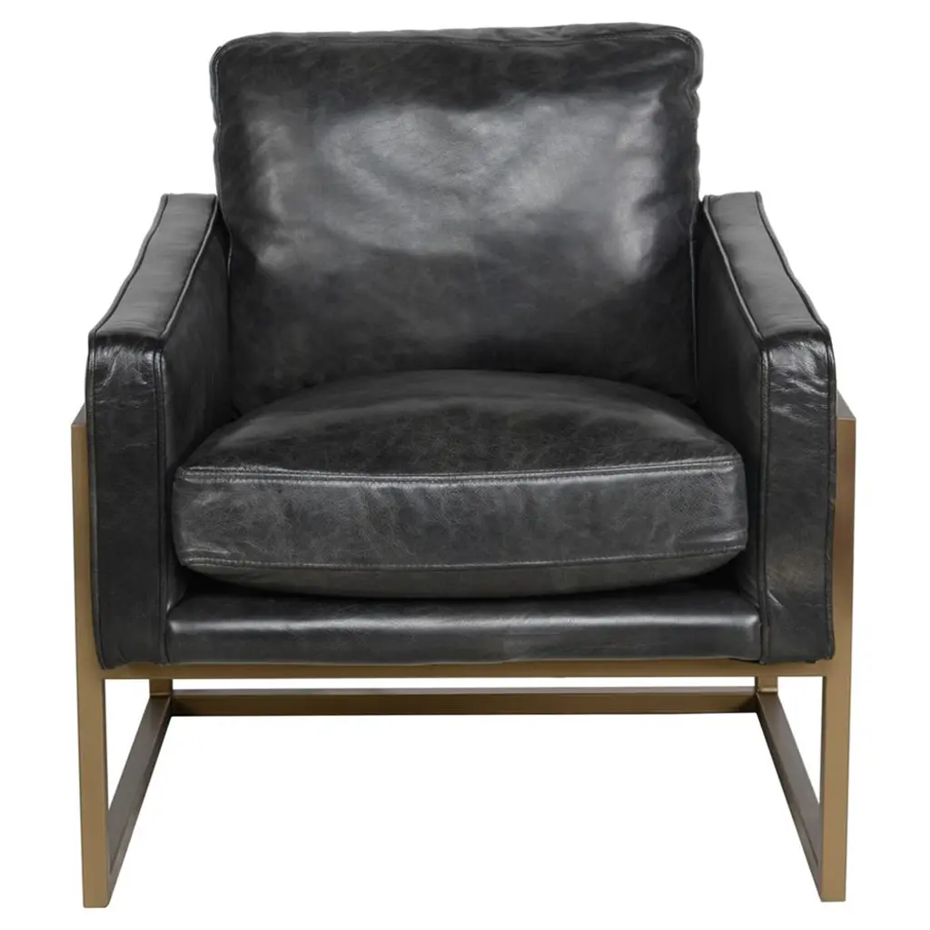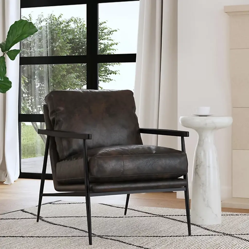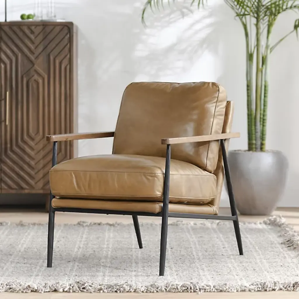 The Christopher Club Chair from Classic Home blends contemporary design with rustic charm. Upholstered in rich top-grain leather offers a luxurious feel and timeless appeal. Rubberwood armrests provide a natural touch, while slender, tapered iron legs lend a sleek, modern profile. The chair rests on a sturdy iron frame, combining comfort and durability, becoming a standout piece in any living space. Its versatile design brilliantly complements rustic and modern interiors alike.