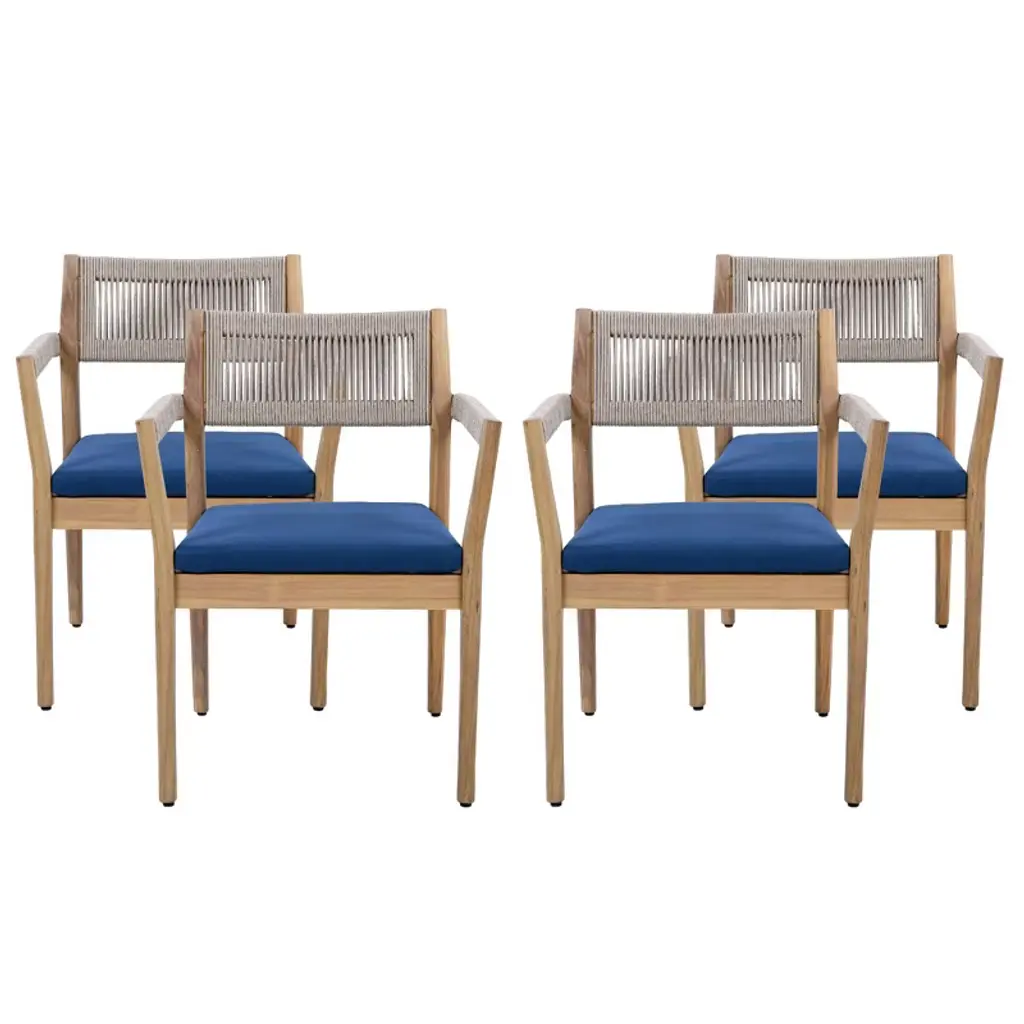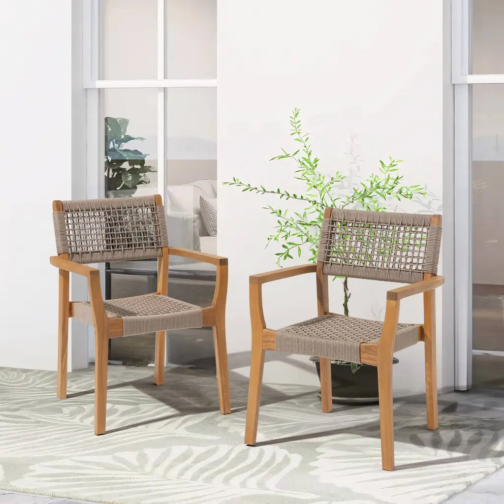 Timeless Teak-Finish Wicker Allure: This outdoor dining chair brings a classic yet contemporary elegance to any patio or garden setting. The warm teak-toned finish blends seamlessly with the intricately woven wicker pattern, creating an inviting silhouette that complements both modern minimalism and rustic charm. Whether used around a fire pit or alongside a bistro table, its refined style elevates every gathering under the open sky. Premium Acacia Wood and Wicker Construction: Expertly crafted from sustainably sourced Acacia wood, this chair offers superior strength and resilience. The handwoven wicker weave is engineered to resist fading, cracking, and fraying, ensuring long-lasting beauty season after season. Backed by a robust 400-lb weight capacity, it combines natural elegance with unwavering performance to stand up to daily outdoor use. Plush Cushioned Support for Relaxation: A luxuriously thick 1.2-inch foam cushion delivers outstanding comfort, allowing you to unwind for hours at a time. The dense padding offers just the right balance of softness and support, gently cradling your body without sacrificing posture. Slip into its soft embrace and enjoy leisurely al fresco meals or casual conversations in ultimate comfort. Curved Armrests for Ergonomic Comfort: Thoughtfully designed armrests follow the natural curve of your arms, reducing strain and promoting a relaxed seating posture. The smooth finish of the wood provides a pleasant tactile experience, while the gentle incline invites you to settle in deeply. This attention to ergonomic form transforms an ordinary chair into a haven of restful refinement. Compact Dimensions and Easy Assembly: Measuring 23.5"L x 21.25"W x 32"H, this chair is sized to fit snugly around dining tables, fire pits, and small terraces without overwhelming your outdoor area. Despite its substantial presence, it's surprisingly lightweight at under 34 lbs and arrives with all necessary tools and clear illustrated instructions. Assembly is quick and straightforward, with no special expertise required. Choose:There are options to choose from two, four, or six chairs. Dimensions: 23.5" L × 21.25" W × 32" H Material: Premium Acacia wood & weather-resistant wicker Weight Capacity: 400 lbs Cushion: 1.2" thick plush foam Assembly: Illustrated guide & hardware included
