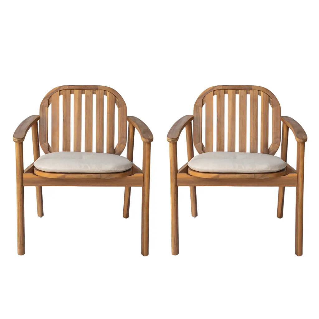 Refined Outdoor Slatted Backrest Style: This dining chair presents a harmonious blend of simplicity and sophistication, featuring a gently arched backrest composed of evenly spaced vertical slats that cradle the torso for optimal comfort and airflow. Its understated silhouette complements a variety of outdoor aesthetics, from rustic garden patios to contemporary terrace lounges, while inviting relaxed conversation and al fresco dining experiences with its graceful posture. Premium Acacia Hardwood Construction Material: Crafted from solid acacia wood, this chair is engineered to withstand the rigors of outdoor environments, boasting a dense, close-grained structure that resists moisture, rot, and insect damage. The robust eucalyptus wood legs offer exceptional bending and compression resistance, ensuring the frame remains stable and warp-free over years of use. Together, these hardwoods deliver a resilient seating solution that matures beautifully under sun and rain exposure. Ergonomic Curved Armrest Comfort Features: Designed with gently contoured armrests that flow seamlessly from the back supports, this chair provides a natural resting place for arms and shoulders, reducing fatigue during extended gatherings. A tailored, thin seat cushion adds a layer of ergonomic support, nestled discreetly beneath the sitter without altering the chair's clean profile. The breathable fabric cover accommodates quick drying after rain, making each seating session as comfortable as the last. Elegant Vertical Slat Design Details: The chair's backrest showcases vertical wooden slats arranged with precise spacing to distribute weight evenly while maintaining an open, lightweight appearance. Subtle beveling along the edges of each slat enhances tactile comfort and illuminates the wood's grain pattern. The seamless integration of the armrest and leg assembly highlights meticulous joinery, reflecting craftsmanship that balances aesthetic refinement with structural integrity. Spacious Dimensions and Assembly Requirement: With generous proportions measuring 27.5 inches in depth and 25.25 inches in width, this chair accommodates a wide range of body types without compromising its refined form. Standing 33 inches tall, the profile supports an upright yet relaxed posture at standard dining tables. Ships in a compact package with clear instructions—two chairs included—requiring straightforward assembly with minimal hardware and tools. Assembled Dimensions: 27.50″ D x 25.25″ W x 33.00″ H Material: Acacia wood seat and backrest with eucalyptus wood legs Cushion Fabric: Polyester fabric seat cushion Product Weight: 17.63 lbs each Includes two dining chairs; assembly required