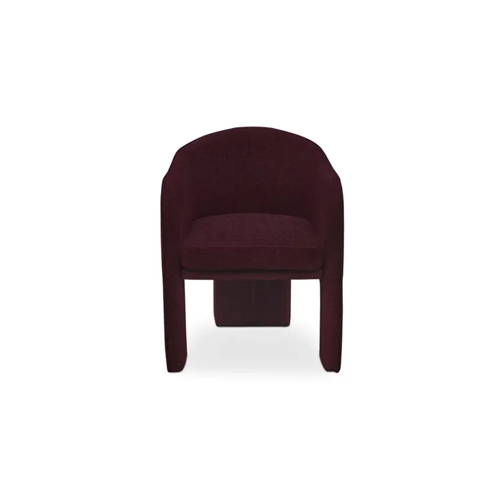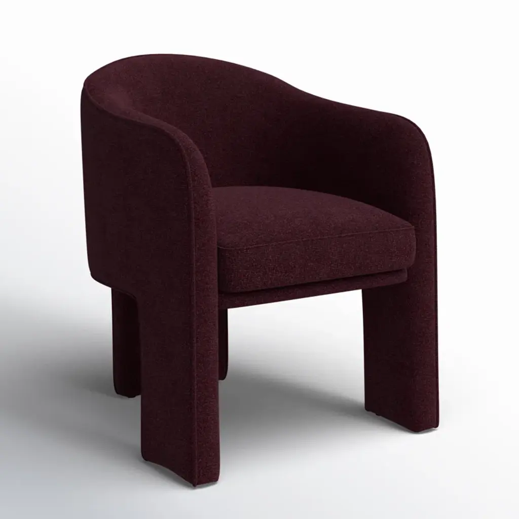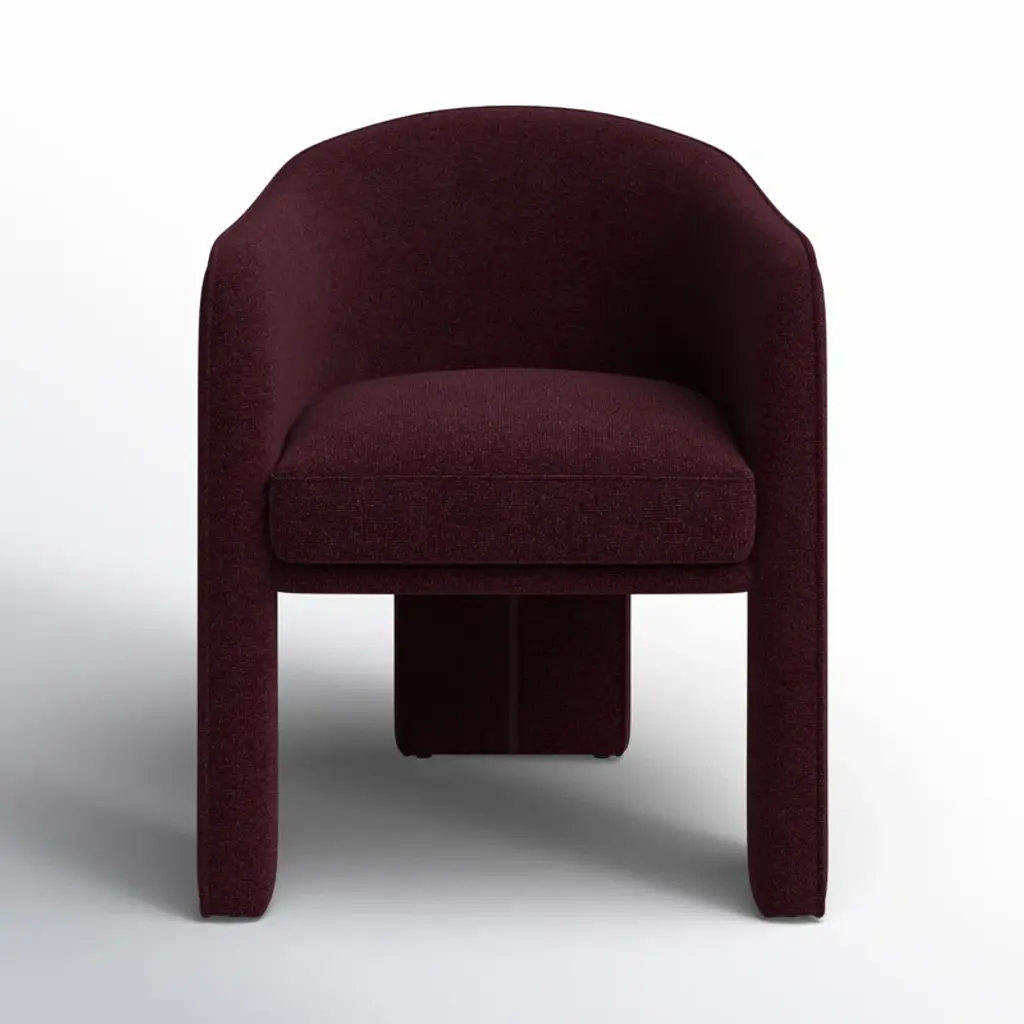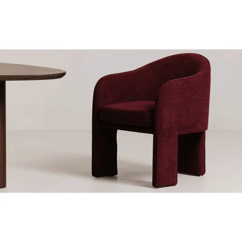Fully upholstered in easy-to-clean performance fabric and generously sized, the Clara dining chair is all about comfort with a thoughtfully rounded back and gently curved armrests that add a touch of elegance and femininity. The sleek and minimalistic 3-legged base provides a clean and refined foundation.
