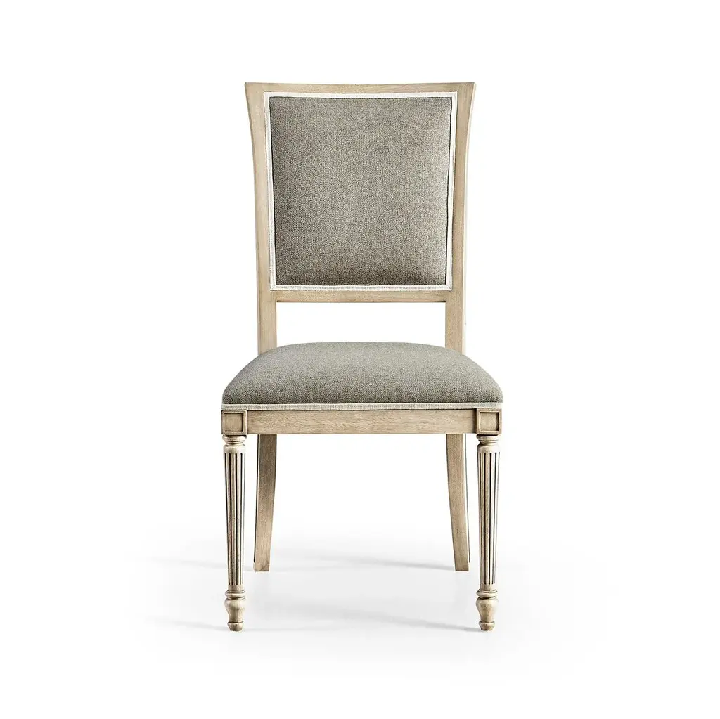Crafted with meticulous attention to detail, this chair features a sophisticated London Mist wood finish and graceful front turned, tapered and fluted legs, adding a touch of European flair to any dining room. The hand-upholstered plush, performance fabric seat and high back ensure comfortable seating, making long conversations and dinners more enjoyable. Whether you're hosting a grand dinner party or enjoying a quiet meal at home, this chair combines durability, comfort, and style to fit seamlessly into your décor. Dimensions: 20" W x 23" D x 38.88" H Seat - 19" H