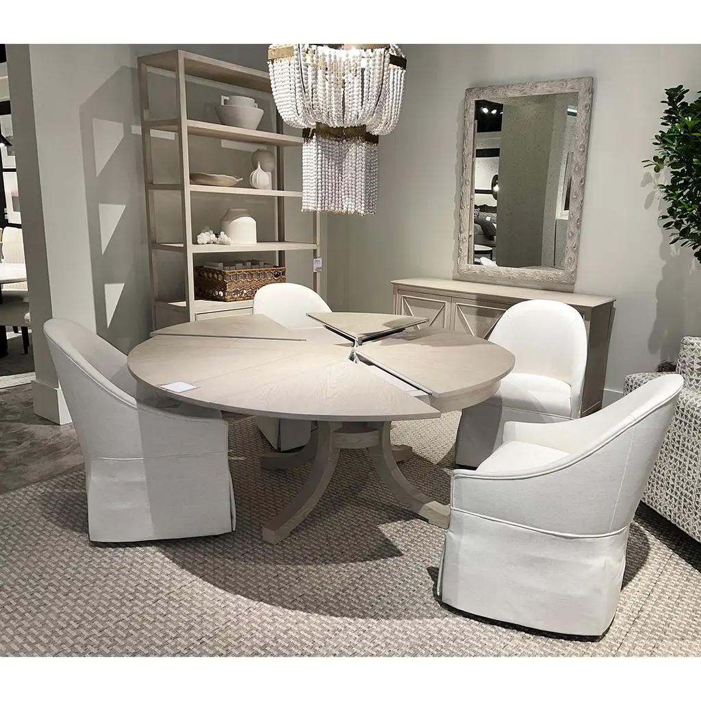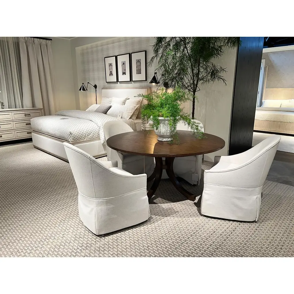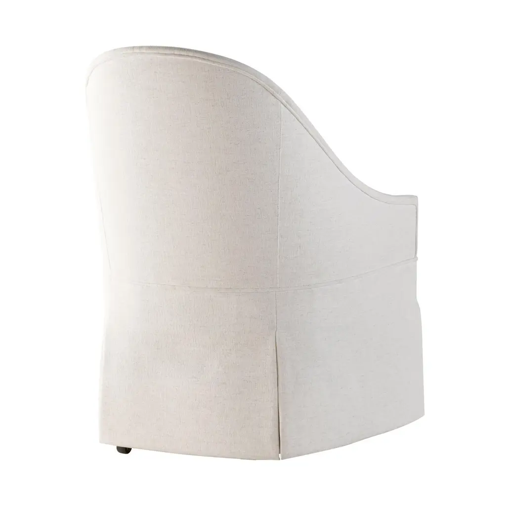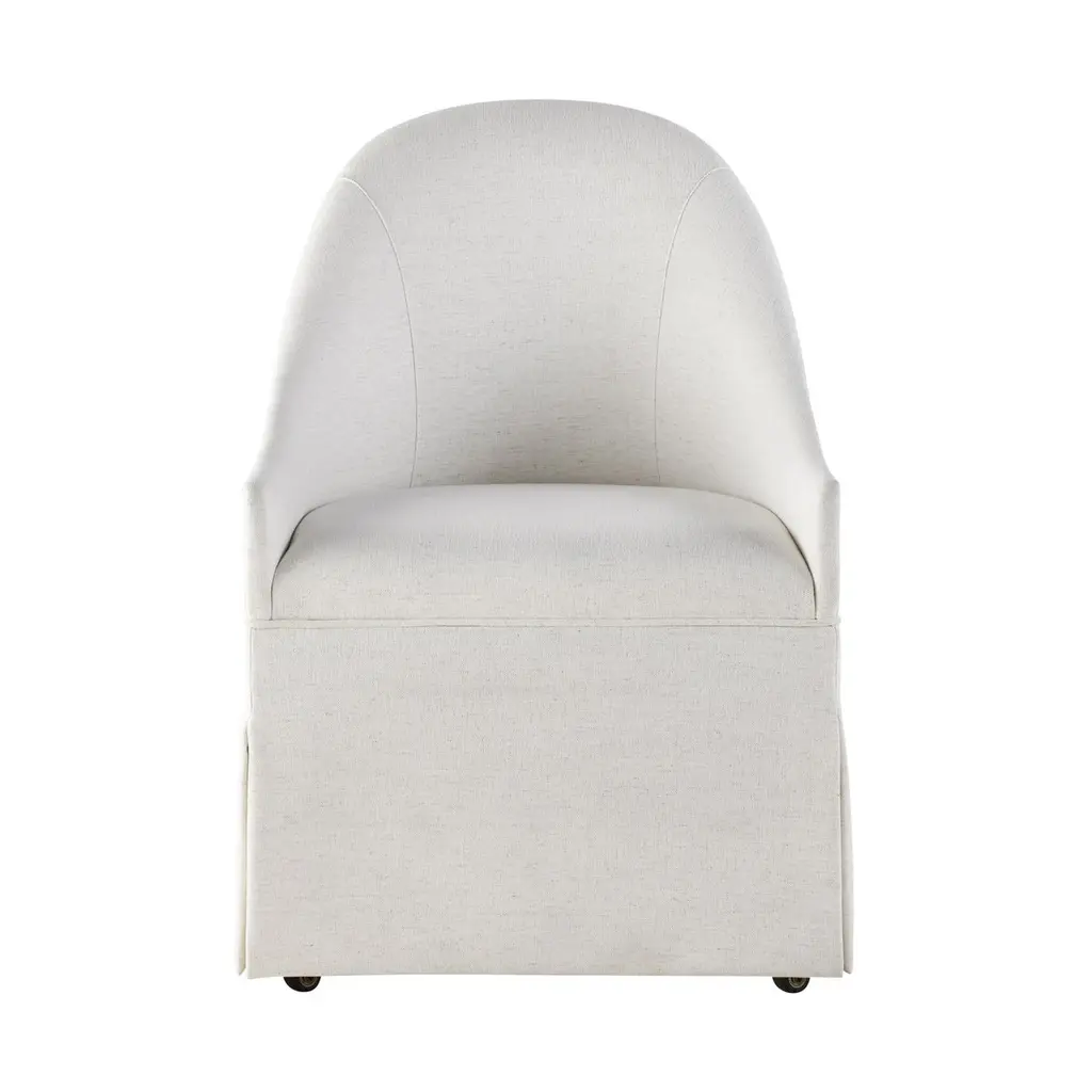 slender lines and a polished silhouette create a refined and timeless design. The chair’s gracefully curved arms and seamless form offer both style and support, making it a perfect addition to any dining room. Upholstered in an elegant neutral Fabric and finished with meticulous welting trim, this chair brings an air of sophistication to your dining space.Whether you’re hosting a formal dinner or enjoying a casual meal, this generously cushioned chair provides a plush seating experience that blends classic design with modern comfort. Elevate your dining area with a piece that’s as inviting as it is beautiful.Dimensions: 24.5" W x 27" D x 36" HSeat - 20