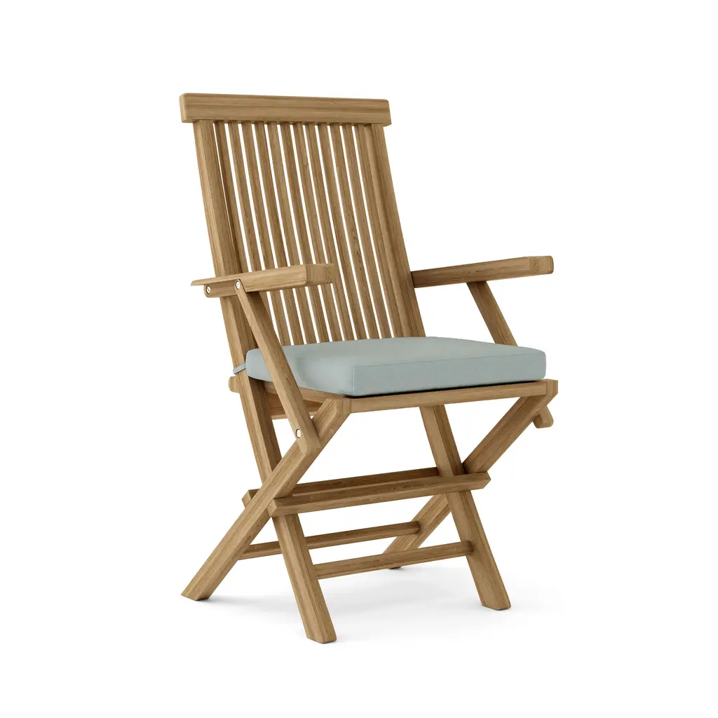 The Classic Teak Outdoor Dining Chair is a very sturdy and versatile piece of furniture that folds for easy movement and storage around the home. Made from kiln-dried Grade-A Teak Wood without finish, its natural material and color is the perfect chair for the outdoors weathering rain, hail, or shine. Overtime, the chair will weather into a patina grey, or scrub down with soap and water to keep in pristine condition. Add All-Weather Sunbrella Cushions for added comfort. Quality that lasts.Set includes 2 teak dining chairs