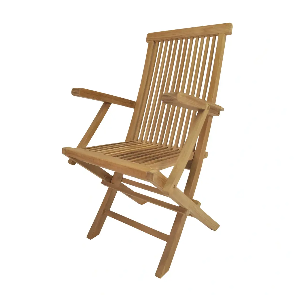 The Classic Teak Outdoor Dining Chair is a very sturdy and versatile piece of furniture that folds for easy movement and storage around the home. Made from kiln-dried Grade-A Teak Wood without finish, its natural material and color is the perfect chair for the outdoors weathering rain, hail, or shine. Overtime, the chair will weather into a patina grey, or scrub down with soap and water to keep in pristine condition. Add All-Weather Sunbrella Cushions for added comfort. Quality that lasts.Set includes 2 teak dining chairs