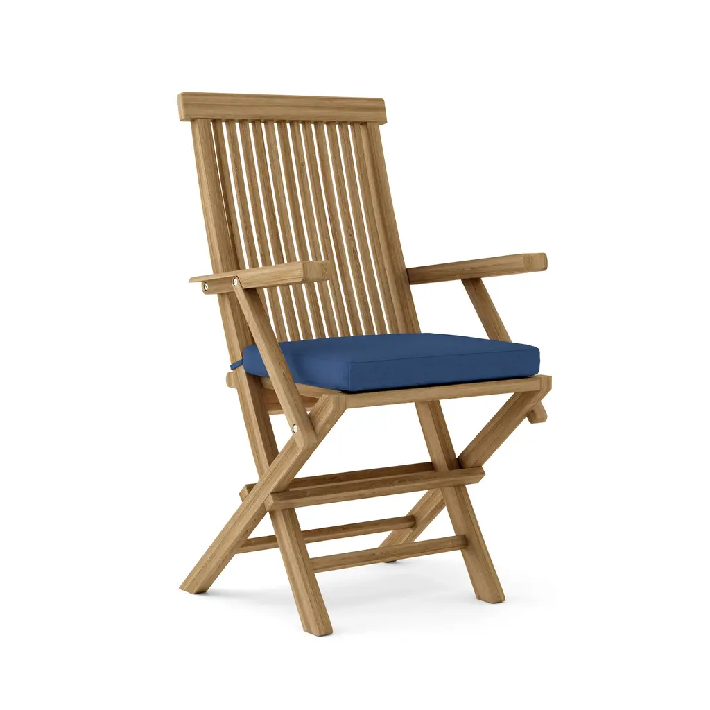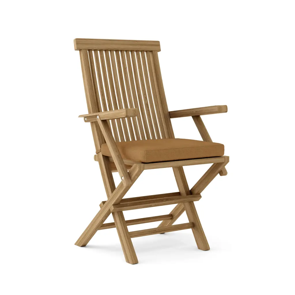The Classic Teak Outdoor Dining Chair is a very sturdy and versatile piece of furniture that folds for easy movement and storage around the home. Made from kiln-dried Grade-A Teak Wood without finish, its natural material and color is the perfect chair for the outdoors weathering rain, hail, or shine. Overtime, the chair will weather into a patina grey, or scrub down with soap and water to keep in pristine condition. Add All-Weather Sunbrella Cushions for added comfort. Quality that lasts.Set includes 2 teak dining chairs