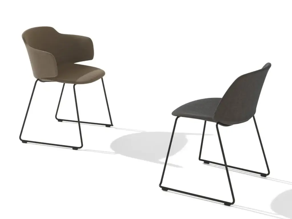 Classy 1083M is a chair with sled base, made with a die cast aluminium frame, upholstered shell, and covered in fabric.In Classy, practical elements and an unusual look are brought together in the distinctive representation of a gently shaped shell, guaranteeing the highest standards of comfort and ergonomics. The elegant and versatile design are further highlighted by the alternating matt and glossy surfaces. The collection, featuring a chair, chair with armrests and stool with polypropylene shell, is further enriched. The shell is now proposed in the version with fabric-upholstered seat, available on all existing frames. The Classy collection thus becomes the most extensive in the catalogue, offering a broad range of solutions and a free choice of pairings. For indoor and outdoor spaces.