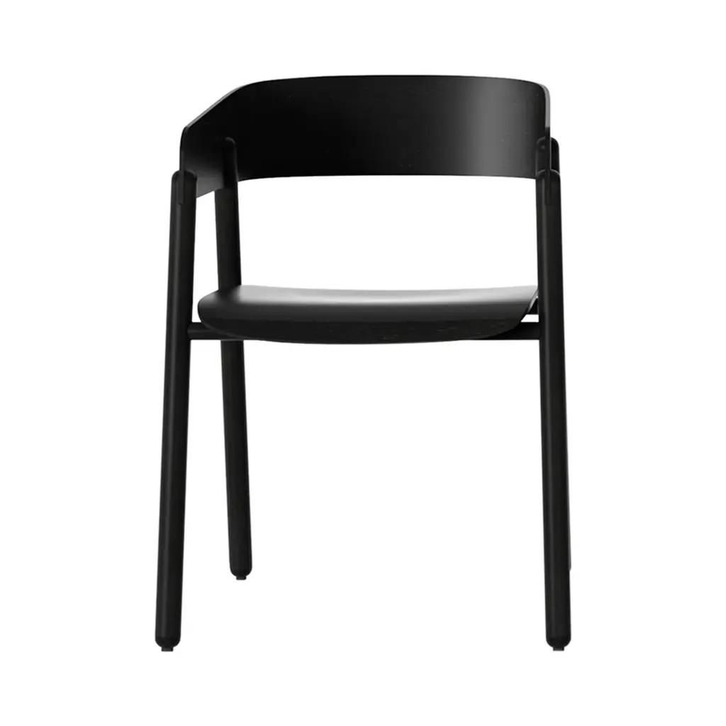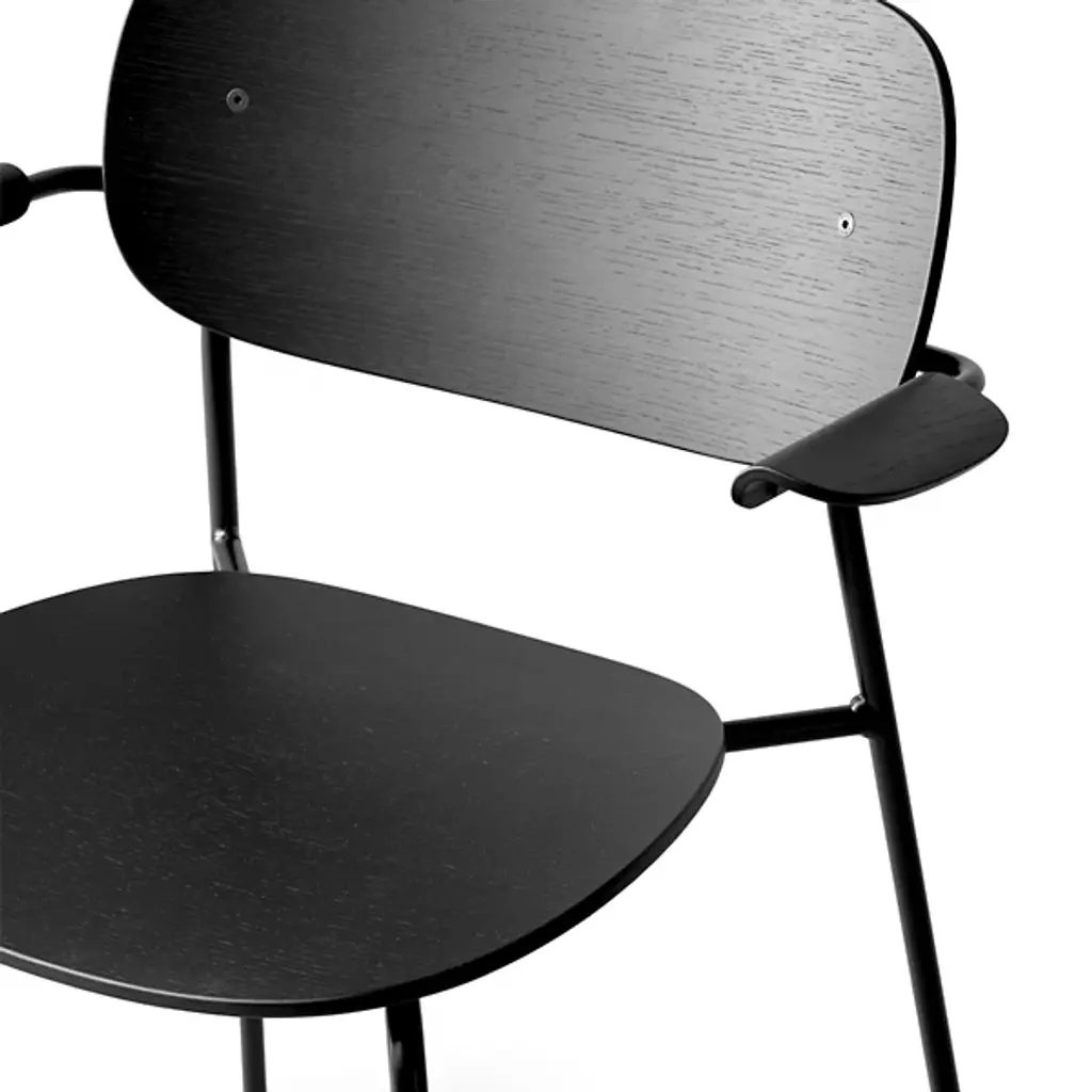 The Co Armchair from Audo Copenhagen, formerly known as Menu, is a masterclass in versatility. it is designed by Norm Architects to bring people together in business settings or home dining affairs. A lightweight, stackable powder-coated steel framework maximizes the value of your space by organizing vertically. The metal structure stands with unrivaled durability and a handsomely contoured silhouette. A handcrafted wooden backplate follows the natural arch of your back with a softly-curving oval shape. Its seat and armrest work together to anchor one firmly and comfortably with an airy touch. It's an FSC-Certified, responsibly sourced piece that translates from one room to another with the same sophisticated combination of contemporary and Scandinavian styles.