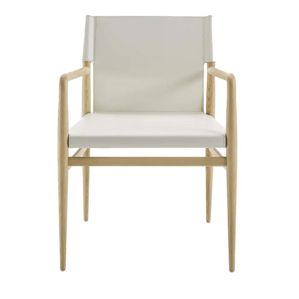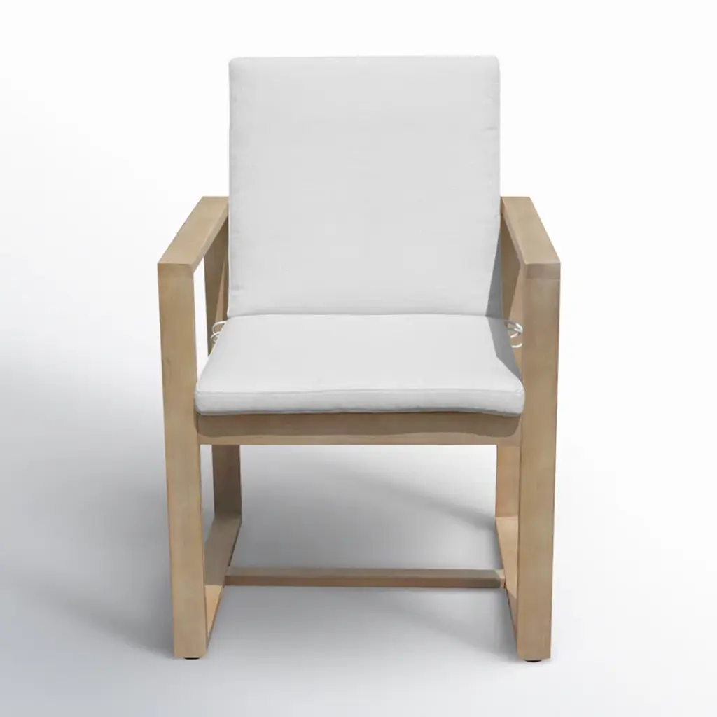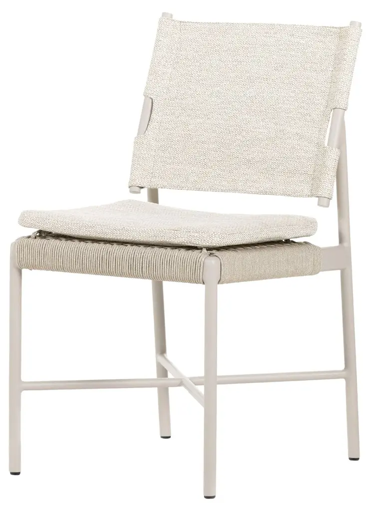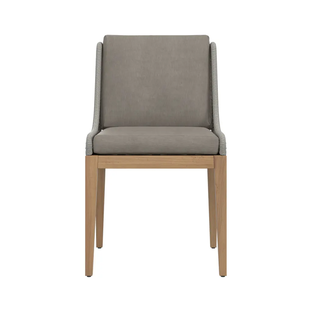 A stylish and practical addition to the porch or patio, this modern, outdoor side chair is crafted of stainless steel and sculpted teak with mortise-and-tenon joinery. A curvy, contoured seat made of ivory canvas mesh completes this weatherproof design.