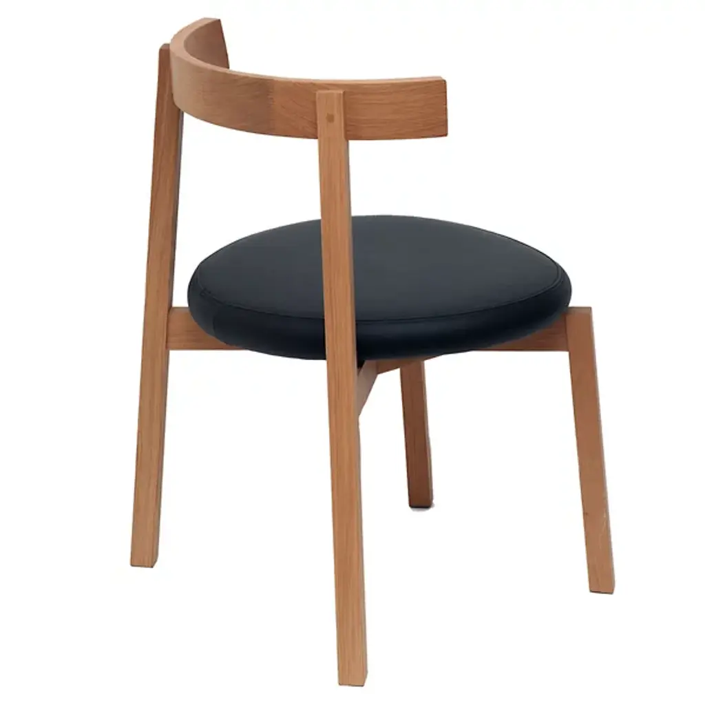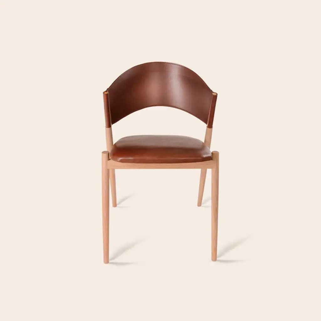 Cognac "A" oak chair by Ox Denmarq.Dimensions: D 51 x W 52 x H 81 cm.Materials: leather, oak, wood.Also available: different colors available.Ox Denmarq is a Danish design brand aspiring to make beautiful handmade furniture, accessories and lighting in natural high-quality materials in fair prices. " When we set out back in 2003, we were primarily working with vegetable-tanned saddle leather thus the name OX was a tribute to our unique leather and the animal providing it.The other half of our name, Denmarq, is chosen to emphasize that we are a Danish design brand based on the Danish design tradition and that most of our furniture is produced in Denmark. However, DENMARQ not only refers to our home country, but also to the co-founder and designer - DENnis MARQuart.Before finishing his design studies at the Copenhagen Design University, Dennis Marquart did a Blacksmith education. This background is extremely useful when developing and designing products."Ox Denmarq handmade products will only get more beautiful as time passes and natural patina sets in.Many Ox products are shaped around marble or vegetable-tanned saddle leather. Stone and leather are materials that will, and should, get marks over time. But they will also age with a very special beauty. When you learn to appreciate the beauty of maturity and of time passing, you have learned to appreciate patina the way it should be appreciated.