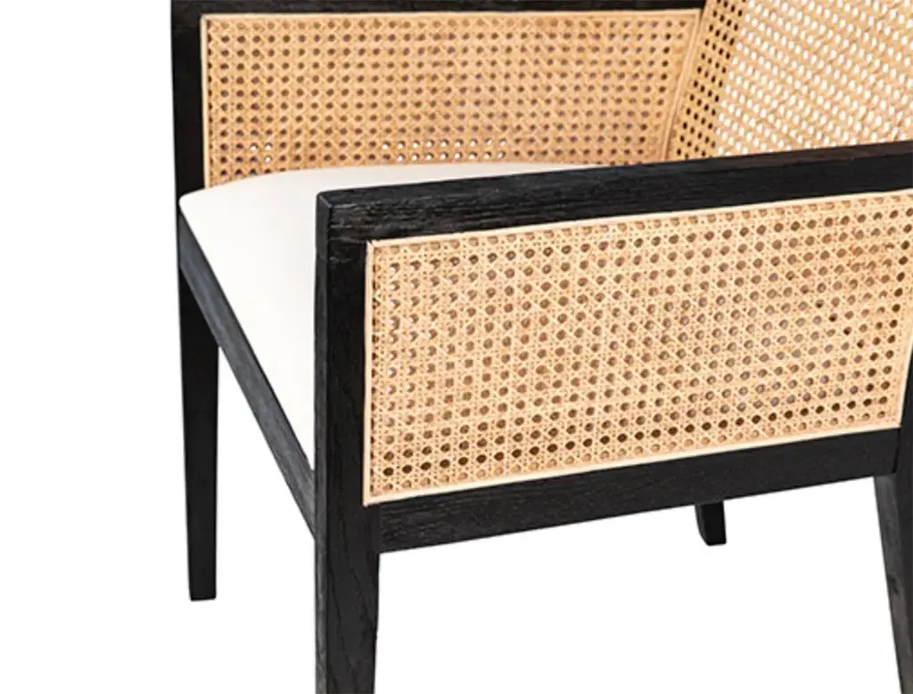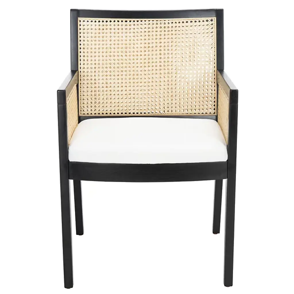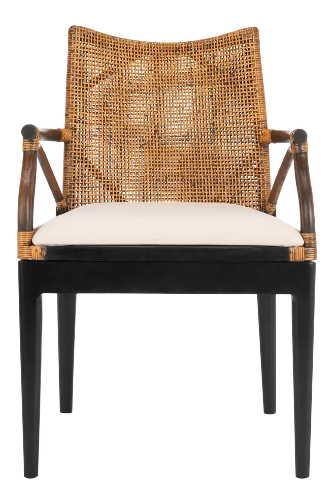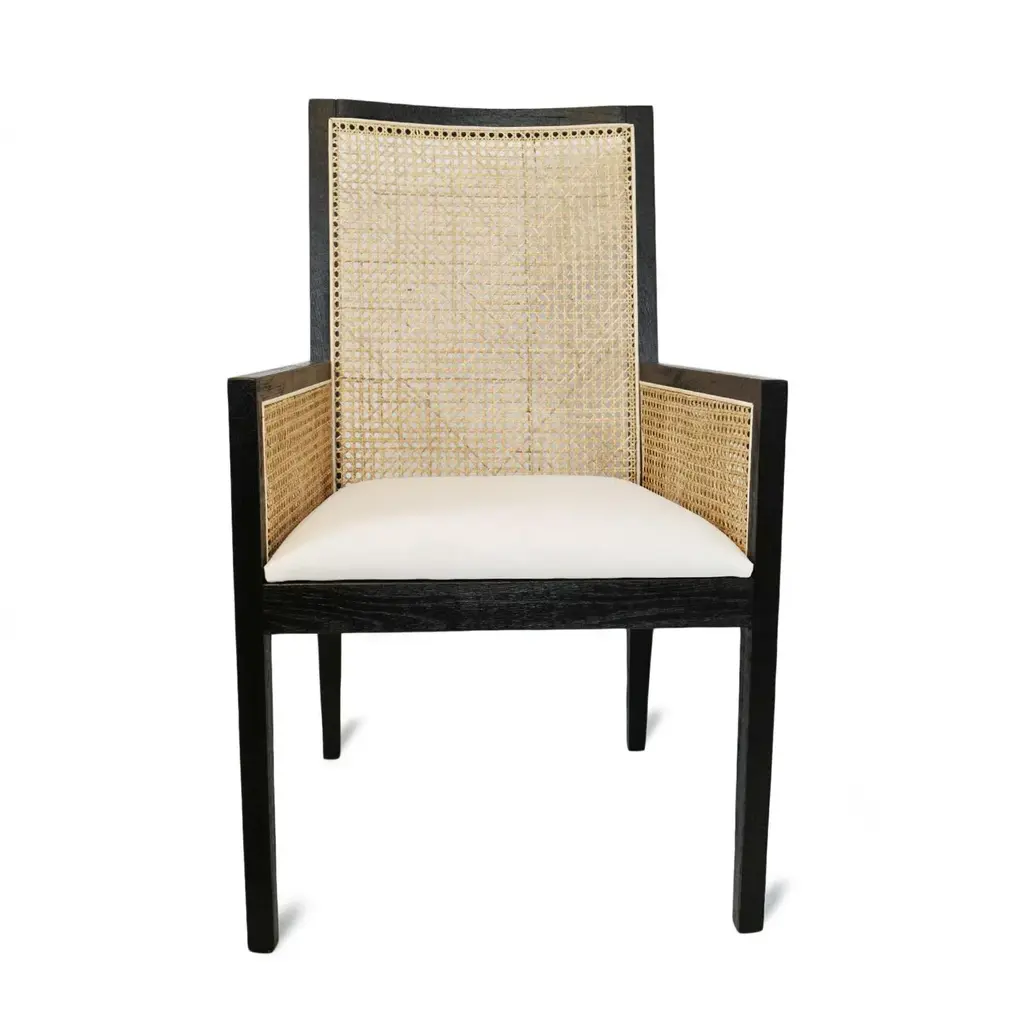 Classic colonial plantation style modern black oak wood frame dining arm chair with traditional natural cane panel back and sides. Stone washed white cotton upholstered seat. Seat height is 20". Arm height is 25.25". This chair weighs approx. 20 lbs.