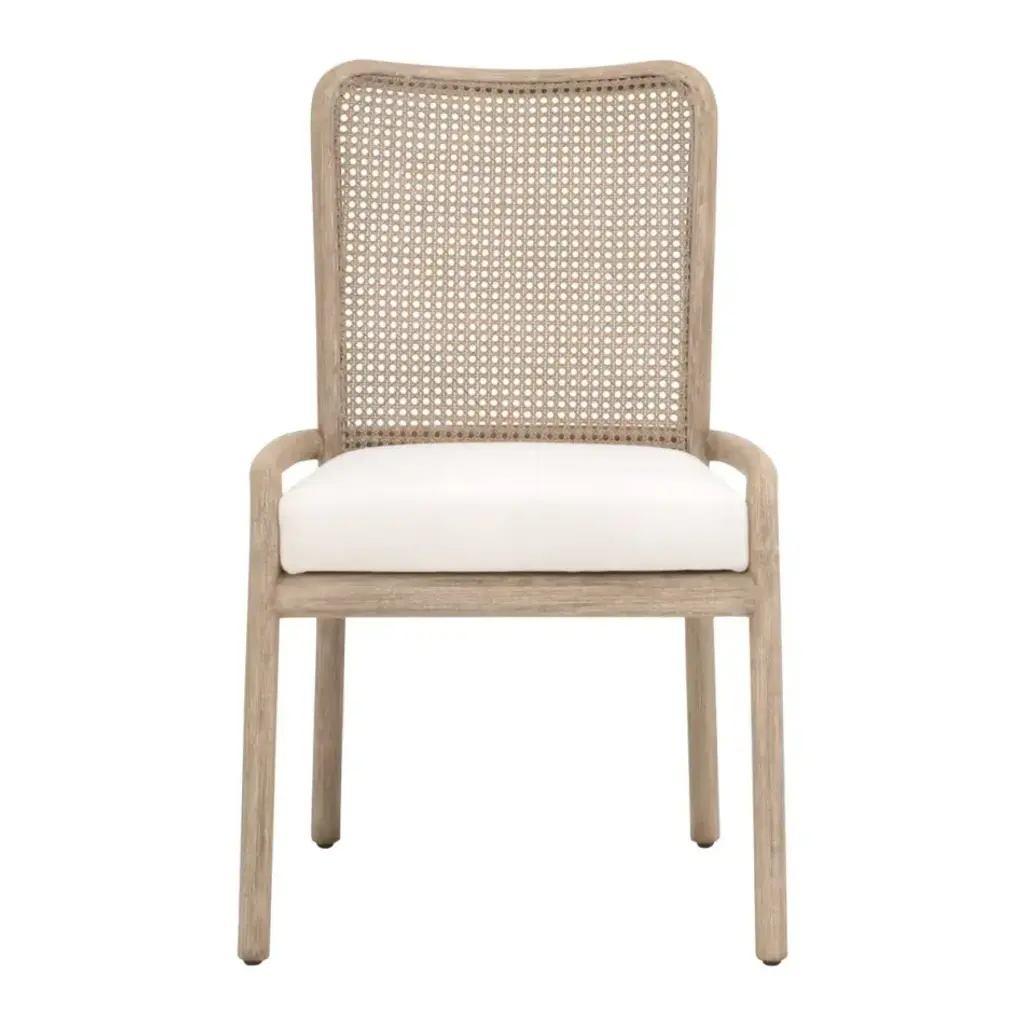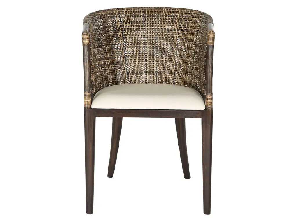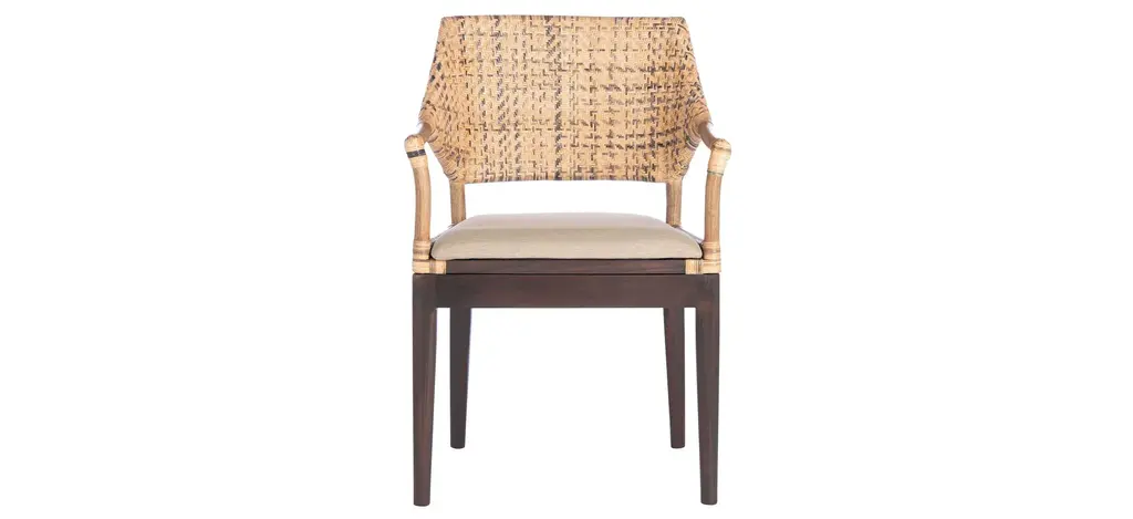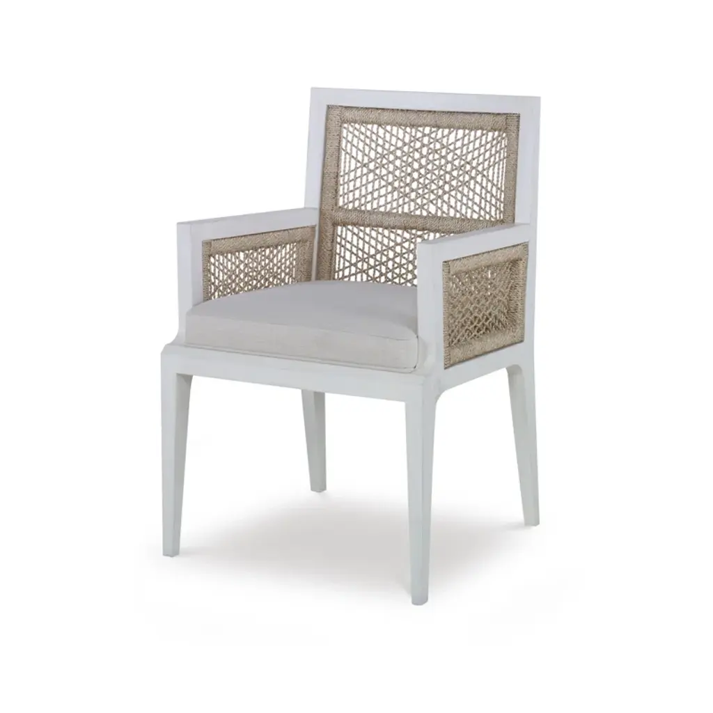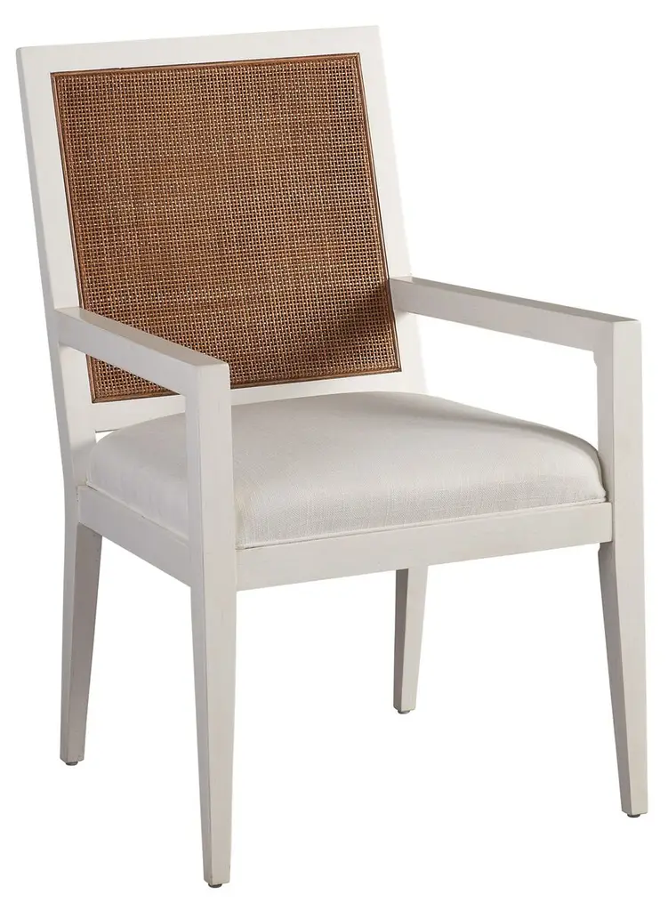Classic colonial plantation style modern black oak wood frame dining arm chair with traditional natural cane panel back and sides. Stone washed white cotton upholstered seat. Seat height is 20". Arm height is 25.25". This chair weighs approx. 20 lbs.