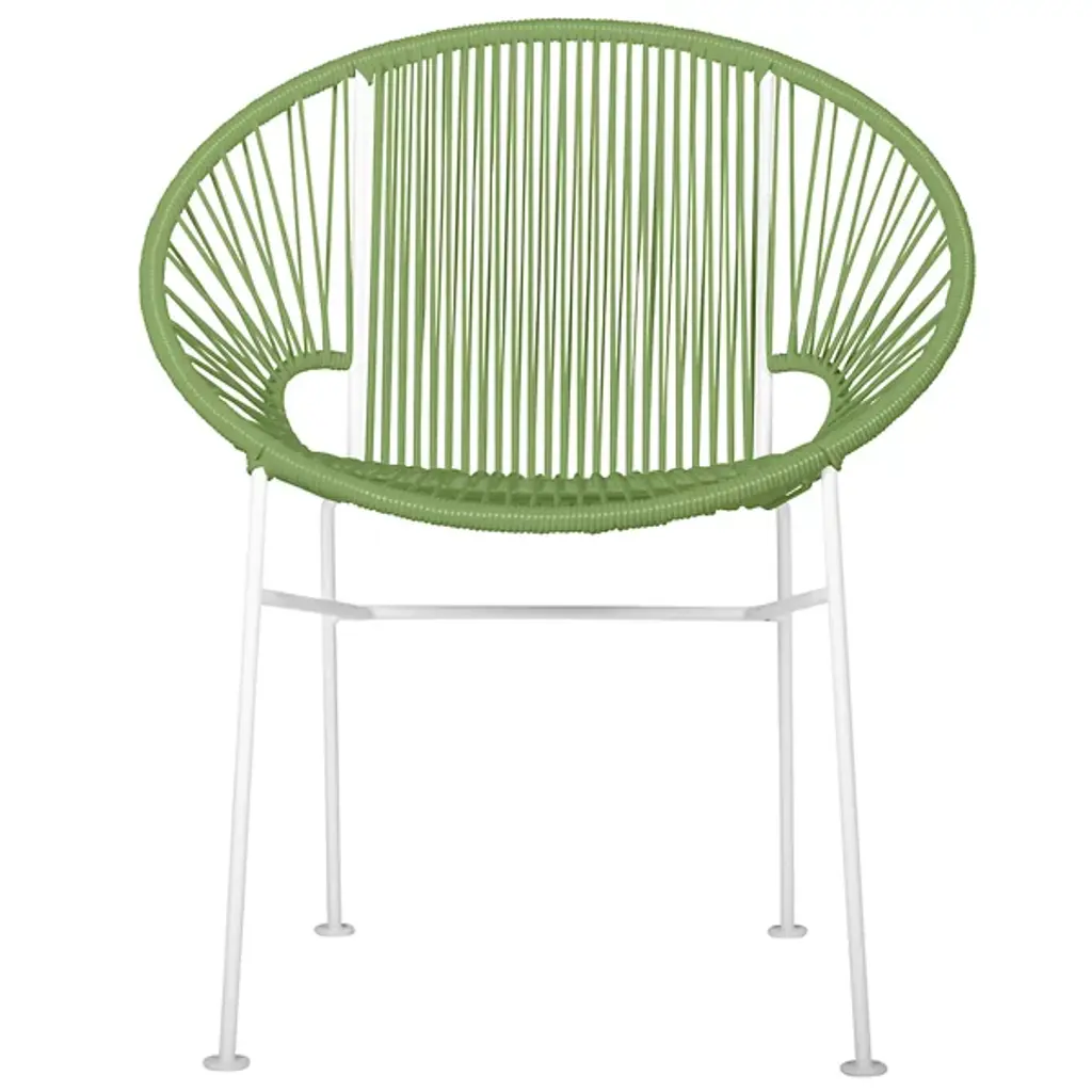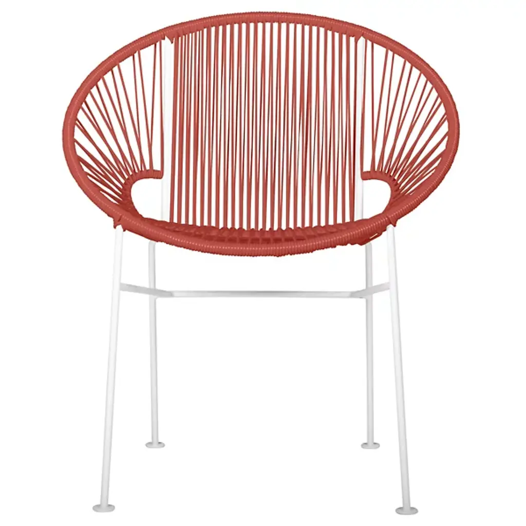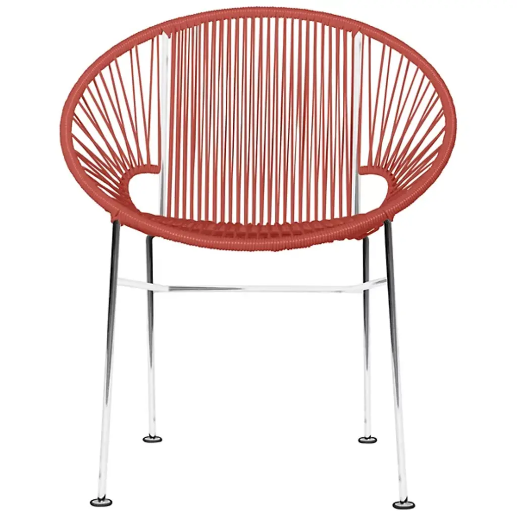 Bring the airy comfort of Innit Designs lounge chairs to outdoor dining with the Innit Designs Concha Outdoor Chair. The unique pattern and rounded shape of the hand-woven vinyl seat is inspired by the symmetrical markings and shape of seashells. This durable, colorful seat sits atop a simple yet strong galvanized steel base.