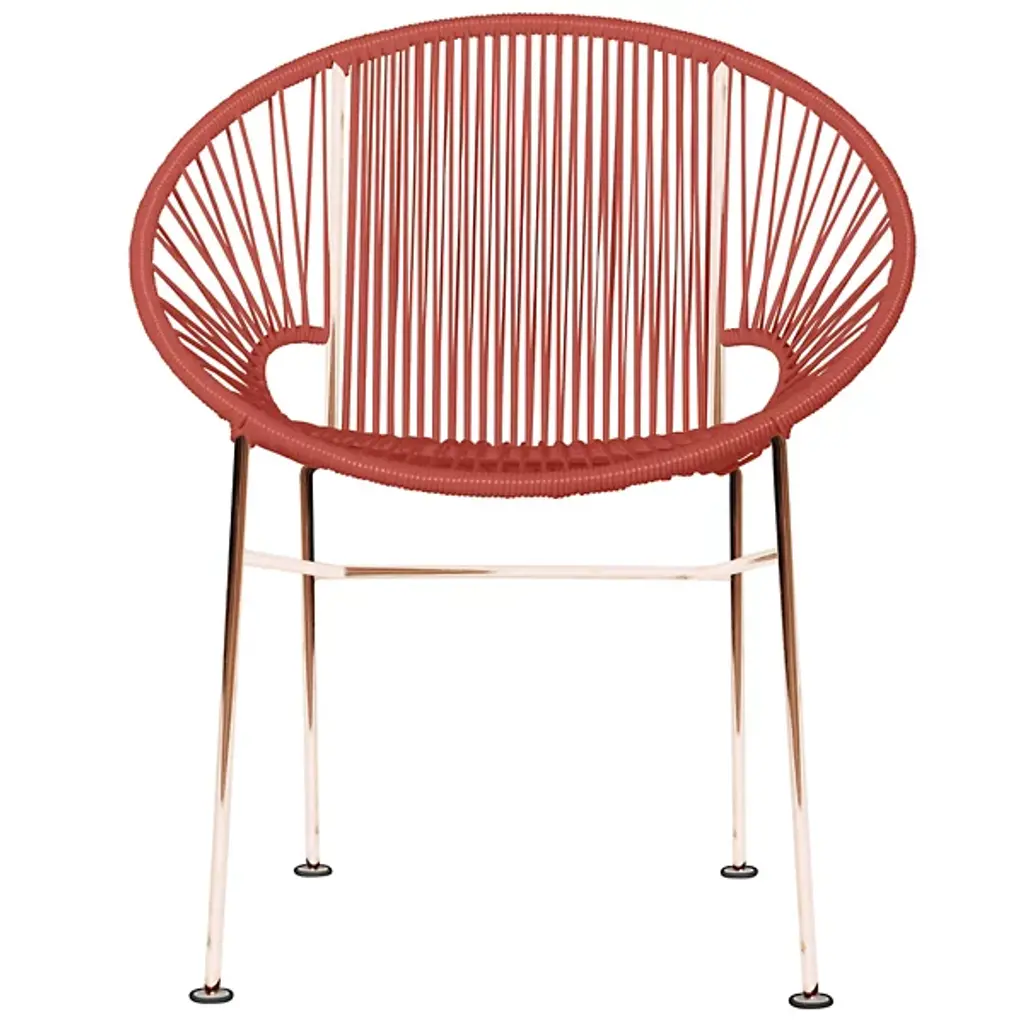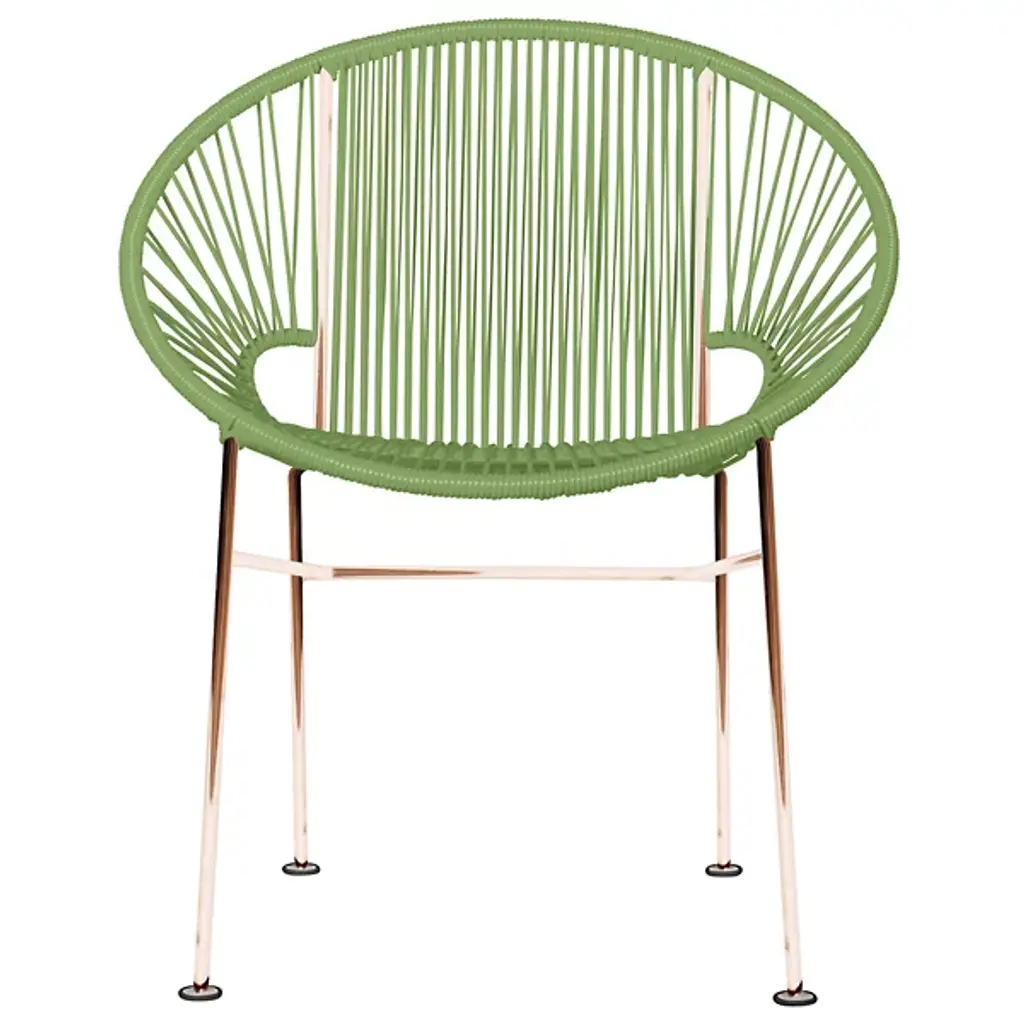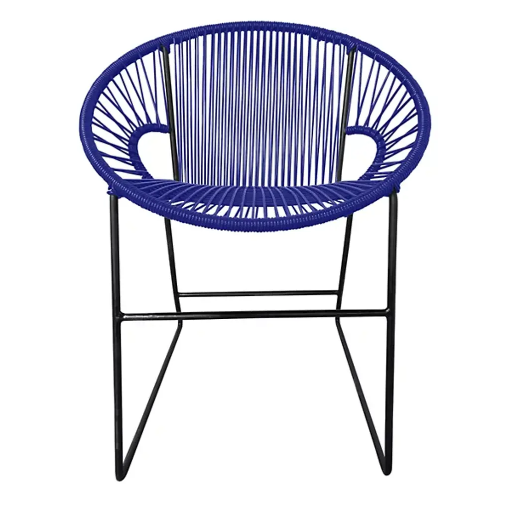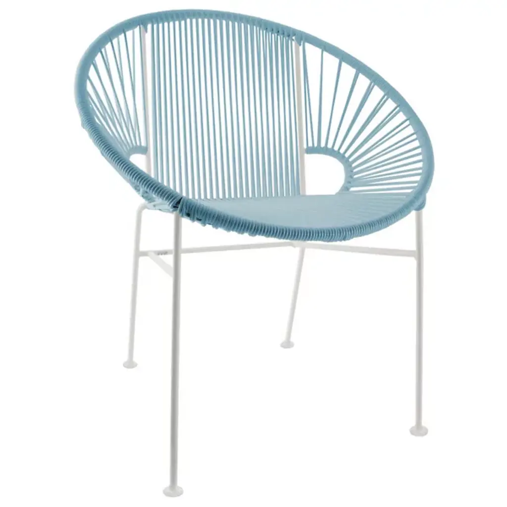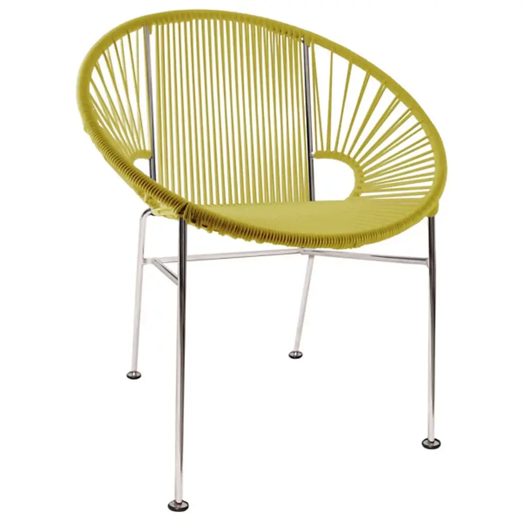 Bring the airy comfort of Innit Designs lounge chairs to outdoor dining with the Innit Designs Concha Outdoor Chair. The unique pattern and rounded shape of the hand-woven vinyl seat is inspired by the symmetrical markings and shape of seashells. This durable, colorful seat sits atop a simple yet strong galvanized steel base.