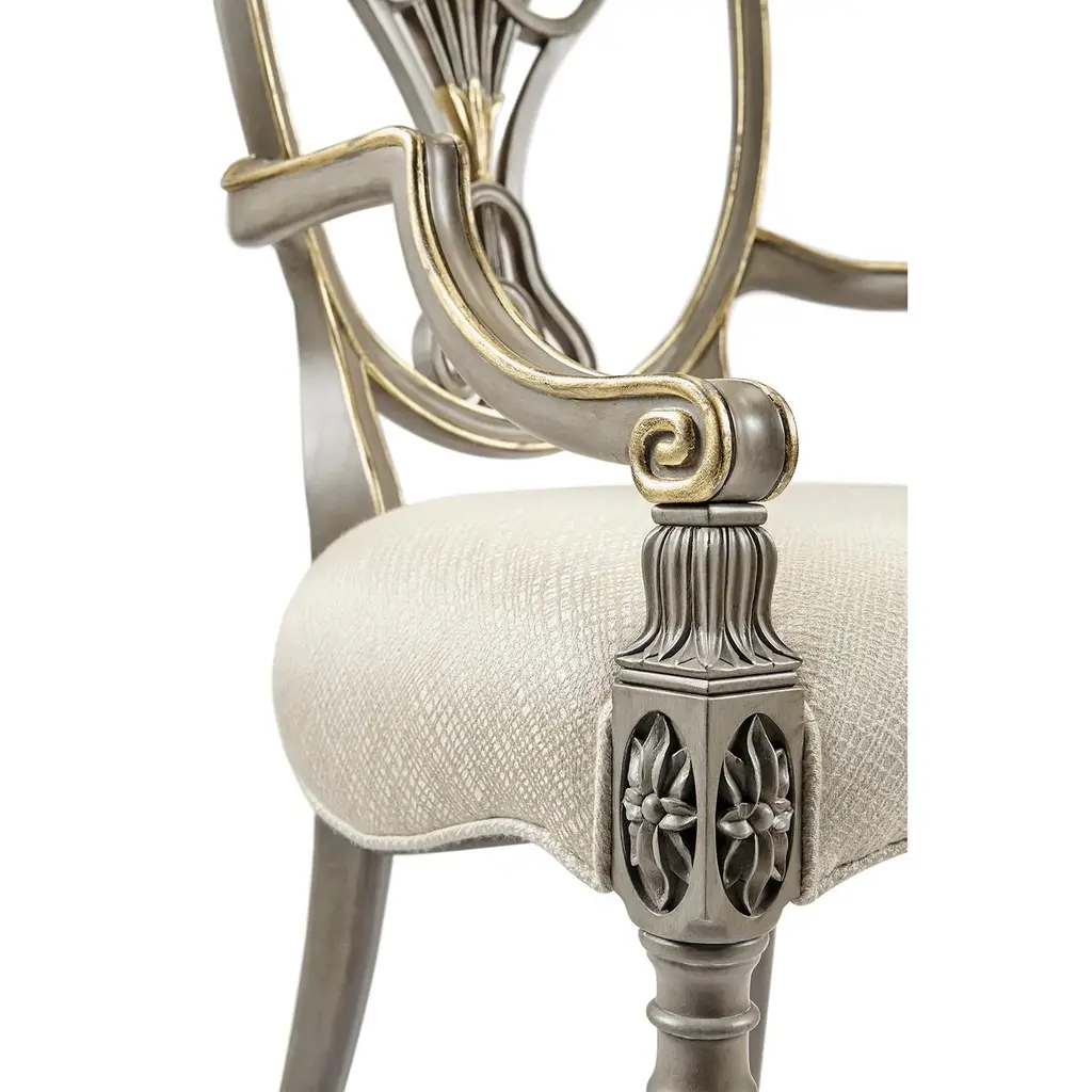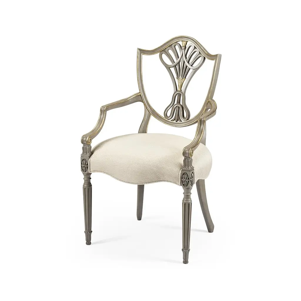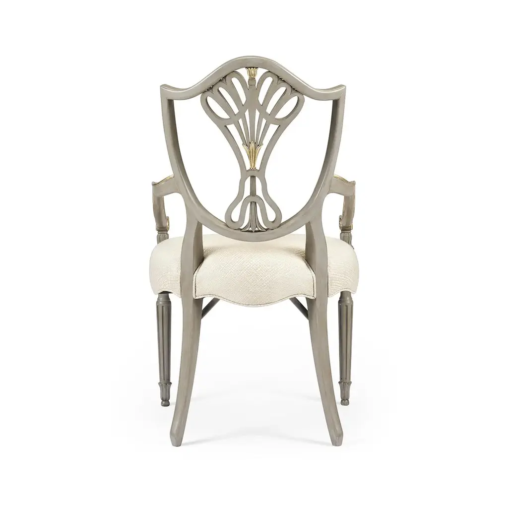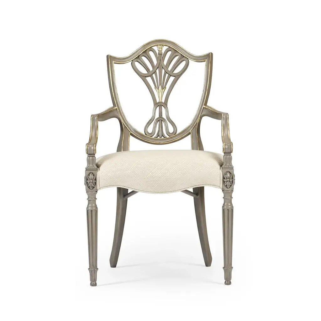 Featuring a gracefully painted shield back in a sophisticated Buckingham grey finish, accented with gilded details, this chair brings a touch of historic charm into any dining space. The intricately carved frame is both a nod to traditional artistry and a statement of luxury, perfect for those who appreciate the finer things in life. The seat, upholstered in a neutral performance fabric, offers both durability and comfort, making it ideal for elegant gatherings and everyday dining alike. Its neutral tone effortlessly blends with any decor, while the finely turned legs add a classic touch to its silhouette. Whether used as a statement piece or as part of a set, this side chair enhances any interior with grace and sophistication. Dimensions: 22" W x 23.625" D x 38" Seat: 19.88" Arm: 25.625"