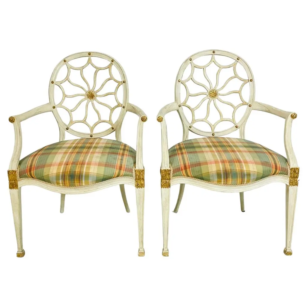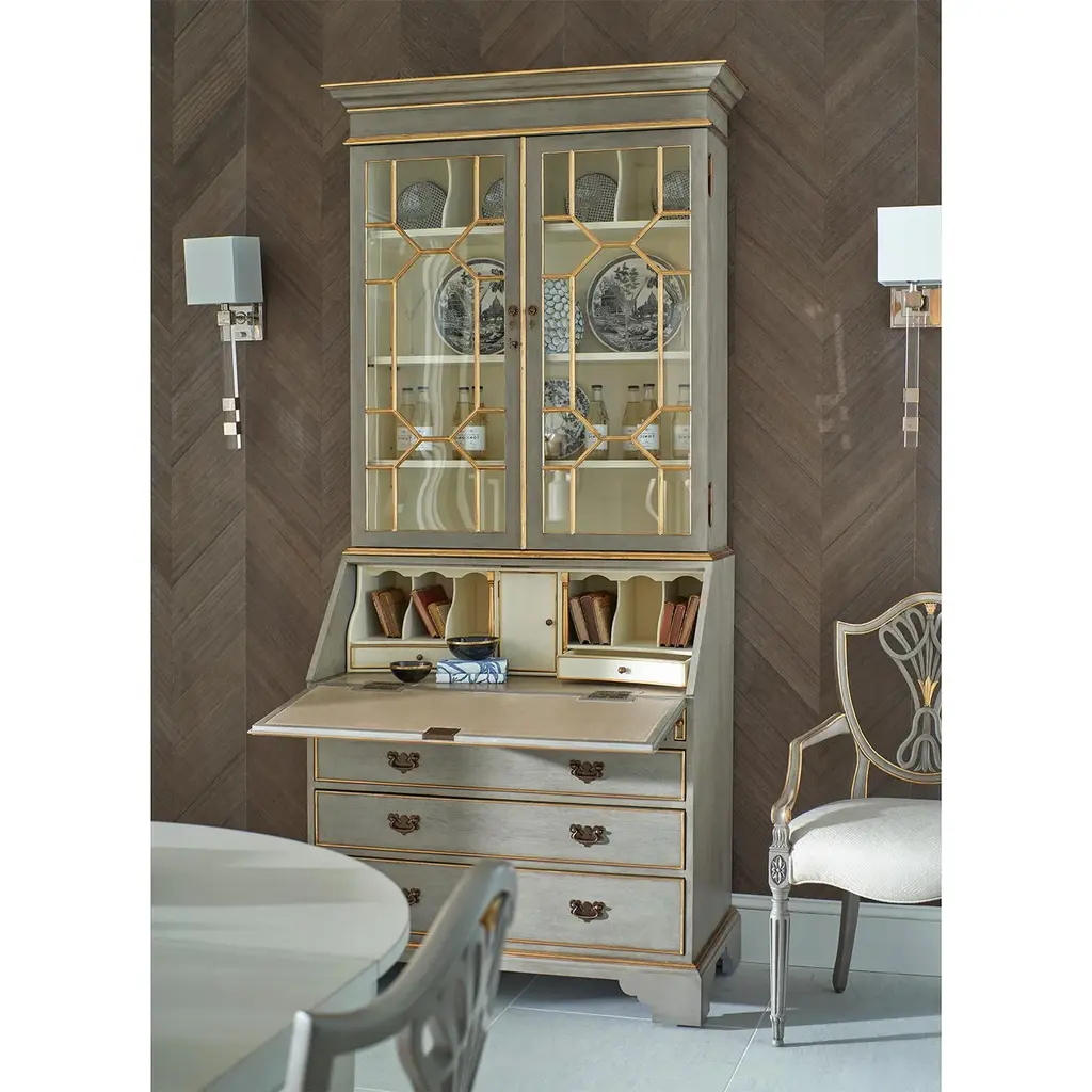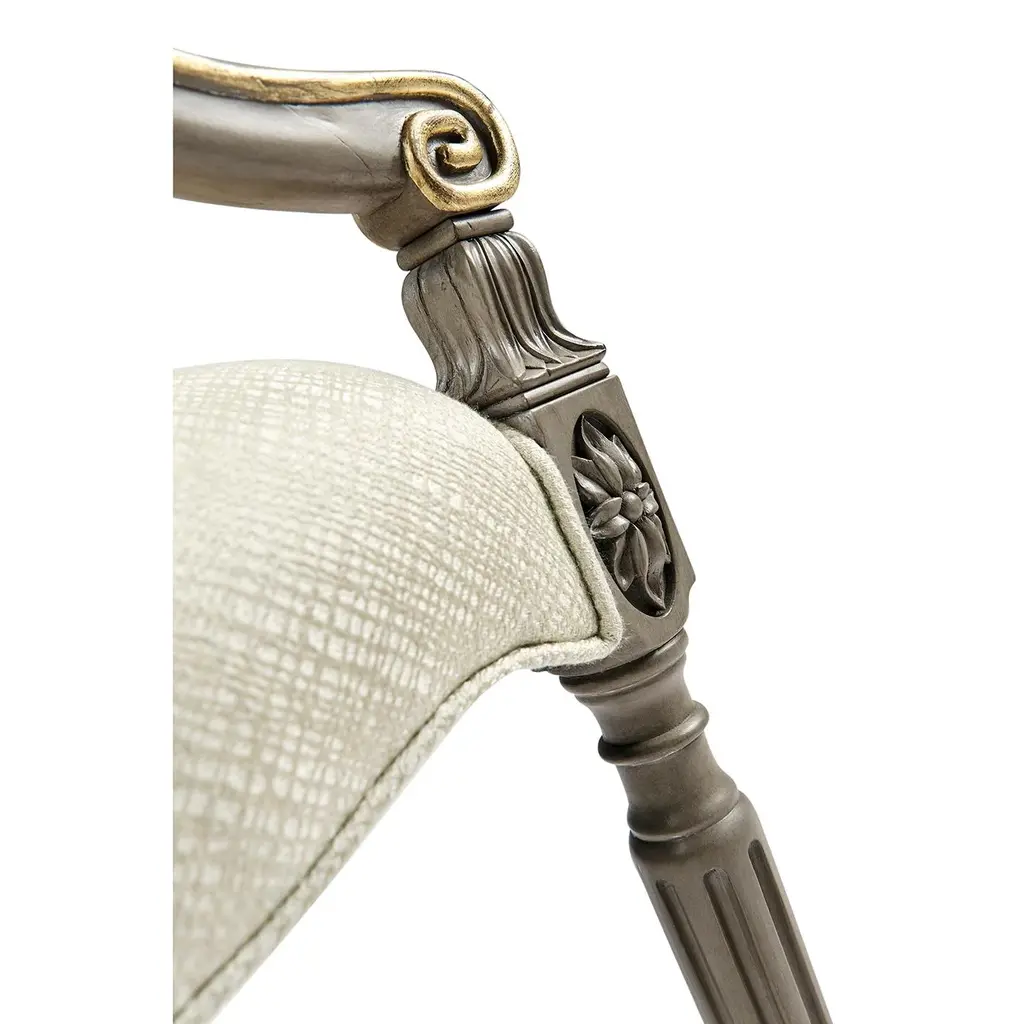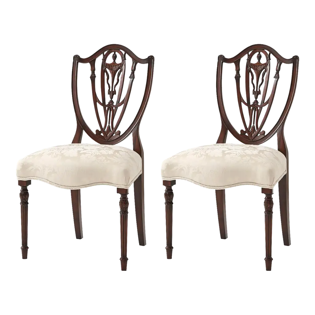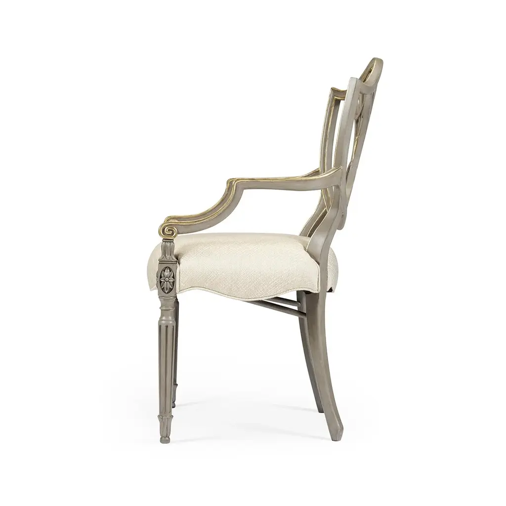 Featuring a gracefully painted shield back in a sophisticated Buckingham grey finish, accented with gilded details, this chair brings a touch of historic charm into any dining space. The intricately carved frame is both a nod to traditional artistry and a statement of luxury, perfect for those who appreciate the finer things in life. The seat, upholstered in a neutral performance fabric, offers both durability and comfort, making it ideal for elegant gatherings and everyday dining alike. Its neutral tone effortlessly blends with any decor, while the finely turned legs add a classic touch to its silhouette. Whether used as a statement piece or as part of a set, this side chair enhances any interior with grace and sophistication. Dimensions: 22" W x 23.625" D x 38" Seat: 19.88" Arm: 25.625"