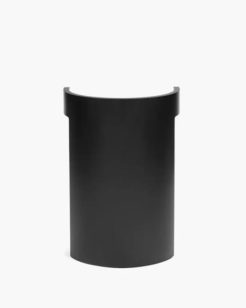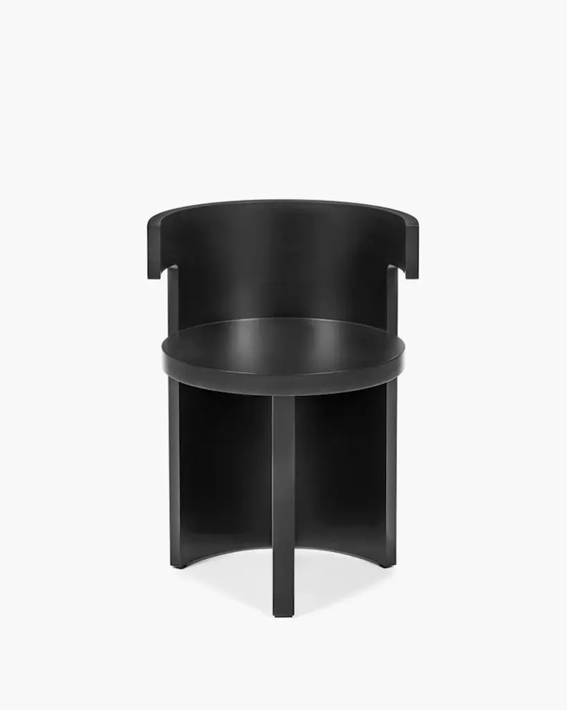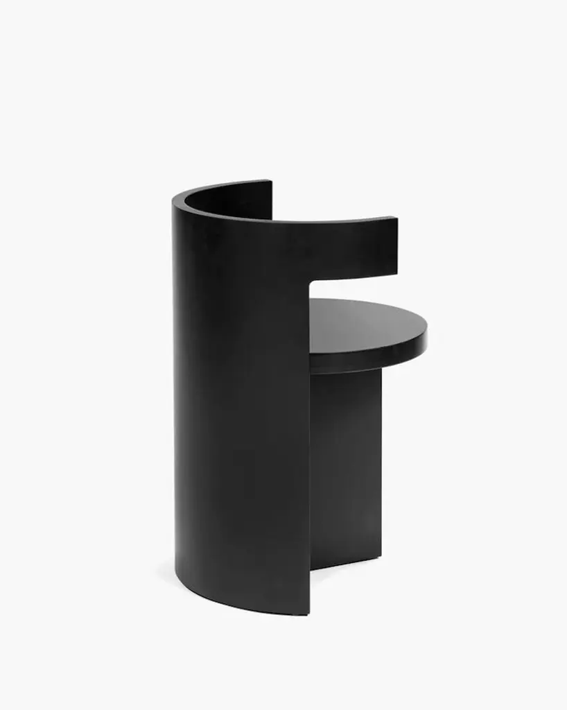 Sculptural Chair 'Boho' designed by Ann Demeulemeester for Serax. Solid beech woodStain: BlackThe 'Boho' chair by Ann Demeulemeester redefines modern design with its bold, sculptural aesthetic. Featuring a curved backrest seamlessly integrated into its minimalist frame, this chair exudes a sense of balance and harmony. Its circular seat and solid structure make it both a functional piece and a statement of refined artistry.Crafted with high-quality materials and finished in sleek black, the 'Boho' chair is ideal for contemporary interiors. Whether used as a dining chair, occasional seating, or a standalone accent piece, it brings an air of sophistication to any space.The solid form of the sculptural Boho chair offers a counterpoint to the light elegance of the Elé chair, with a substantial yet graceful presence. Occupying the same dimensional footprint as the Elé, the geometry of a cylinder is sliced to create a round seat, with a rounded back that rises to 69 centimetres and extends out to form two small arms along the top edge. The seat is supported by a single plane at a 45-degree angle to the back, creating a vertical rhythm that contrasts with the horizontal circles of the seat and back.