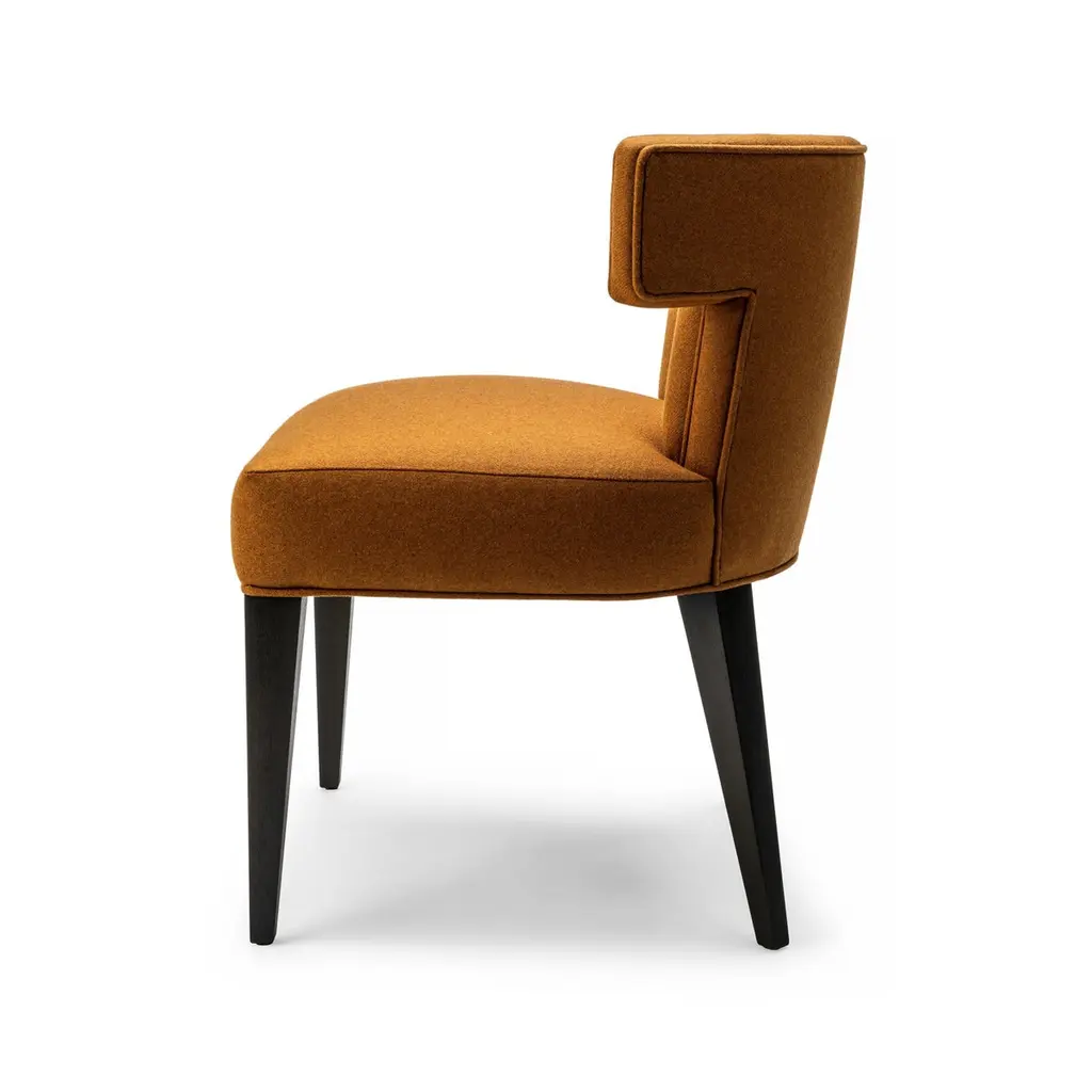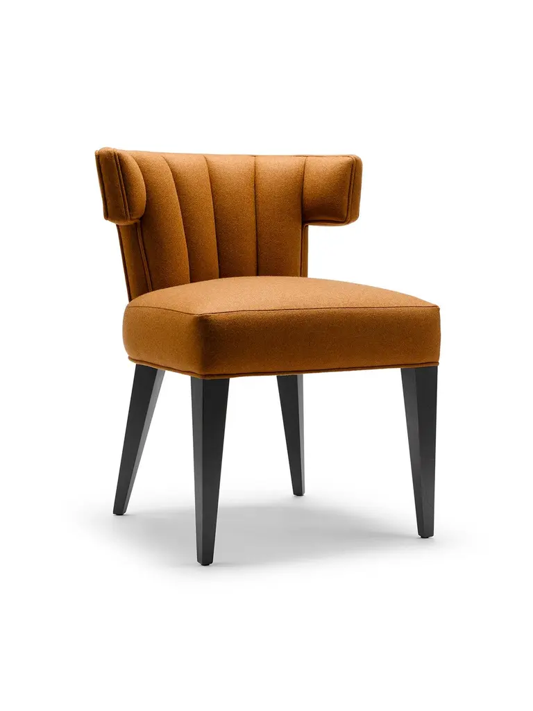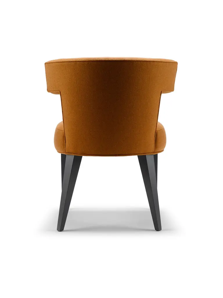 The Isabella dining chair is one of our signature chairs, as highly sought after today as when it was first introduced. This design has been re-imagined from its first conception, and is now even more luxurious. Both the seat and back are fully upholstered and supported by our solid wood frames. The back is curved and individually fluted to cradle and support the user. The Isabella Dining Chair is the perfect choice for intimate dining, elegant entertaining or as a statement study chair. The Isabella Dining Chair is shown here upholstered in Melton Wool with legs in black flat waxed walnut.Construction: solid walnut legs, with a hardwood and birch plywood frame, featuring a pocket sprung seat and an individually fluted back.The Isabella dining chair has also achieved British Standard EN 16139: 2013 Test Level 2. Each Stuart Scott piece is built by hand in our workshop in Wiltshire, England. Nothing is mass-produced. This ensures complete attention to detail, structural integrity and sheer build quality. We never compromise. When we finish each piece, it is signed and numbered: a unique handmade masterpiece.
