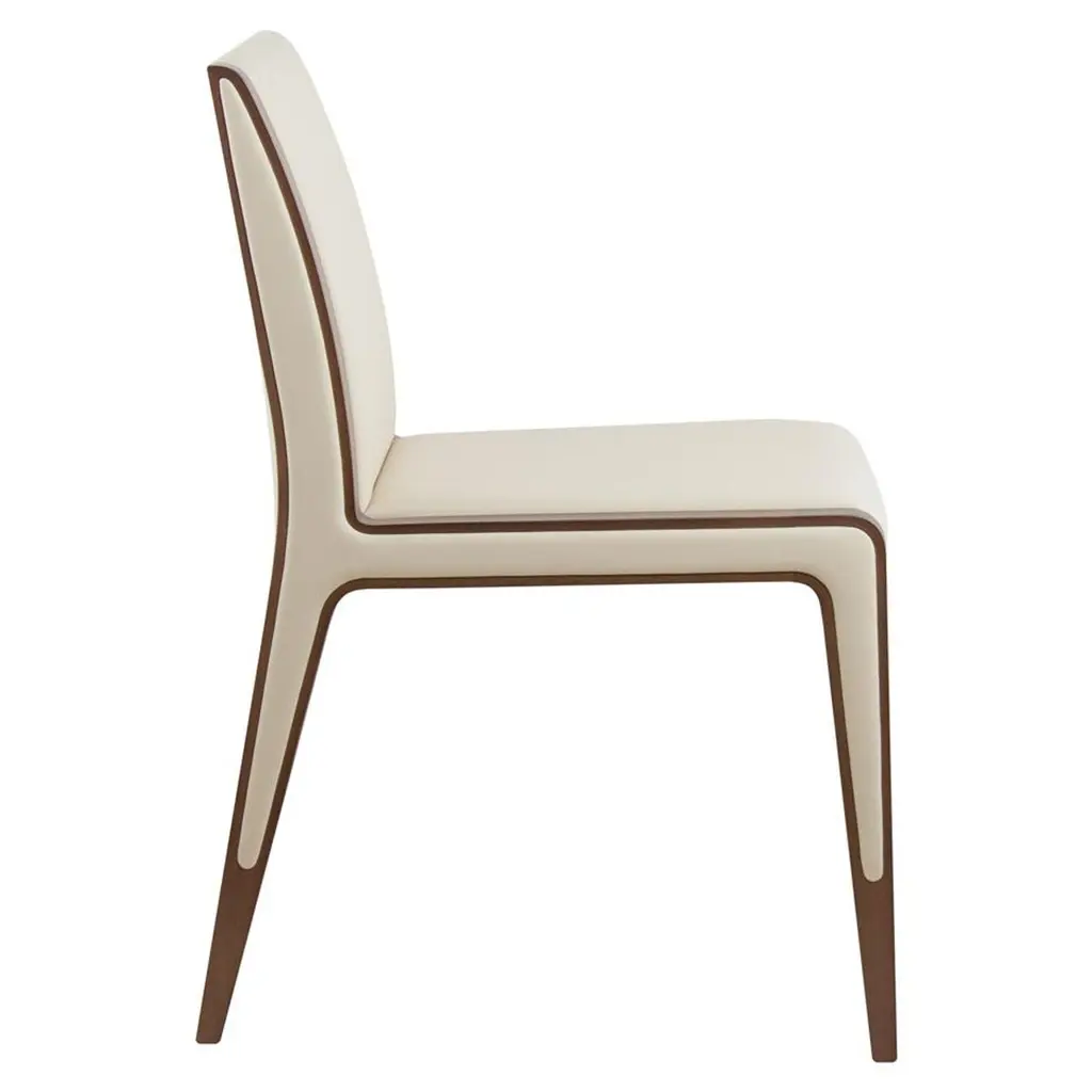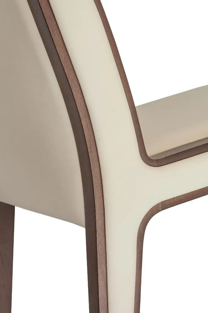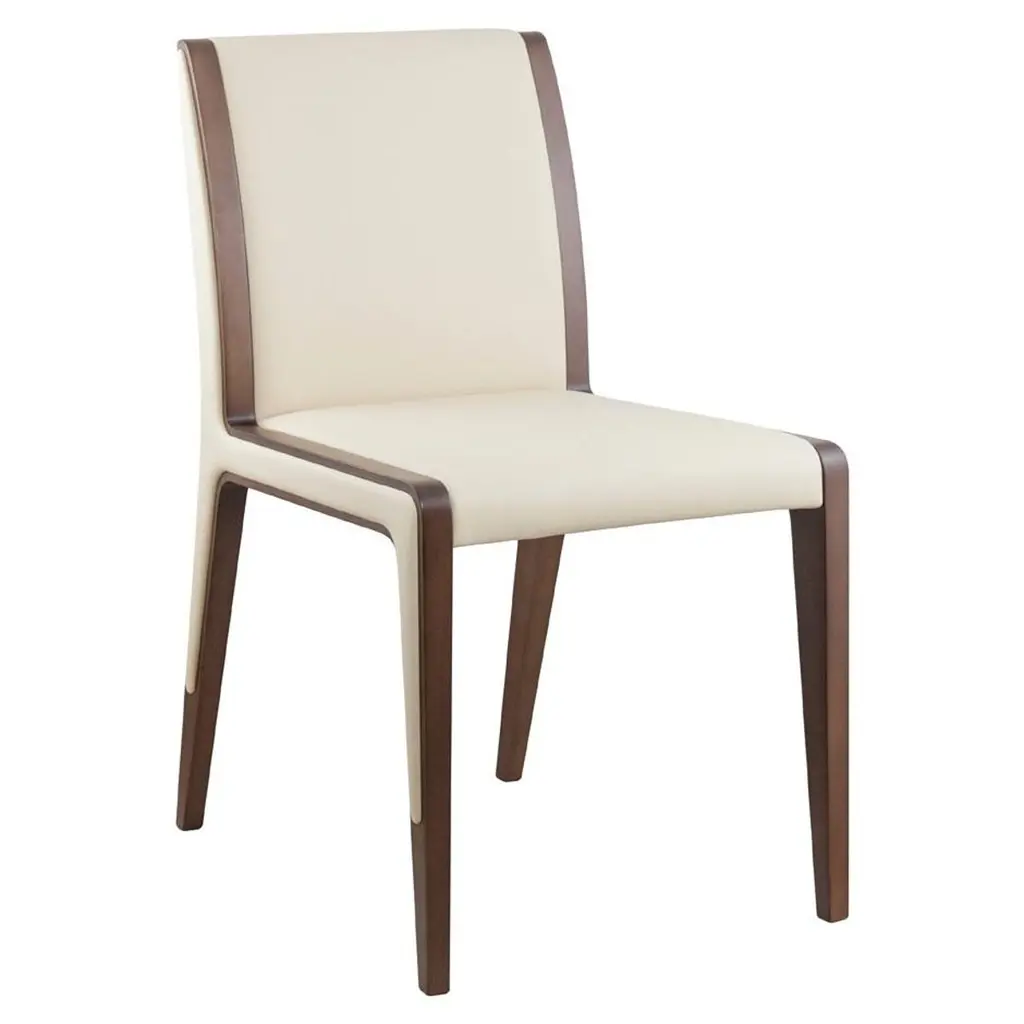Modern dining chairs upholstered in beige faux leather. Crafted of solid wood frame stained in walnut finish. Slight reclined back help you stay comfortable and supported during long dinners.This chair is heavily constructed and suitable for contract use.100% European product.Available in COM upon request.Contact us to enquire about COM/COL production, requirements and material shipping instructions.Please contact us if you have any questions about customization and pricing. We will be glad to check with the factory’s technical team if sizes, finishes, and colors can be customized. We do our best to expedite production and to ship and deliver product within the listed lead time, however current lead times might be longer due to global shipping backlog and delays. These delays are out of our control and cannot be a reason to cancel an order.