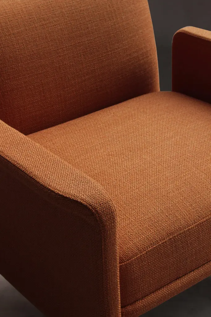 Contemporary Modern Carson Armchair in Oak and Orange Fabric by Collector StudioWith solid and curved wooden armrests, this structure blends with a metal frame that adds character to the design. Alone or in pairs, covered in leather or fabric, is the perfect complement for any sofa.Comfortable and versatile, the Carson armchair is available in different fabrics to suit different contexts, style and personality. Ideal for an intimate space but also a perfect seat for a more formal and exclusive ambient. DIMENSIONSW 86 cm 33,8″D 81 cm 31,9″H 70 cm 27,5″PRODUCT FEATURESFully upholstered in fabric.Solid walnut feet.PRODUCT OPTIONSUPHOLSTERY:Available in all COLLECTOR leathers and fabrics.Available in client’s own material.FEET:Available in all COLLECTOR woods.About COLLECTORThe Collector brand was born and Portugal and aims to be part of daily life by fusing furniture to home routines and lifestyles. The company designs its pieces with the intention to embrace diverse styles and to blend in inside any contemporary setting.A wide range of product typologies are designed to work in diverse layers of importance. The result is a clean-lined furnishing collection that can easily be customised to work specifically and according to each unique need, reflecting traditional methods of furniture manufacturing with accurate industrial production methods. Collector strives to achieve the best quality possible by selecting the best materials and by the constant development of production processes and manufacturing partnerships.For more information please visit our website collectorgroup(.)pt