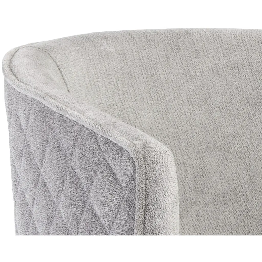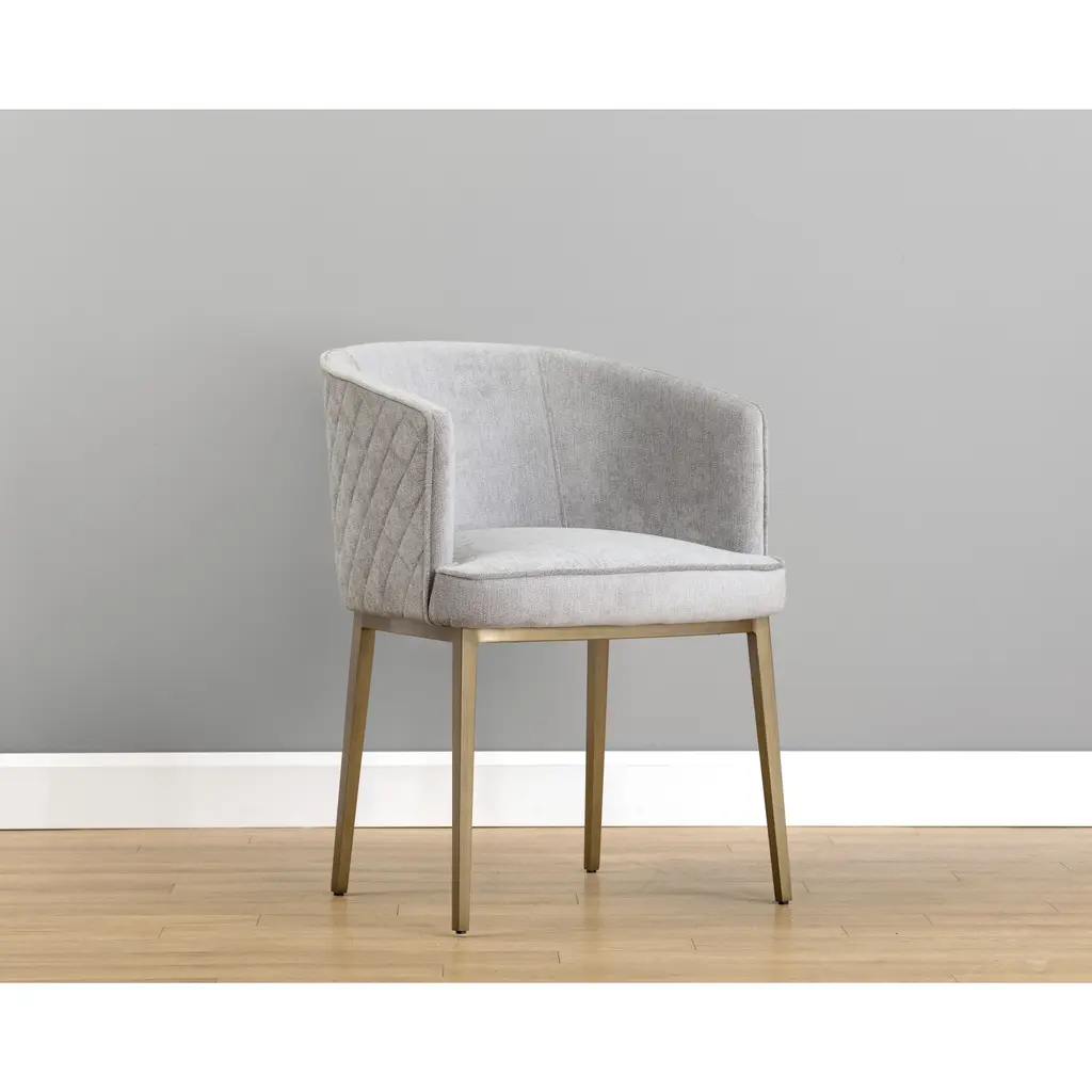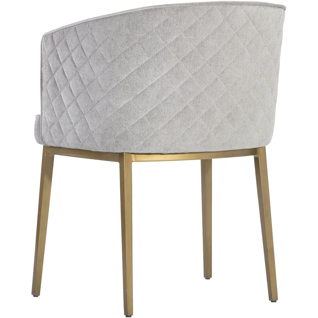 Feminine flair comes to life in this modern dining chair. Stocked in our polo club stone performance fabric with elegant diamond stitching on the exterior seatback. An antique brass steel frame completes the look. Performance fabric is moisture repellent, durable and easy to clean.