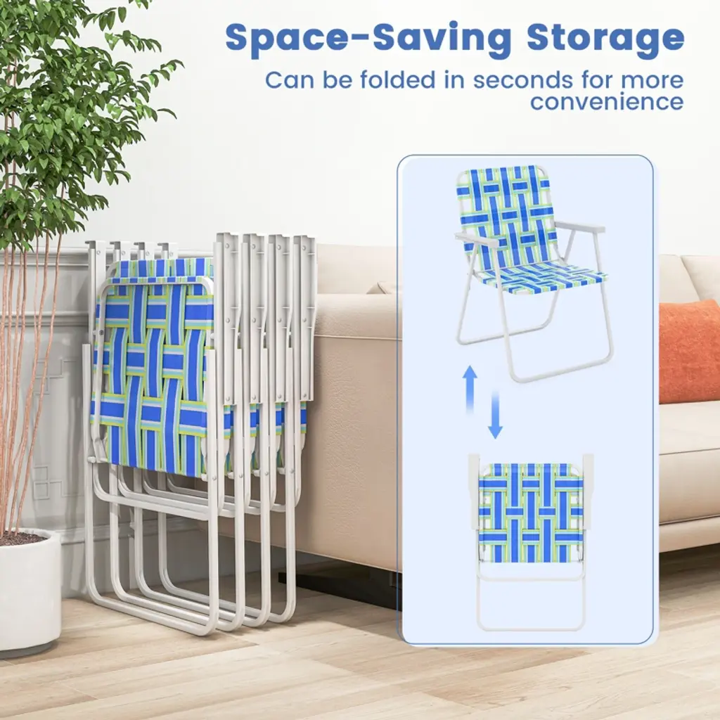 These webbed folding chairs set of 2/4/6 will bring you much comfort and convenience during outdoor relaxing. These chairs boast tear-resistant and weatherproof PE webbed seat and back for breathability and durability. You can fold them in seconds for compact storage. And each chair is at just 7 lbs, making transport a breeze. The robust metal frame supports up to 330 lbs, while the widened armrests ensure a cozy sit-down. These chairs are versatile companions in backyard, porch, camping, beach and so on. Embrace a blend of sturdiness and comfort with these foldable chairs that are ready to accompany you on your adventures.FeaturesPE webbed seat and back for breathability and long-time use Quick-folding design and compact folding size for space-saving storage 7 lbs light weight of each chair for effortless carrying Stable metal frame for 330 lbs strong support Comfortable to sit with wide armrests Suitable for beach, camping, backyard and so on No need to assemble, saving time and effortColor: Blue Material: PE, Metal Overall Dimension: 23" x 22.5" x 31" (L x W x H) Folding Dimension: 29.5" x 22.5" x 3" (L x W x Thickness) Seat Height: 16" Seat Depth: 16" Total Net Weight: 14/28/42 lbs Weight Capacity: 330 lbs Package Includes: 2/4/6 x Patio Folding Chairs 1 x Instruction