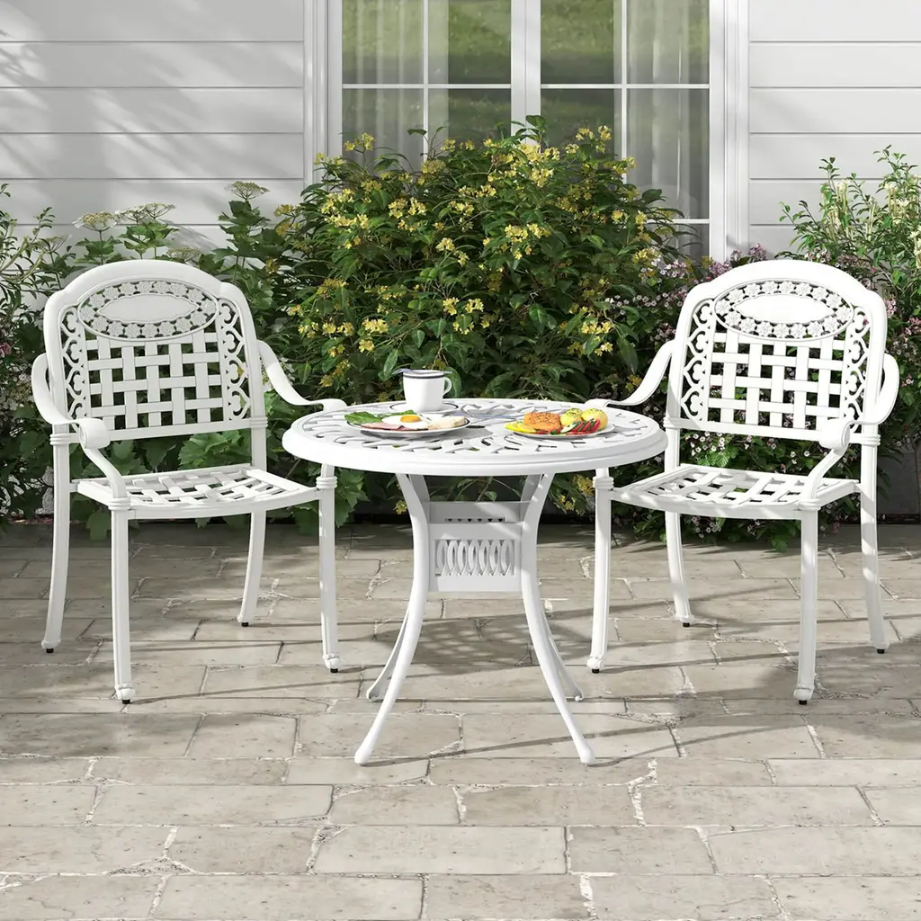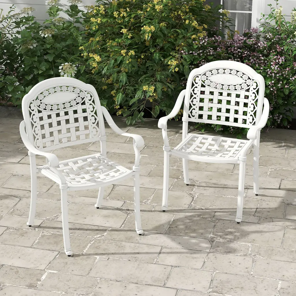 Complement your outdoor dining space with our cast aluminum patio chairs! After simple assembly, these outdoor dining chairs are ready to use. The backrests, armrests and seats are all curved, making you feel more comfortable. What's more, the rustproof and sturdy cast aluminum not only assures you higher durability but shows you 360lbs strong bearing capacity. After using them, just stack these patio armchairs together for space-saving. FeatureAll-weather cast aluminum material for a longer lifespan Come with 360 lbs max load for each dining chair Save your outdoor space when not in use thanks to the stackable design All curved designs for ultimate comfort Keep stable on uneven grounds with adjustable foot pads Suitable for porch, garden, backyard and other outdoor places Convenient to assemble for time-savingSpecificationColor: Bronze/White Material: Cast Aluminum Dimension of Each Chair: 26'' x 24'' x 35'' (L x W x H) Seat Height from the Ground: 16.5'' Net Weight of Each Chair: 13 lbs Weight Capacity of Each Chair: 360 lbs Package Includes: 4 x Chairs 1 x Instruction