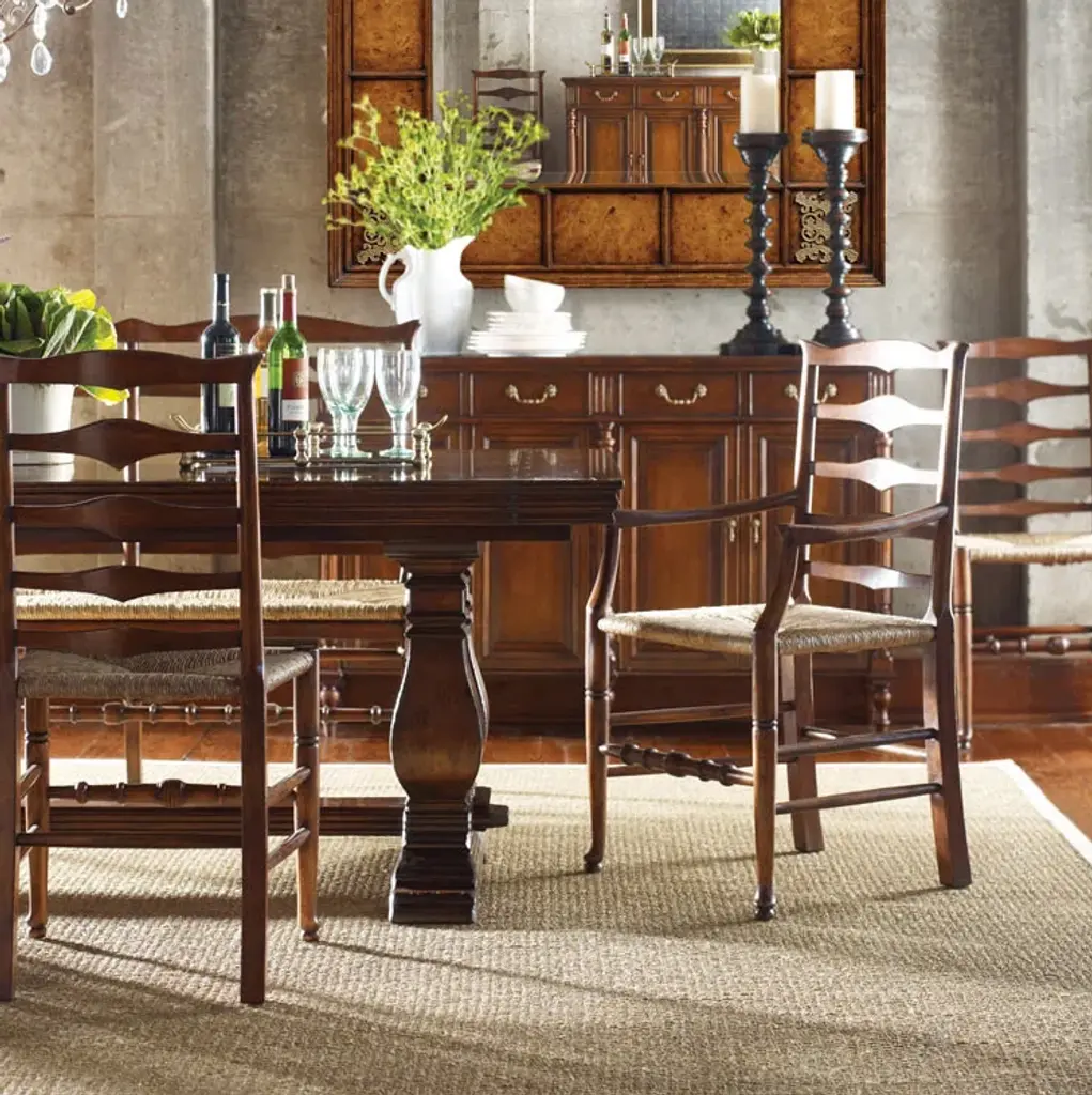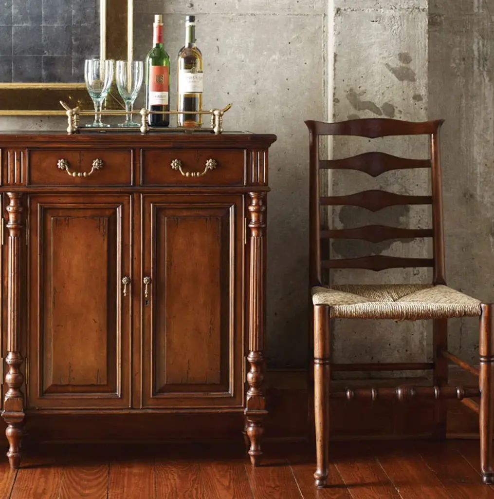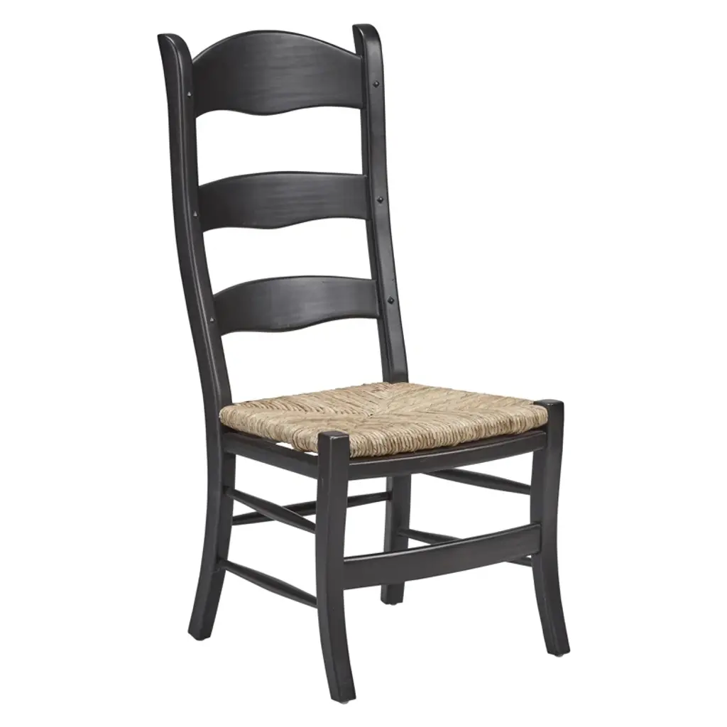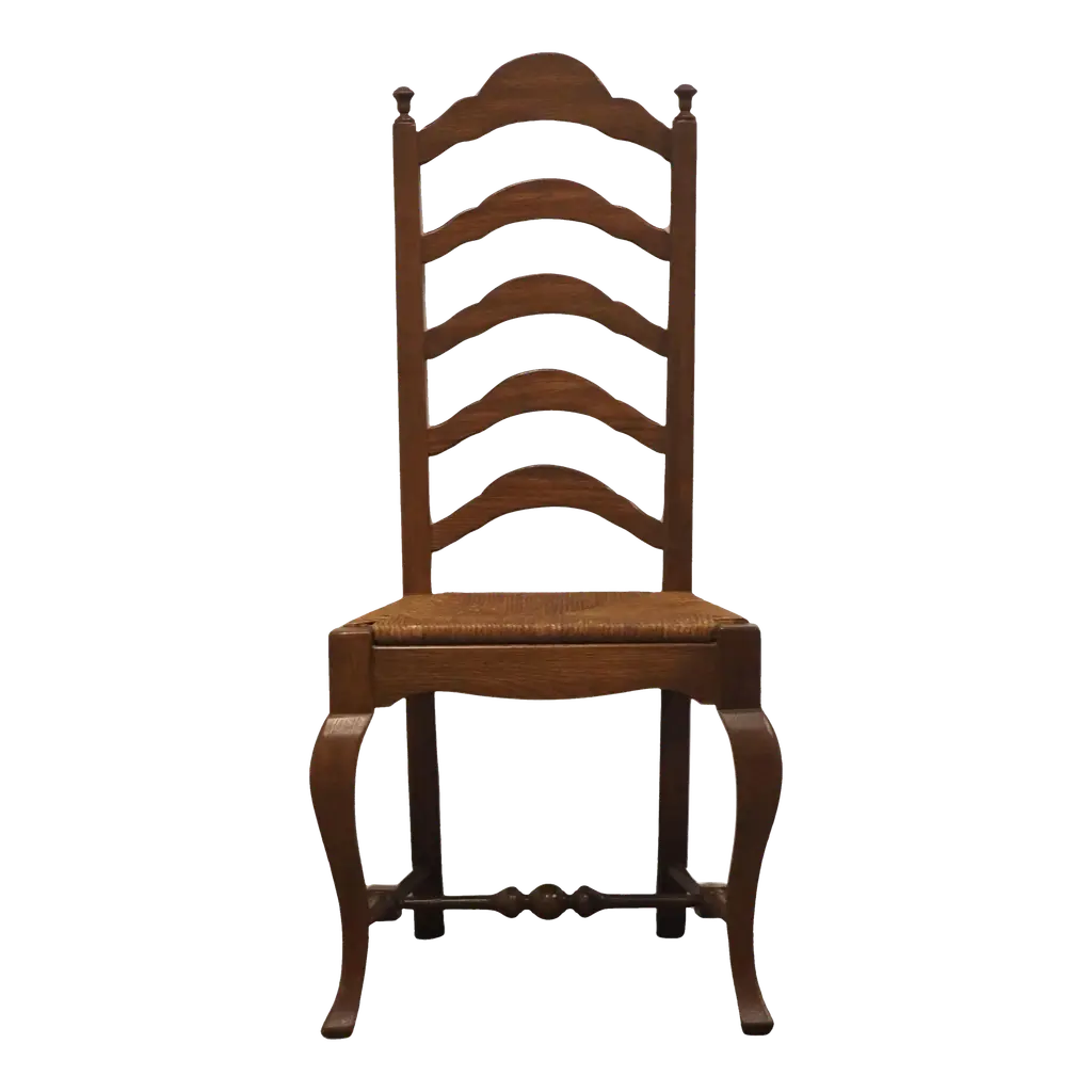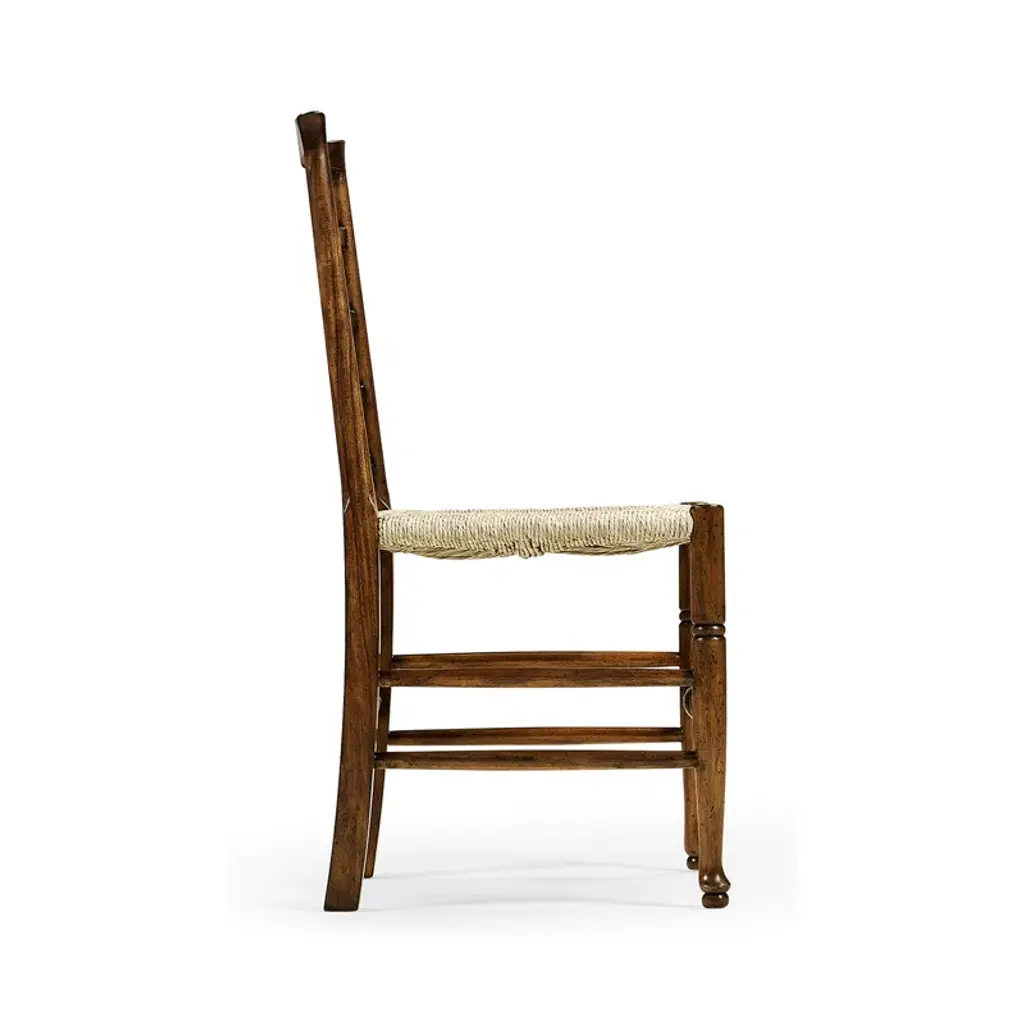 Country style walnut ladder back side hair with shaped back rail and five graduated ladder slats with triangular shaping to center. Turned legs and stretchers beneath.