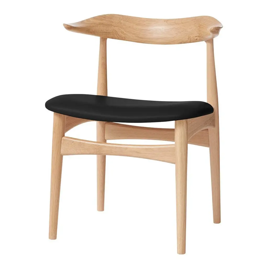 The Cow Horn Chair is an iconic 1960s chair and a sculptural masterpiece for design lovers, created by the internationally renowned Danish furniture designer, Knud Færch. The Cow Horn Chair provides exemplary seating comfort, both occupying and creating a space one of the fundamental ideas of Knud Færch's design. The beautiful mortising and complicated curved lines of the armrests make the Cow Horn Chair a genuine piece of craftsmanship, with a unique elegance and consummate finish. True to the design spirit of the 1960s, the dining chair is available in teak or a connoisseur version, in which the backrest and frame are in various types of wood. The seat is available in upholstery or the highest quality leather. Choose either an exclusive Kvadrat furnishing fabric or leather in carefully selected shades from the Warm Nordic universe. The chair is available in several exclusive types of wood.